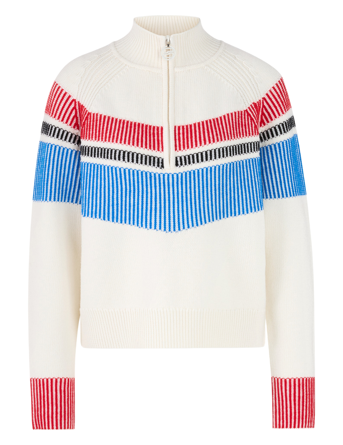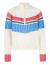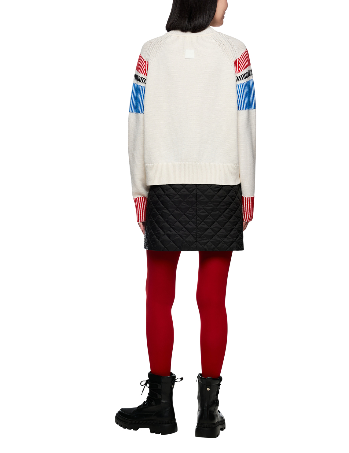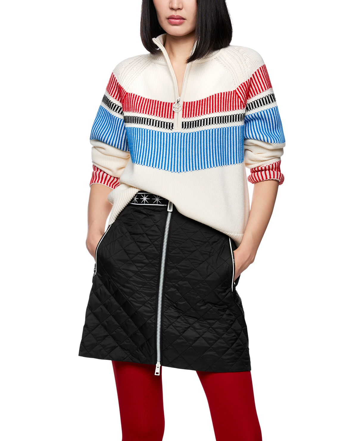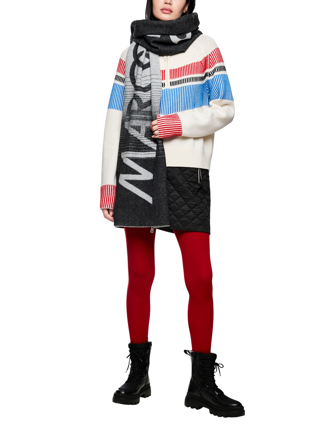 Свитер изготовлен из 100% шерсти. Модель выполнена в прямом крое. Имеет воротник-стойку, застежку на молнии и длинные рукава с манжетами. Декорированный принтом в полоску.