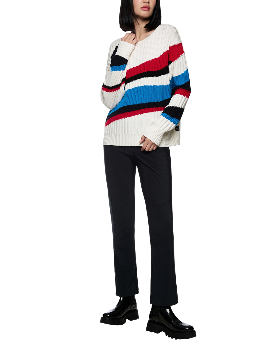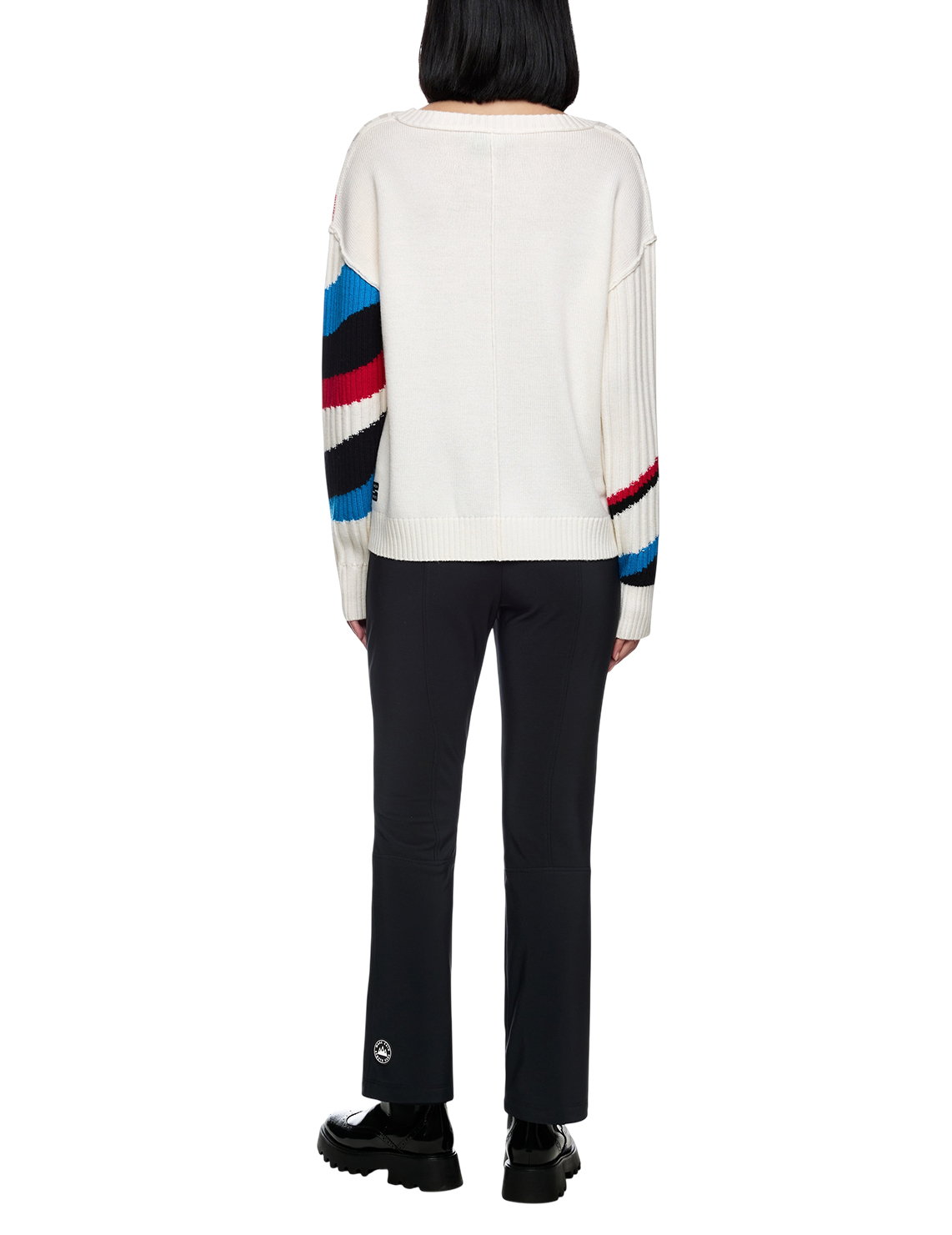 Свитер изготовлен из 100% шерсти высокого качества. Модель выполнена в свободном крое. Имеет круглый вырез горловины, заниженную плечевую линию и длинные рукава с манжетами. Декорирован оригинальным принтом.