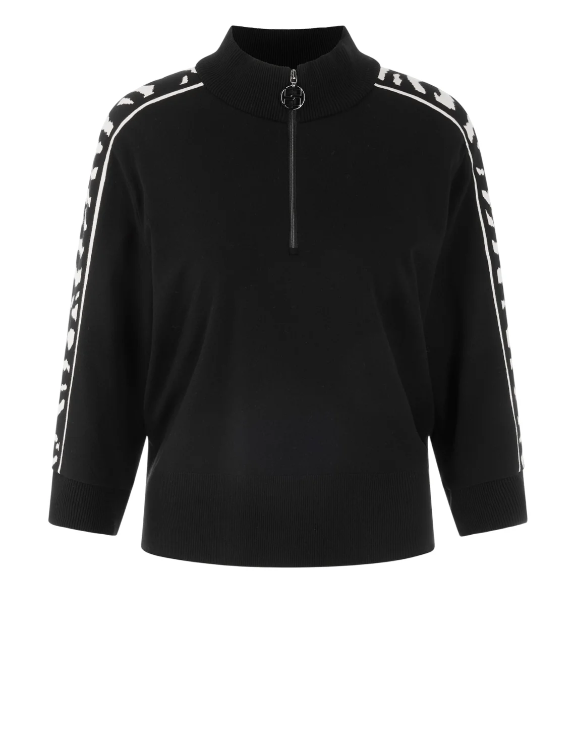 Свитшот изготовлен из вискозы и полиэстера. Модель выполнена в свободном крое. Имеет воротник-стойку, застежку на молнии и рукава длиной 3/4. Декорирован полоской с анималистичным принтом.