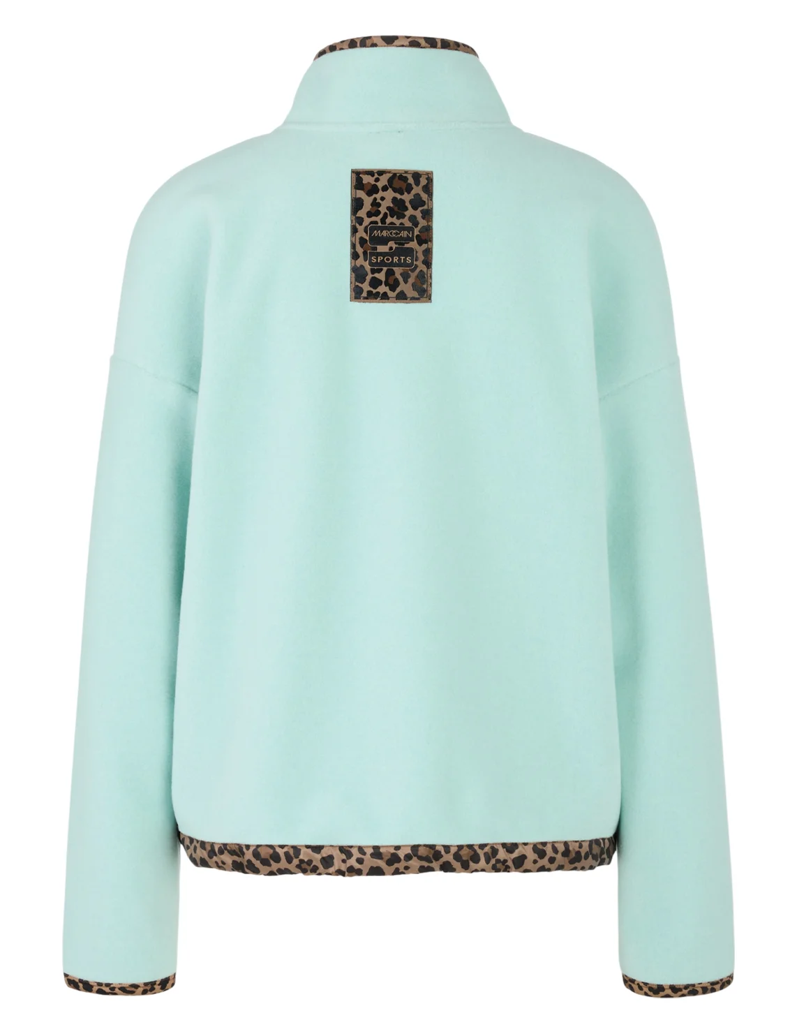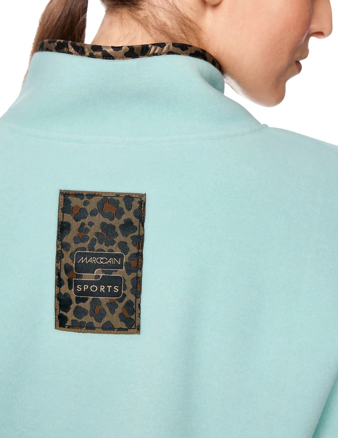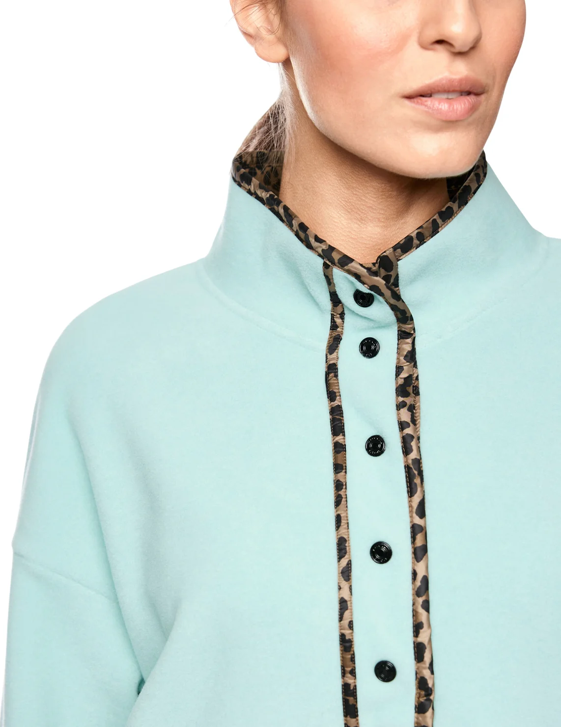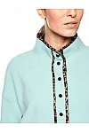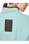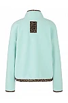 Свитшот изготовлен из полиэстера и хлопка. Модель выполнена в прямом крое. Имеет воротник-стойку, застежку на кнопках, прорезные карманы на молниях и длинные рукава с манжетами. Декорирован анималистичным принтом.