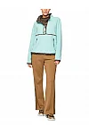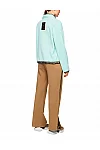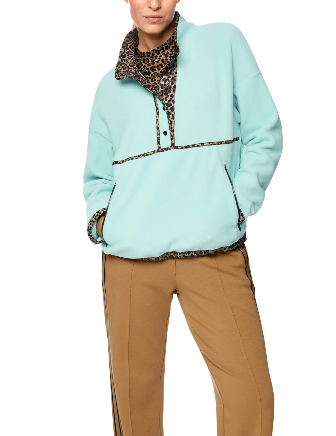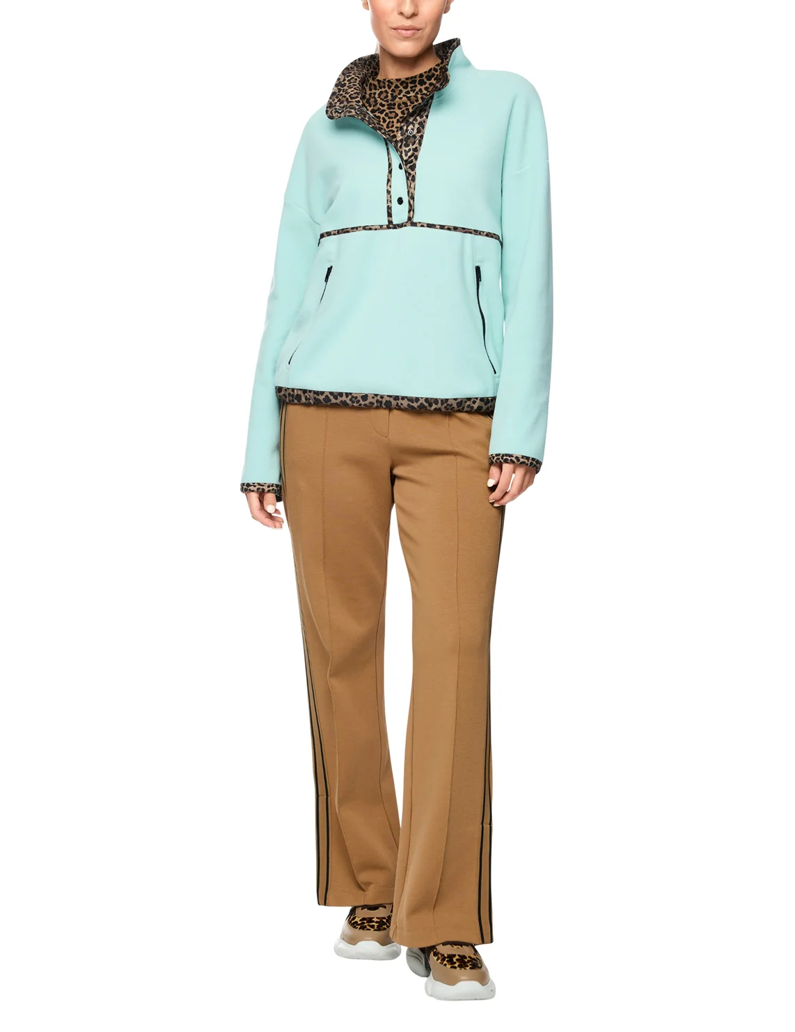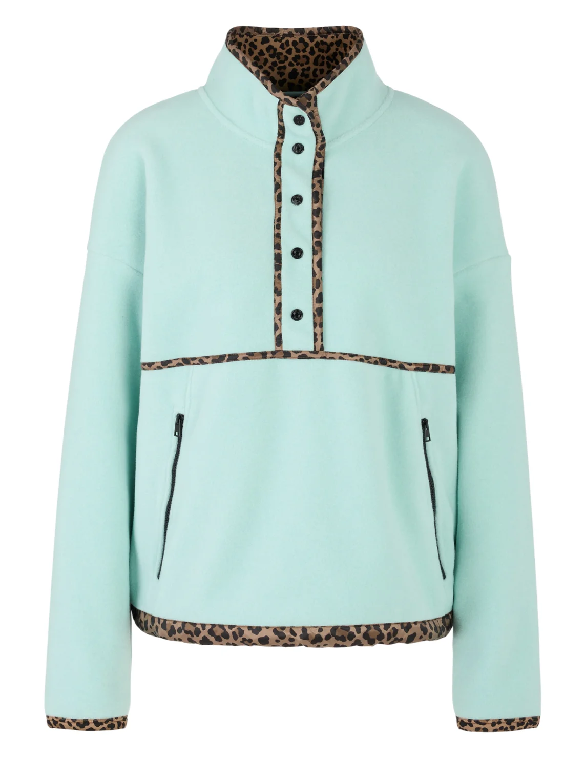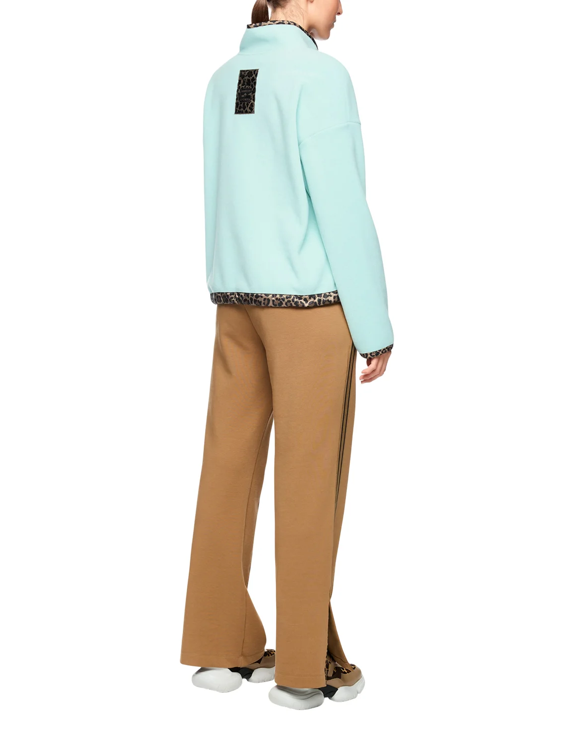 Свитшот изготовлен из полиэстера и хлопка. Модель выполнена в прямом крое. Имеет воротник-стойку, застежку на кнопках, прорезные карманы на молниях и длинные рукава с манжетами. Декорирован анималистичным принтом.