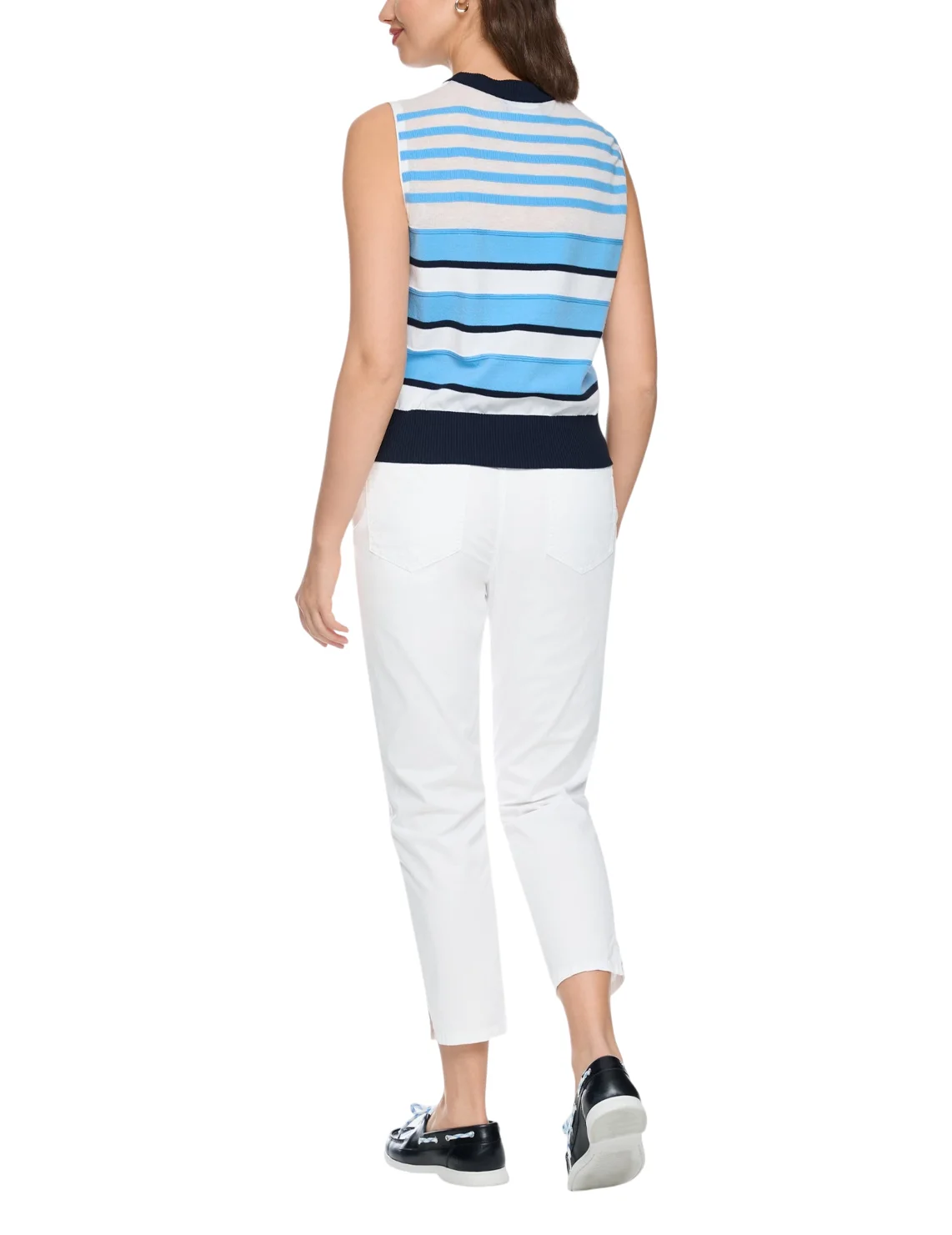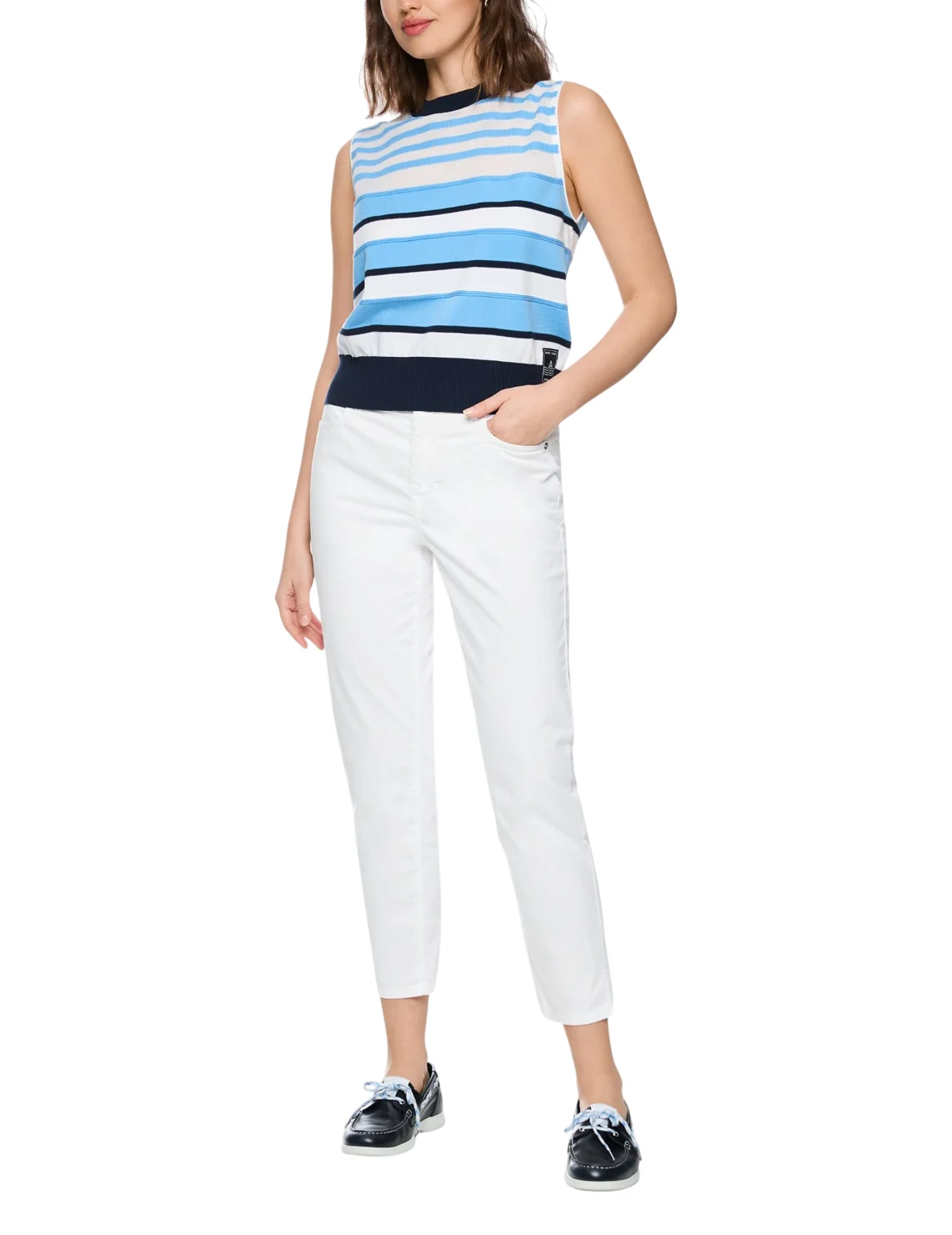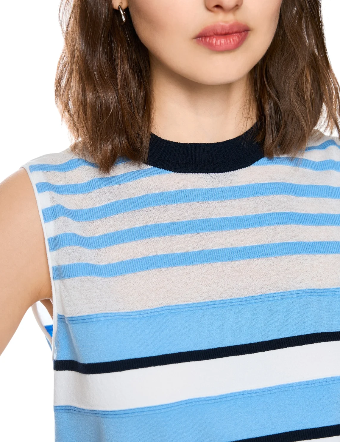 Топ изготовлен из лиоцела, полиэстера, хлопка и полиамида. Модель выполнена в прямом крое. Имеет круглый вырез горловины, манжету на подоле. Декорировано полосатым принтом.
