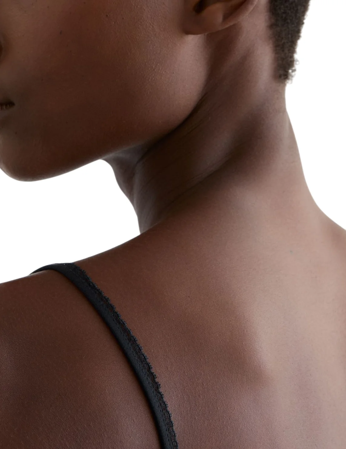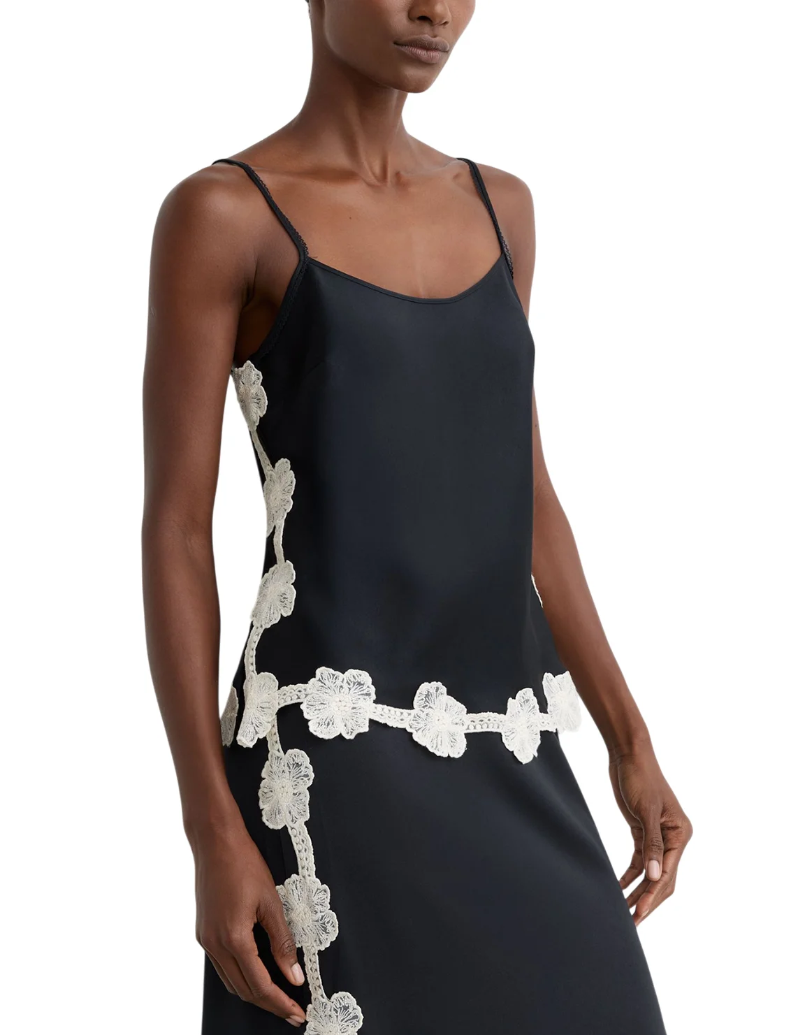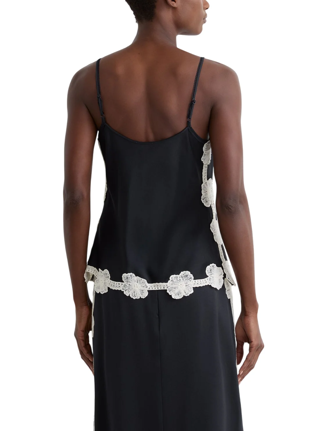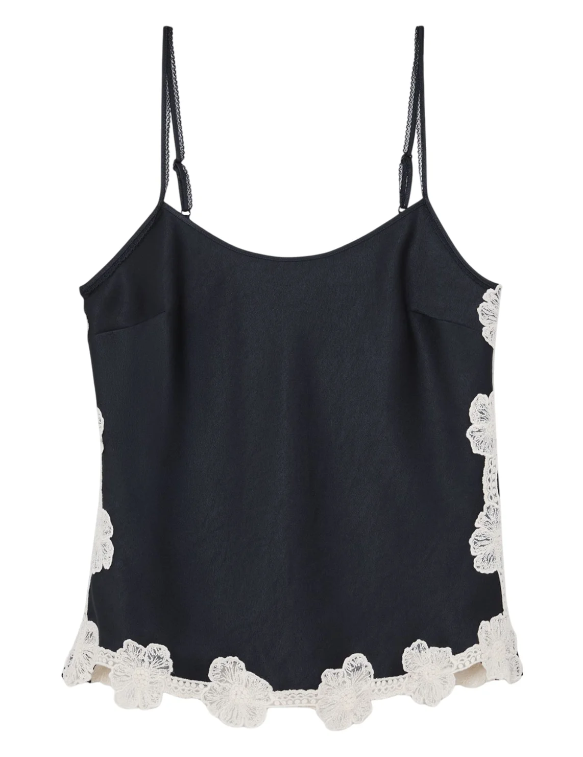 Топ изготовлен из полиэстера, хлопка, акрила и нейлона. Модель выполнена в приталенном крое. Имеет V-образный вырез горловины и тонкие регулируемые бретели. Декорирован кружевом.