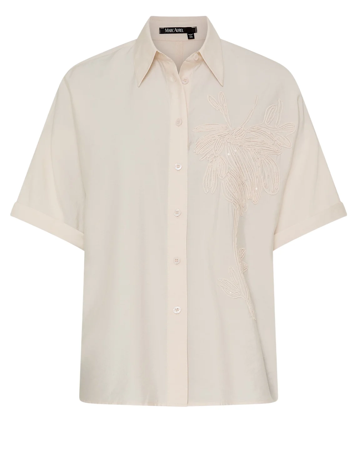 Блуза сорочкового типу виготовлена із віскози та поліаміду. Модель виконана у прямому крої. Має відкладний комір, короткі рукави з відворотами та застібається на планку із ґудзиками. Декорована квітковою вишивкою та паєтками.