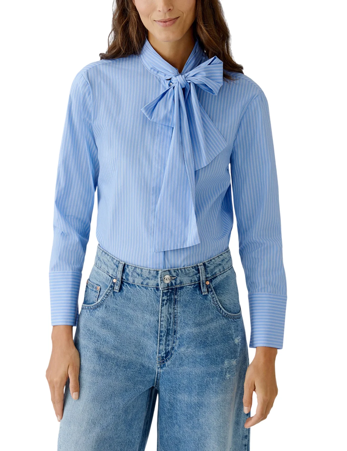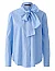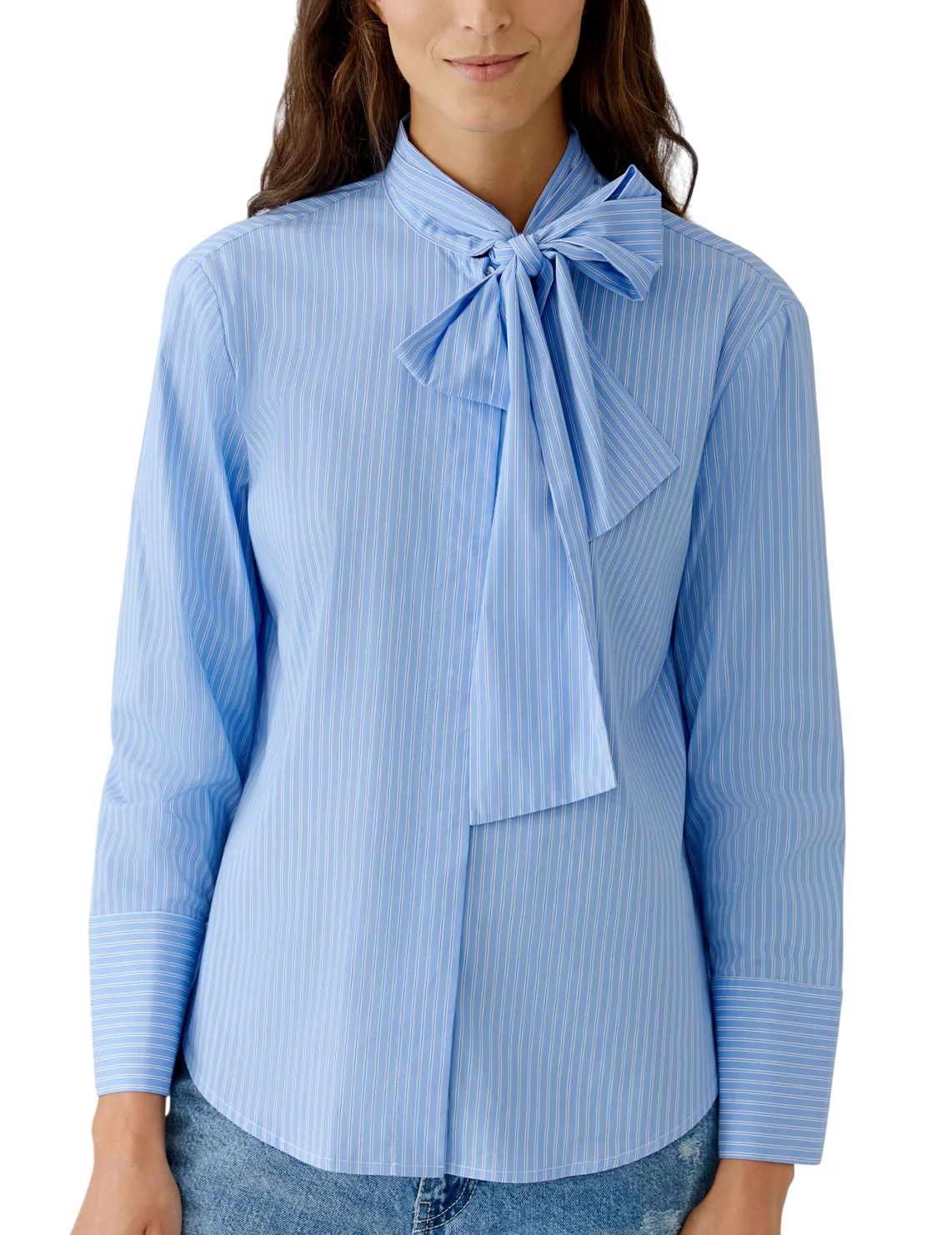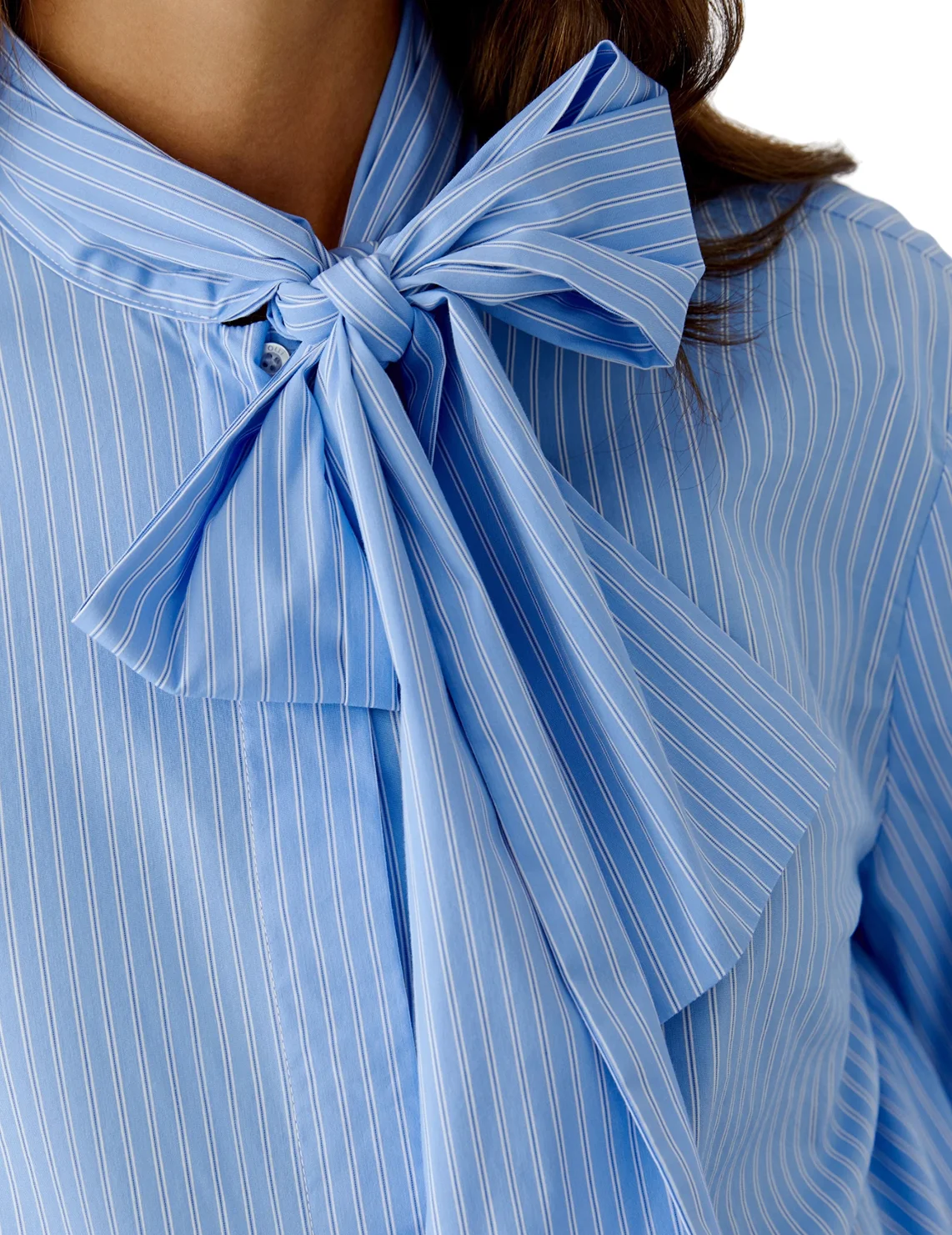 Блуза виготовлена з бавовни, поліаміду та еластану. Модель виконана у вільному крої. Має комір-стійку з бантом, приховану планку з ґудзиками та довгі рукави з манжетами. Декорована принтом у смужку.