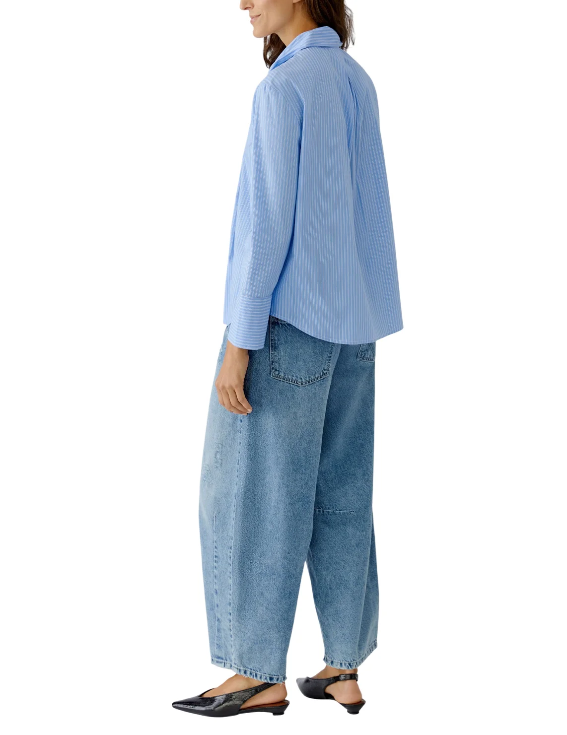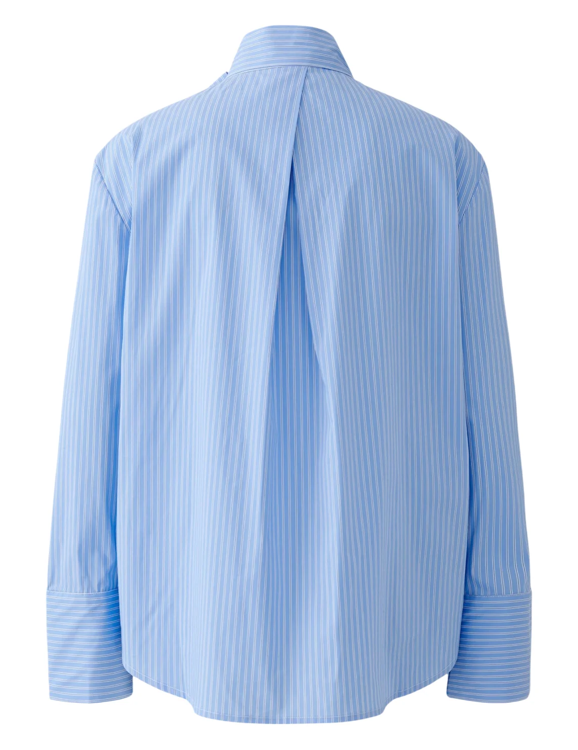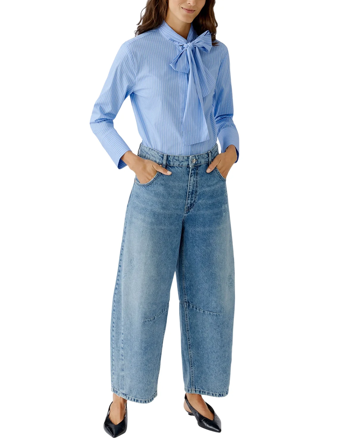 Блуза виготовлена з бавовни, поліаміду та еластану. Модель виконана у вільному крої. Має комір-стійку з бантом, приховану планку з ґудзиками та довгі рукави з манжетами. Декорована принтом у смужку.