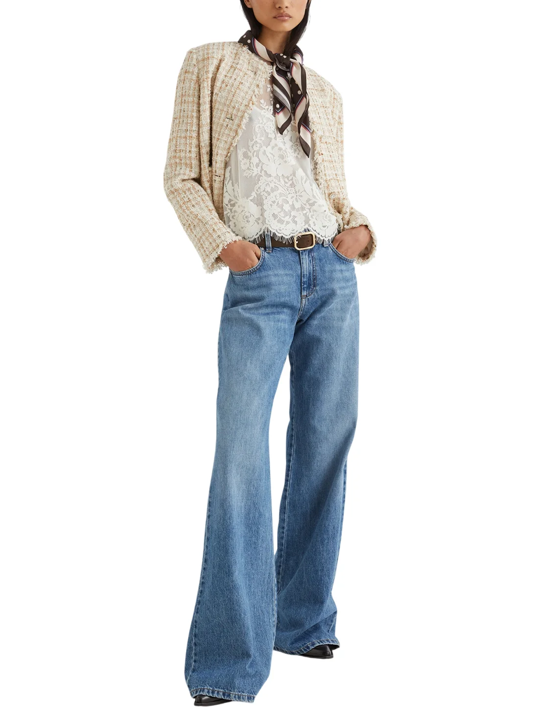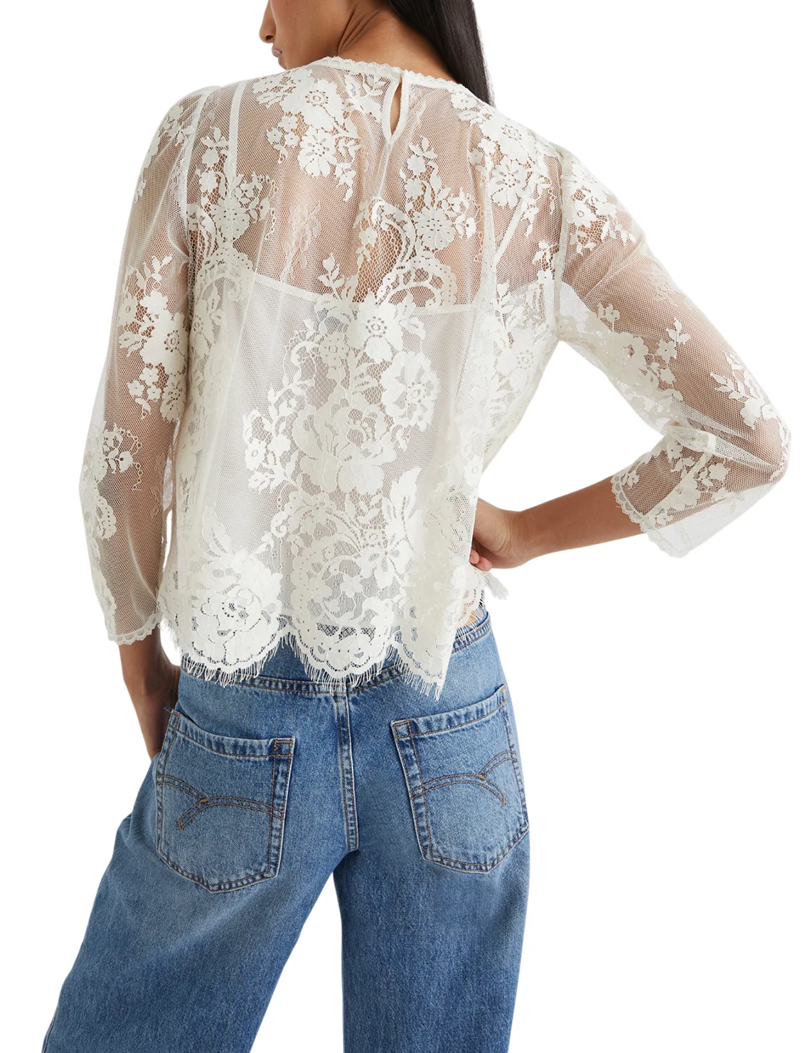 Блуза виготовлена з поліаміду та бавовни, підкладка з поліестеру. Модель виконана в прямому крої. Має круглий виріз горловини, застібку на ґудзик ззаду та рукави довжиною 3/4. Декорована квітковим мереживом і бісером.