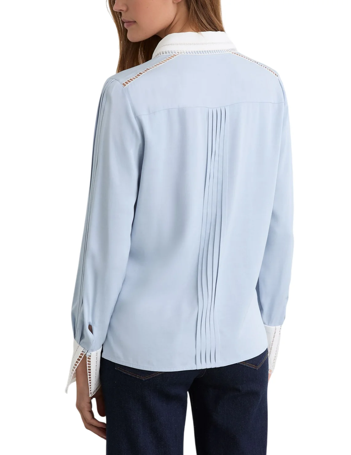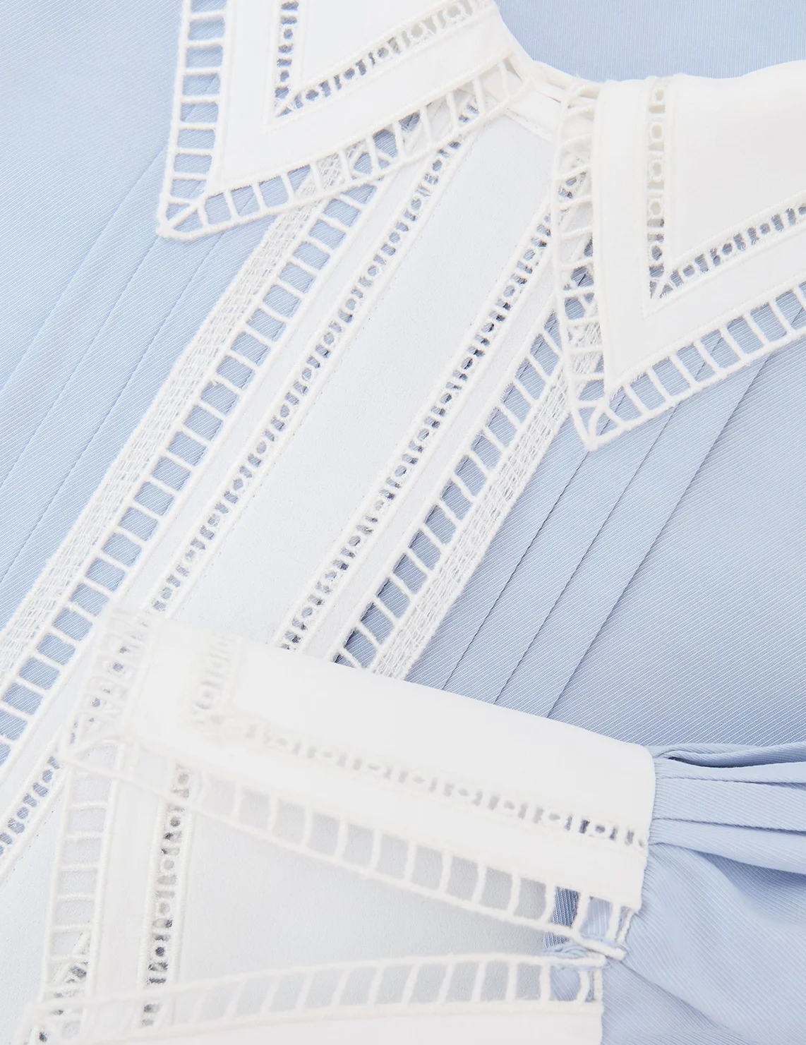 Блуза виготовлена зі 100% віскози високої якості. Модель виконана в прямому крої. Має класичний відкладний комір, приховану планку з ґудзиками та довгі рукави з манжетами. Декорована перфорацією та складками.