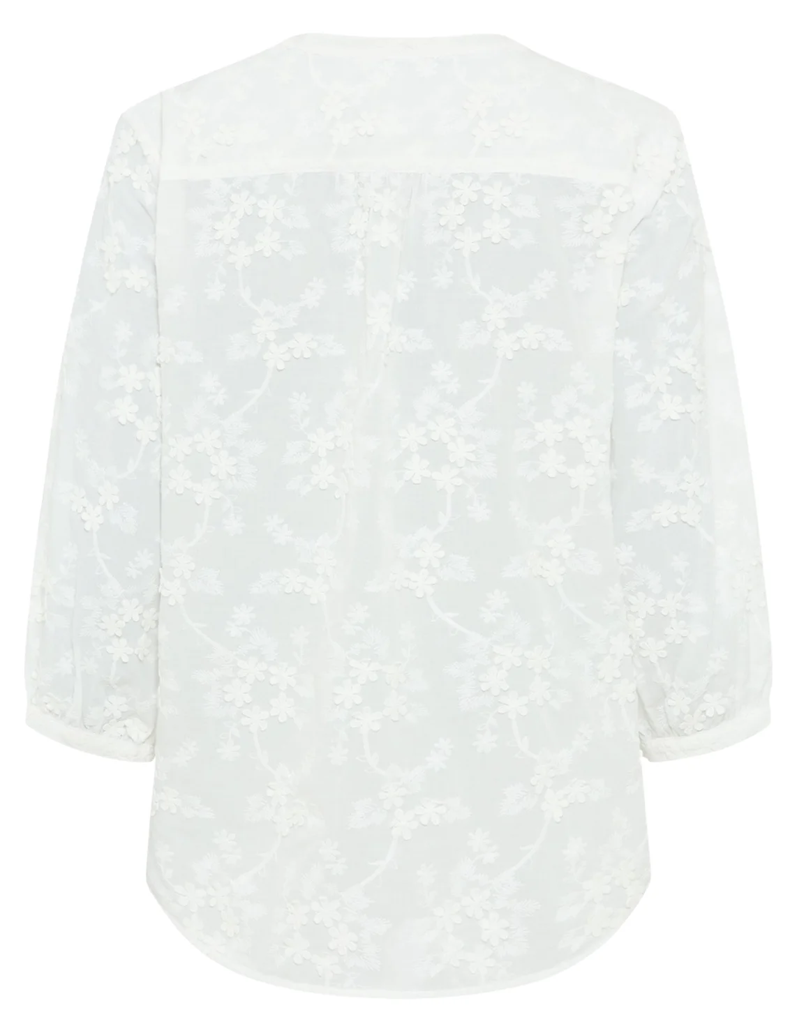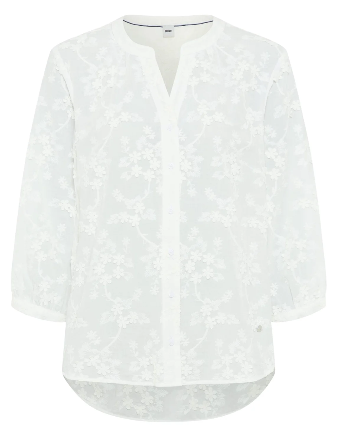 Блуза виготовлена з бавовни високої якості. Модель виконана в прямому крої. Має комір-стійку, планку з ґудзиками та рукави довжиною 3/4 з манжетами. Декорована квітковою вишивкою.