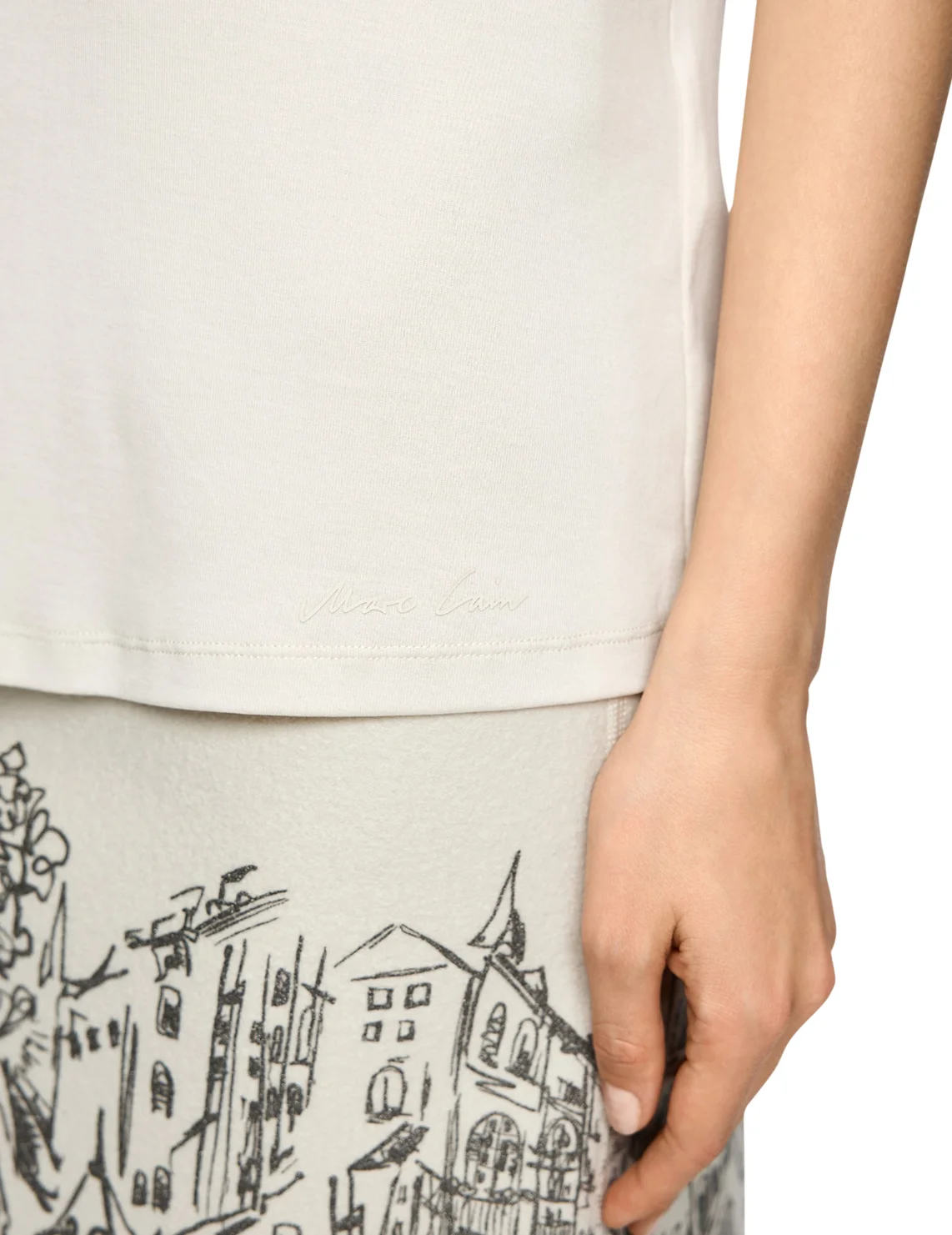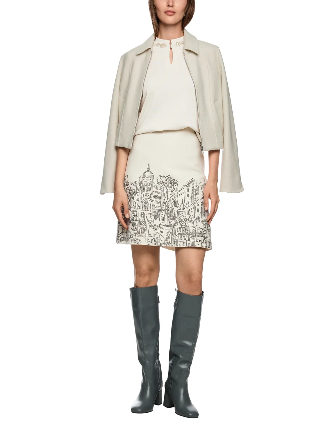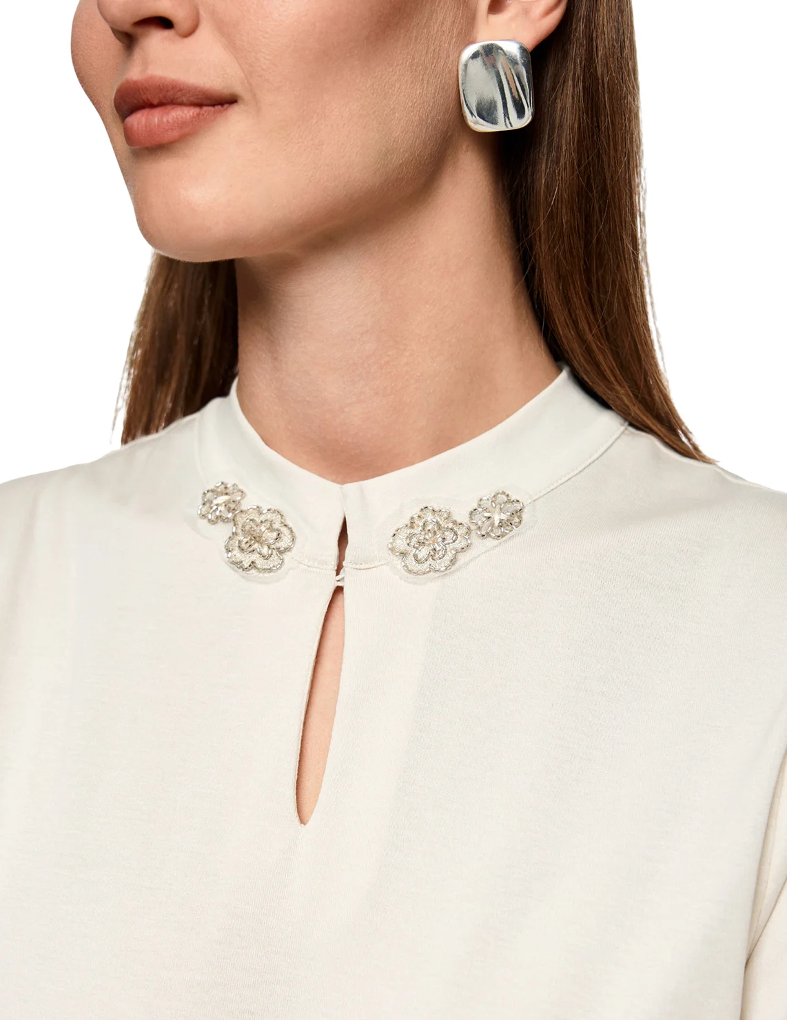 Блуза виготовлена з бавовни та еластану. Модель виконана в прямому крої. Має круглий виріз горловини, застібку на ґудзик і короткі рукави з відворотами. Декоровано вишивкою та бісером.