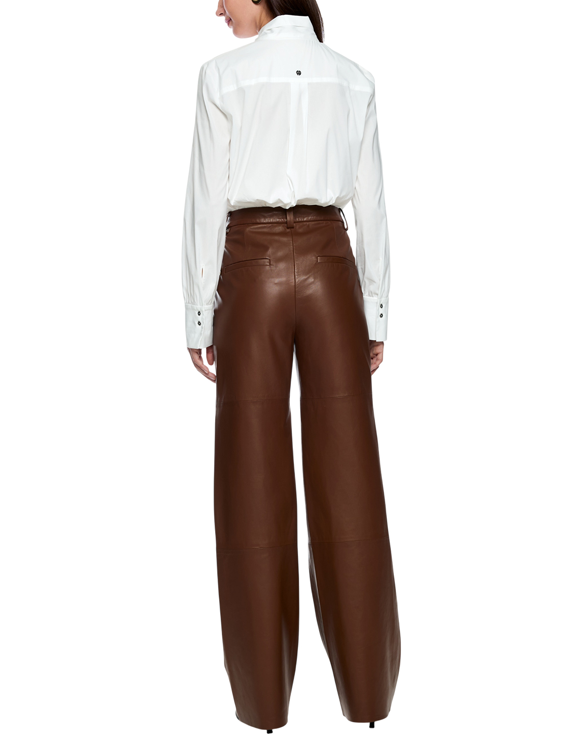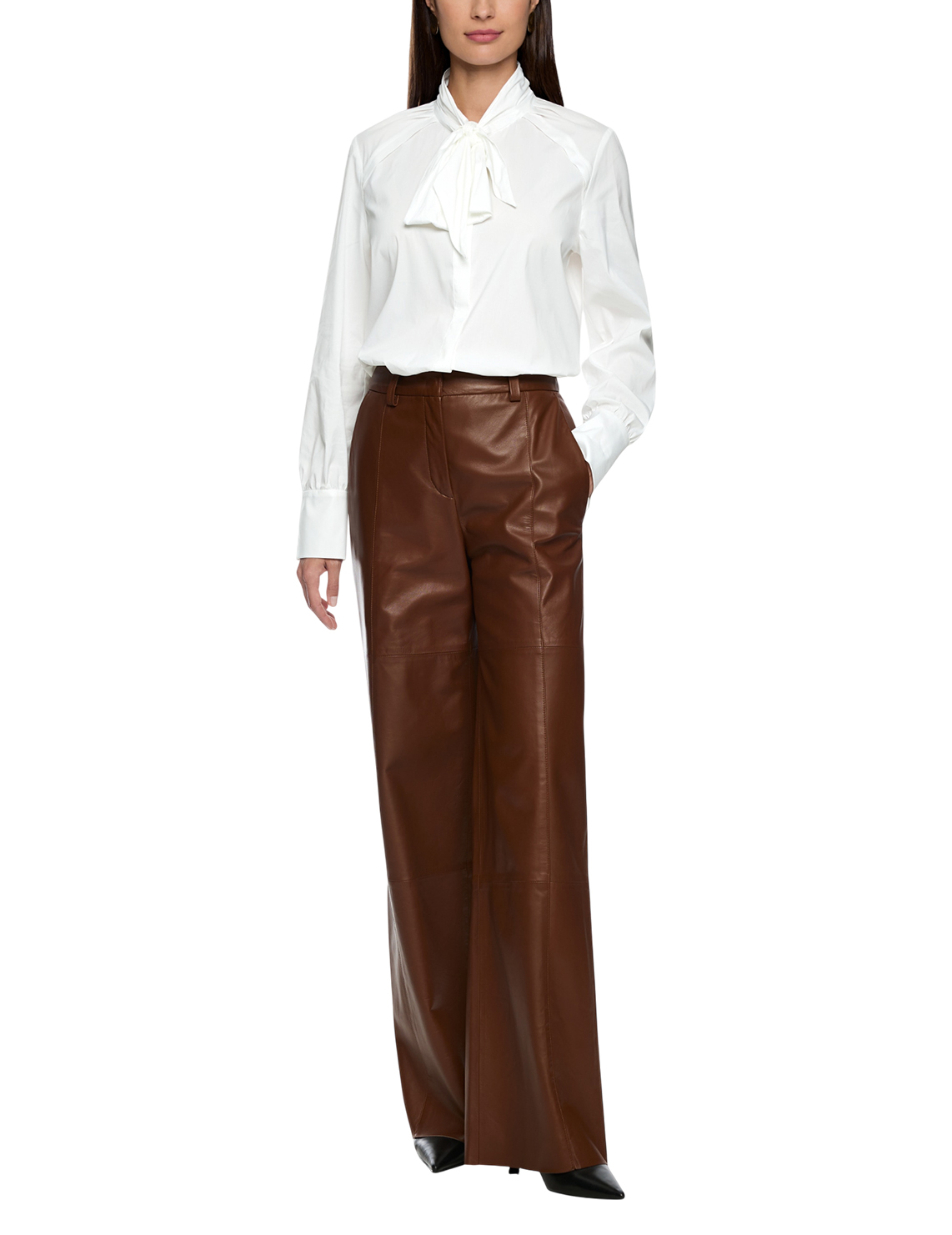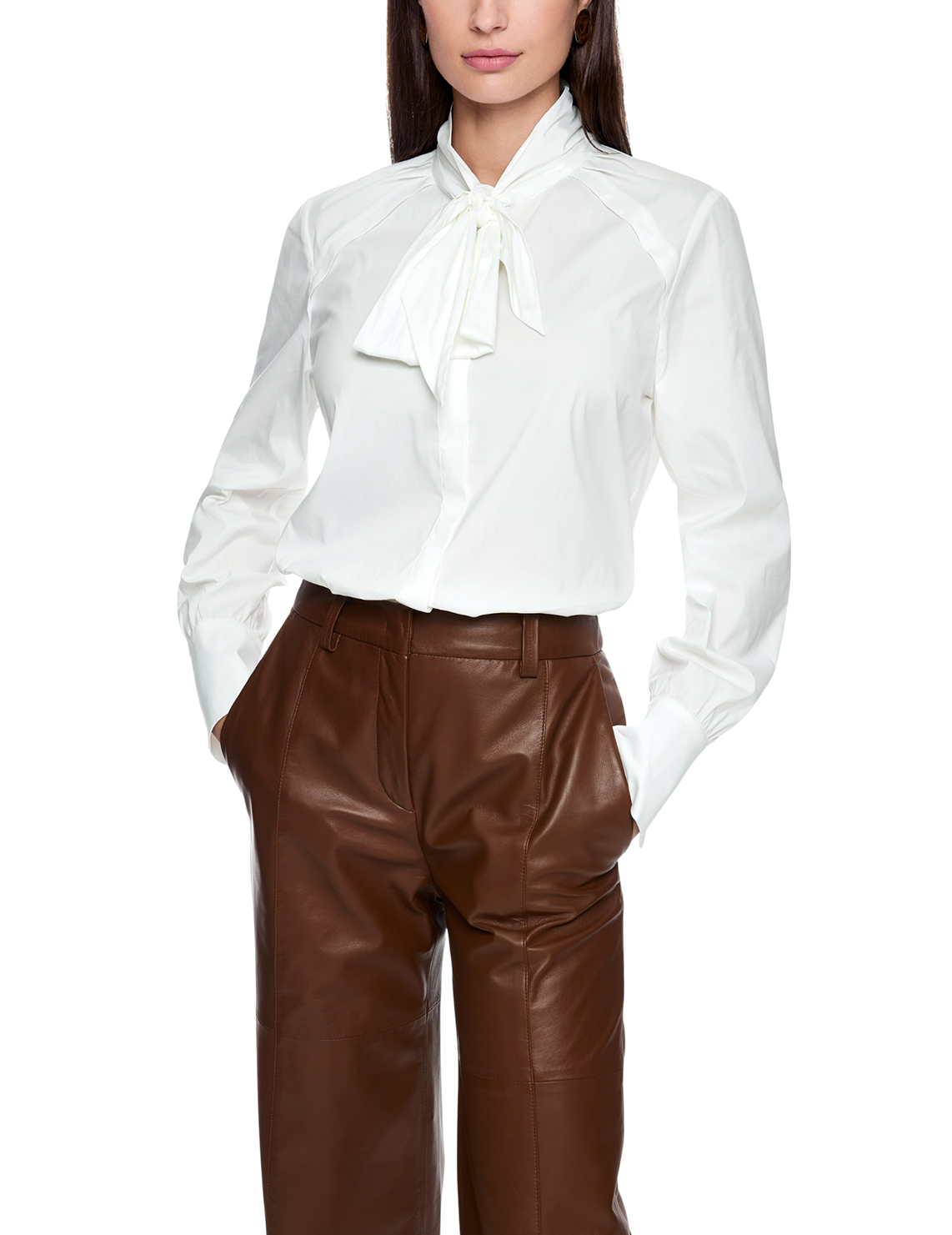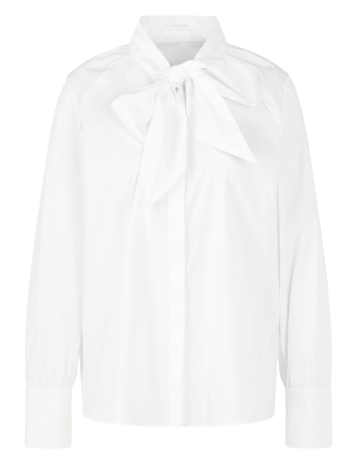 Блуза виготовлена з бавовни, поліаміду та еластану. Модель виконана у вільному крої. Має комір-стійку, приховану планку з ґудзиками та довгі рукави з манжетами. Декорована бантом.