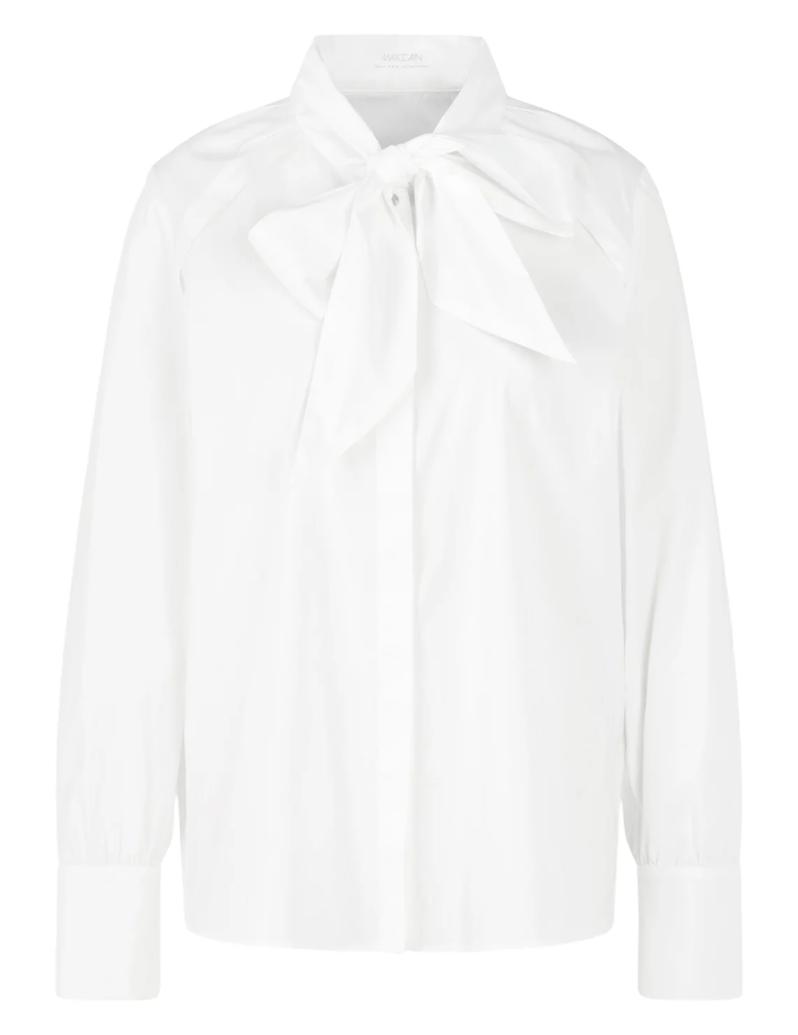 Блуза виготовлена з бавовни, поліаміду та еластану. Модель виконана у вільному крої. Має комір-стійку, приховану планку з ґудзиками та довгі рукави з манжетами. Декорована бантом.
