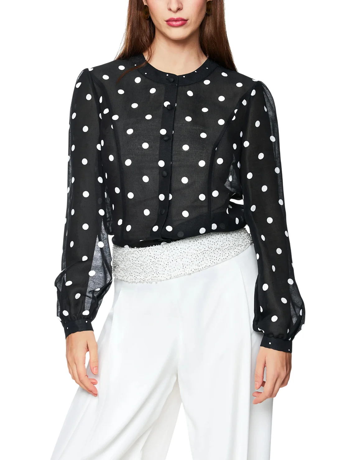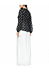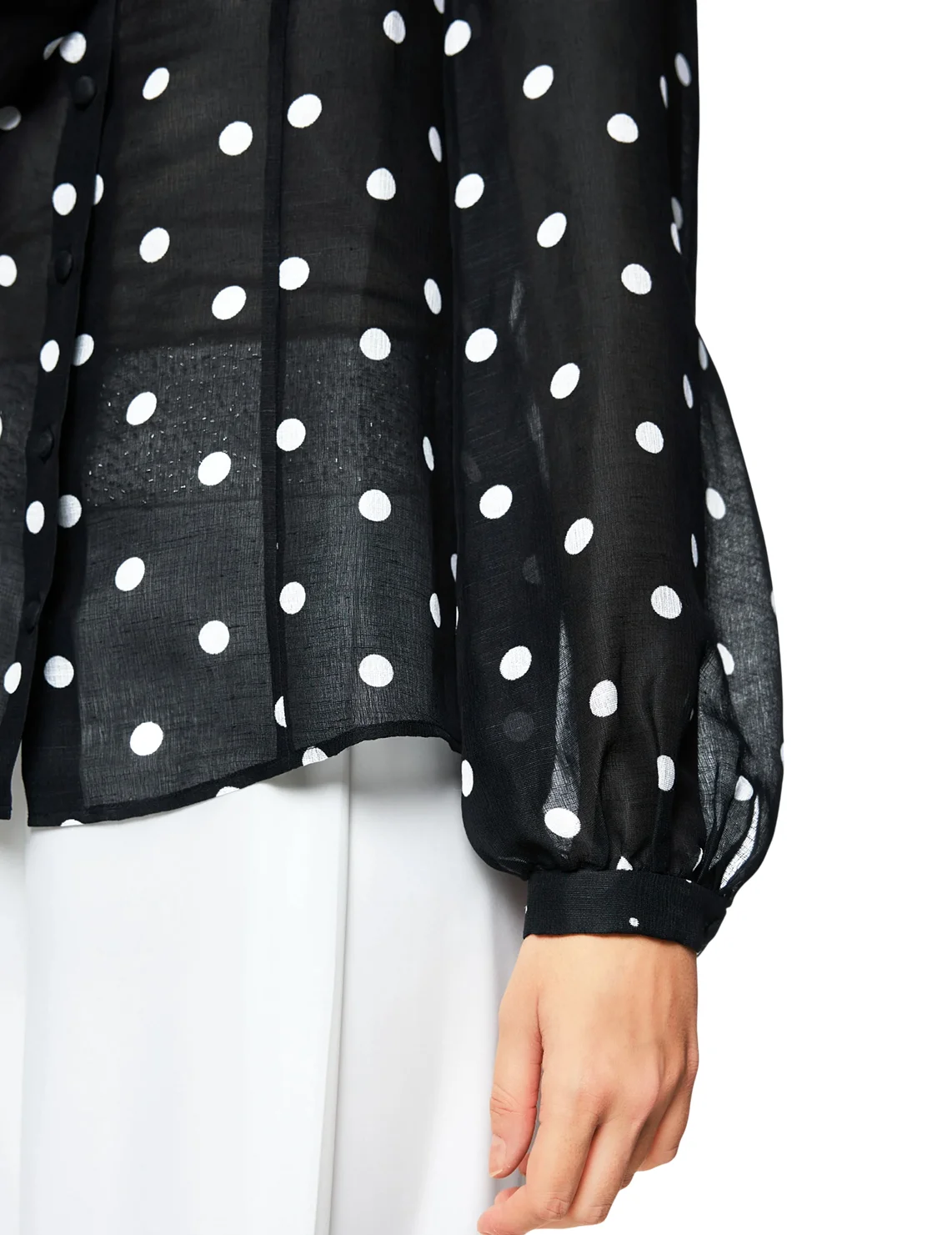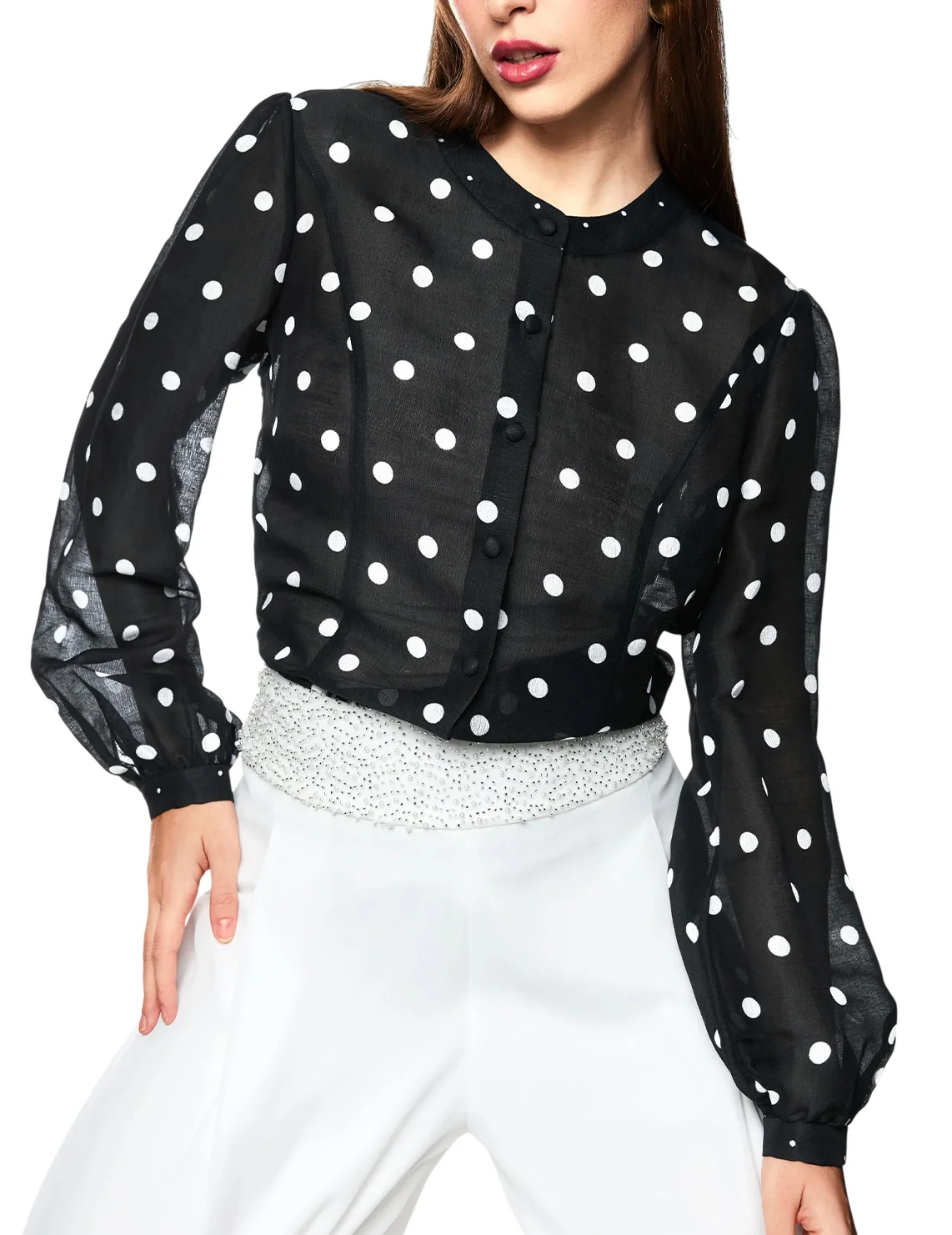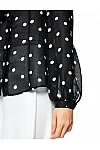 Напівпрозора блуза виготовлена з льону та шовку високої якості. Модель виконана в приталеному крої. Має круглий виріз горловини, планку з ґудзиками та довгі рукави з манжетами. Декорована принтом у горошок.