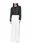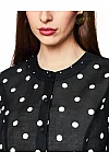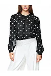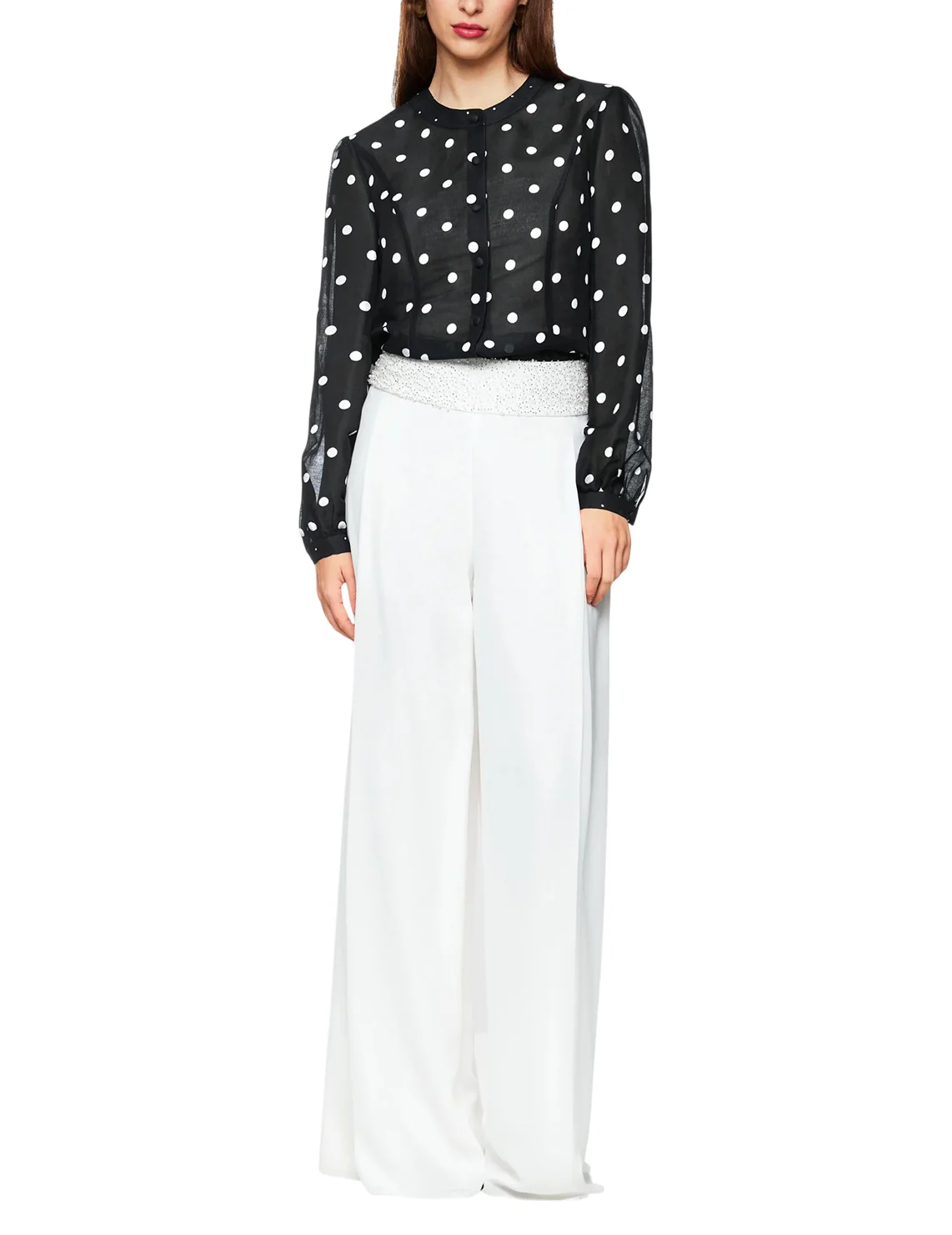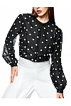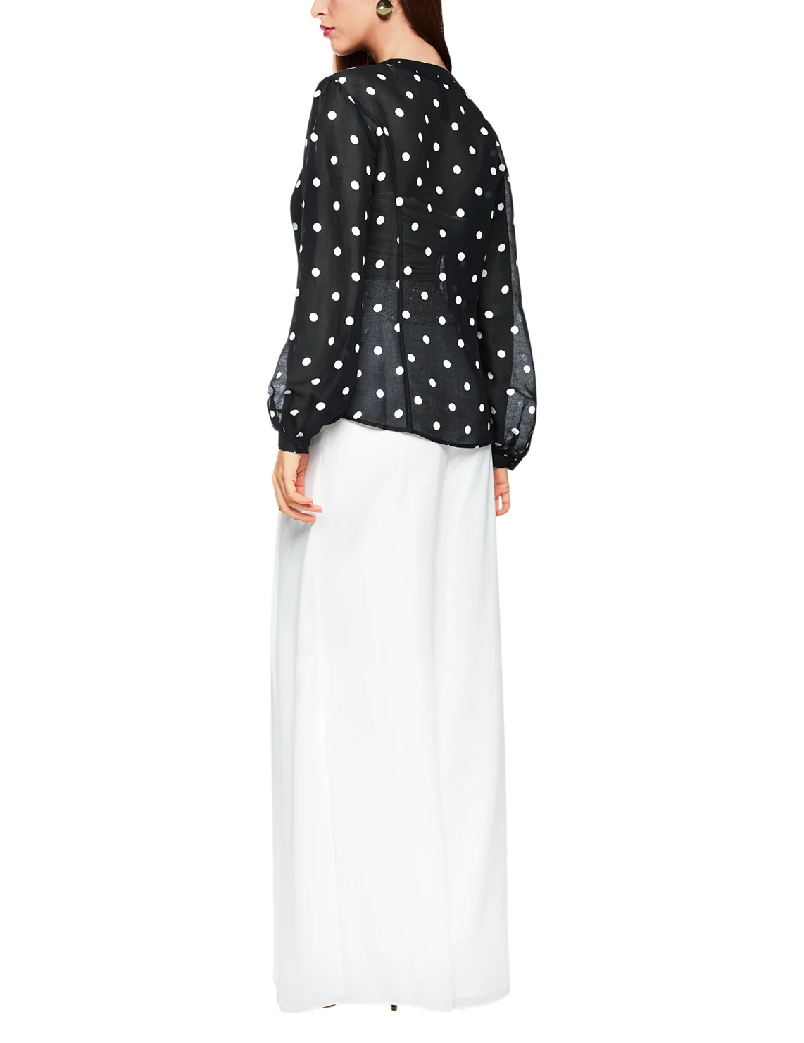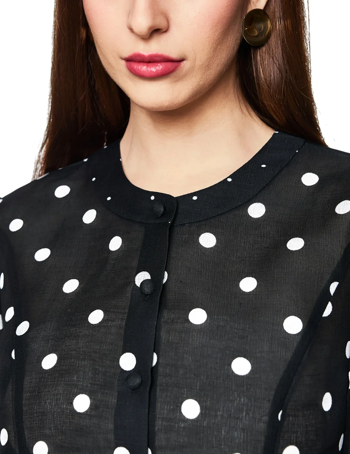 Напівпрозора блуза виготовлена з льону та шовку високої якості. Модель виконана в приталеному крої. Має круглий виріз горловини, планку з ґудзиками та довгі рукави з манжетами. Декорована принтом у горошок.