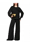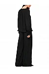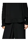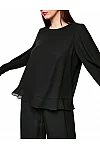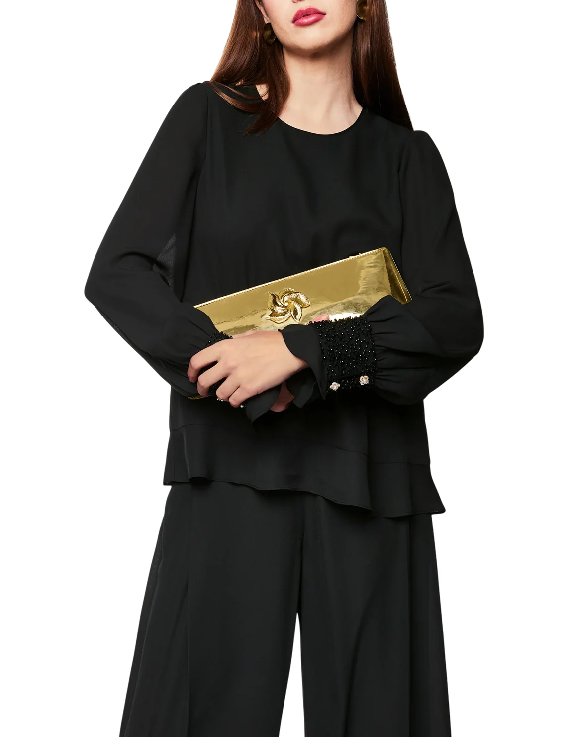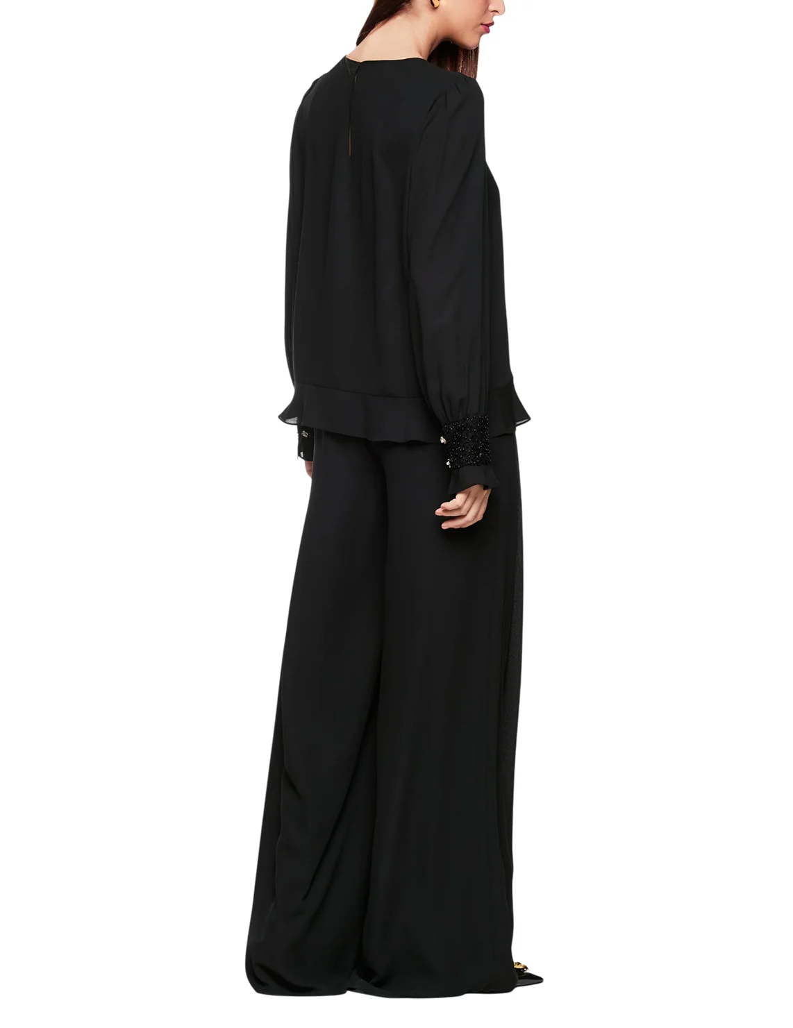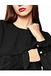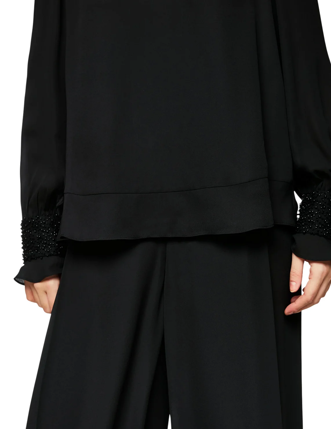 Блуза виготовлена з поліестеру високої якості. Модель виконана в прямому крої. Має круглий виріз горловини, застібку на ґудзик ззаду та довгі рукави з манжетами. Декорована бісером і намистинами на манжетах.