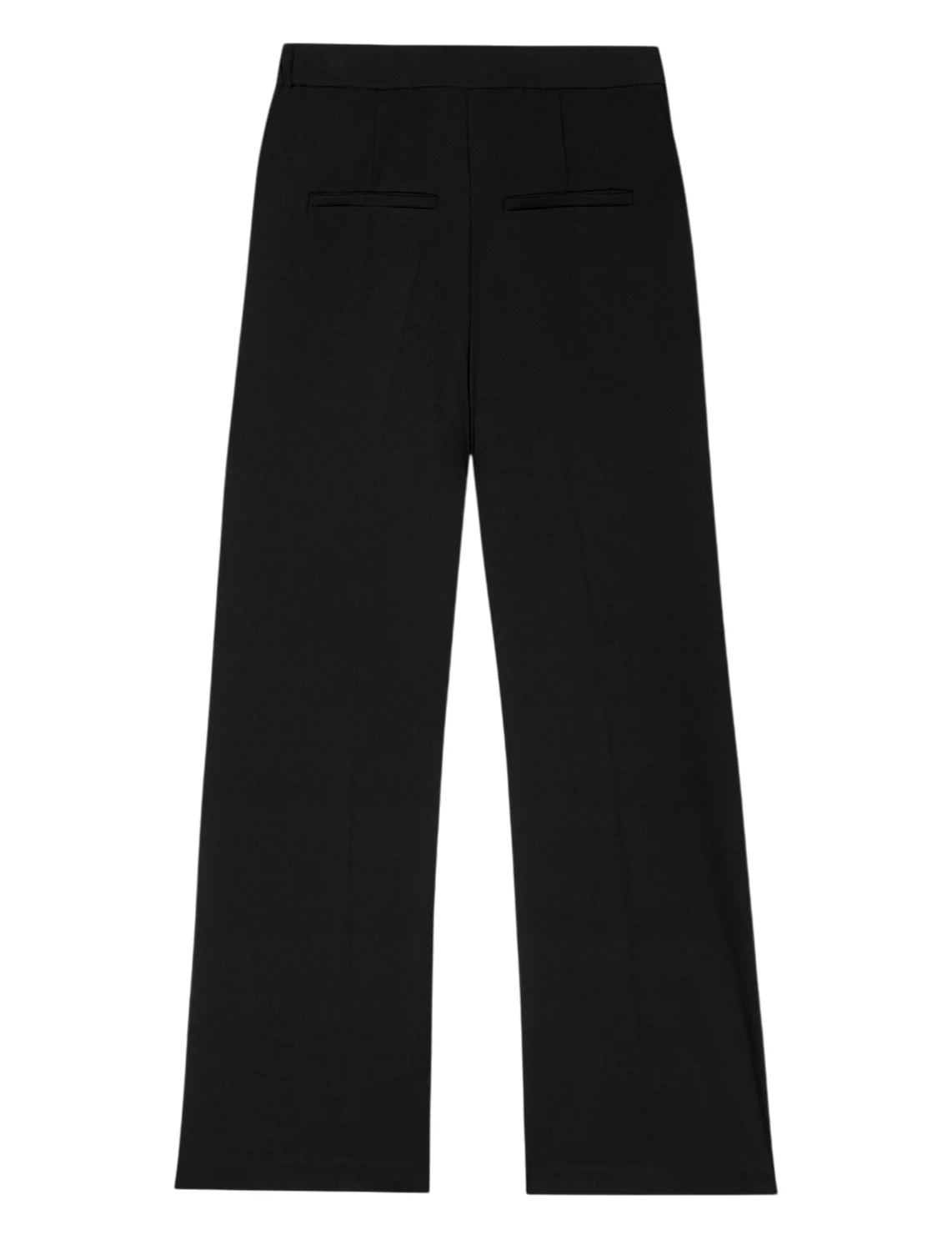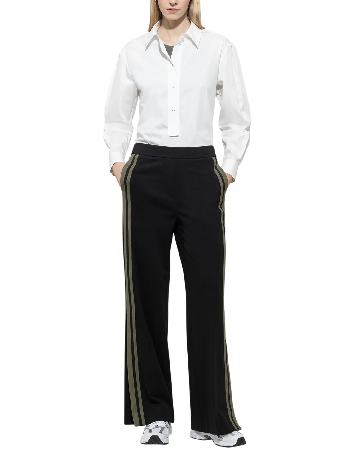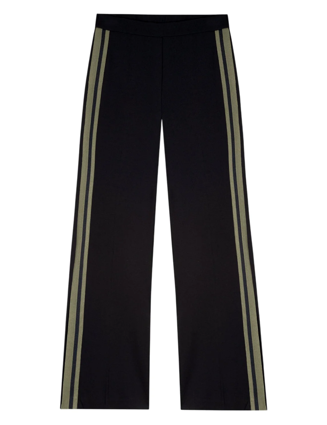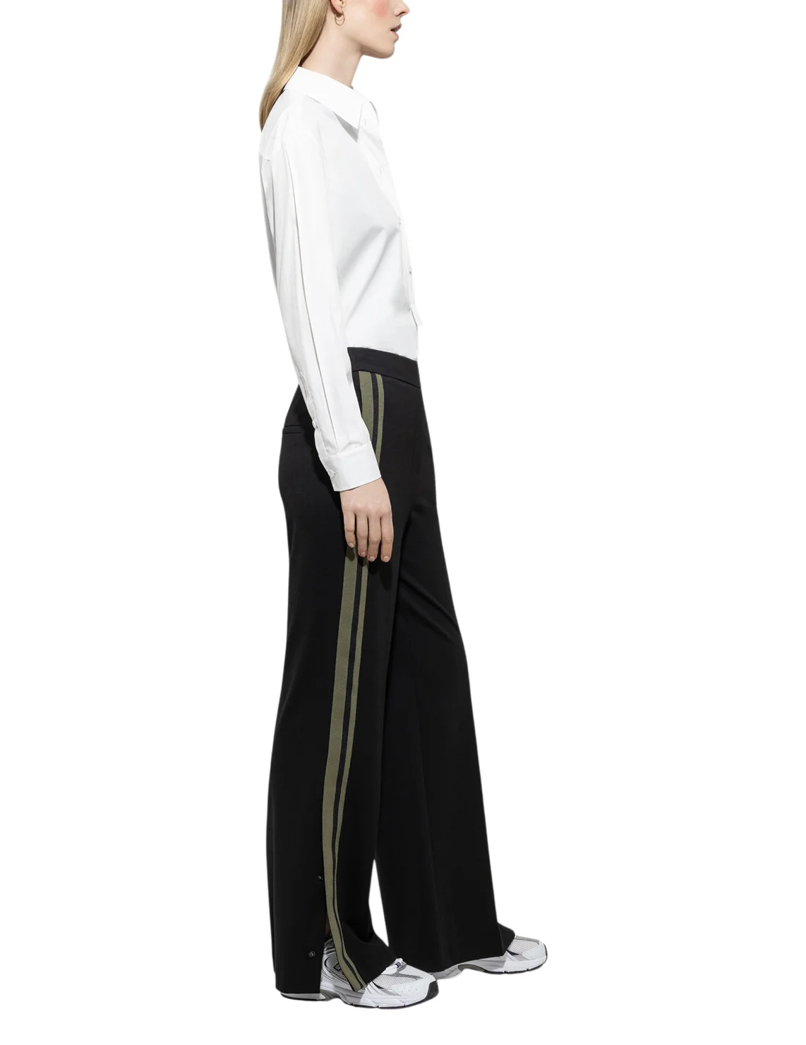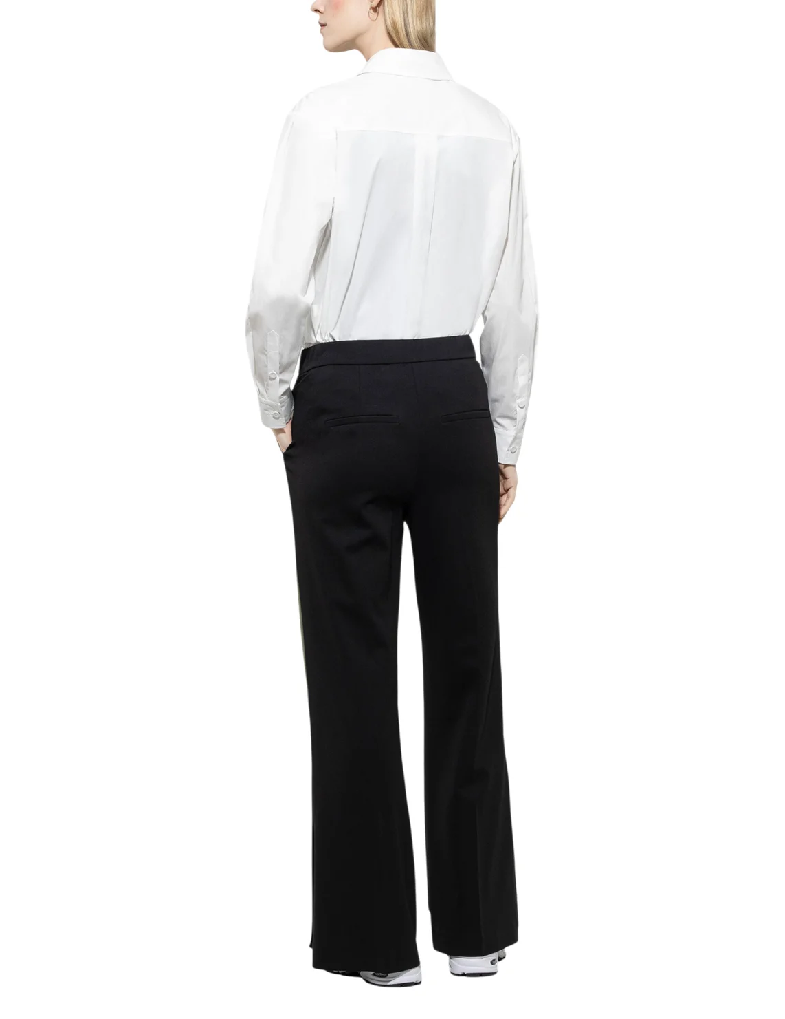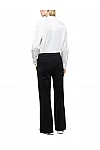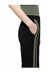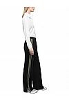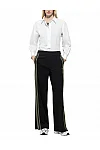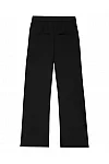 Штани виготовлені з віскози, поліаміду та еластану. Модель виконана у розкльошеному крої. Має еластичний пояс, передні та задні кишені, розрізи знизу штанин на кнопках. Декоровані бічними вставками вздовж виробу.
