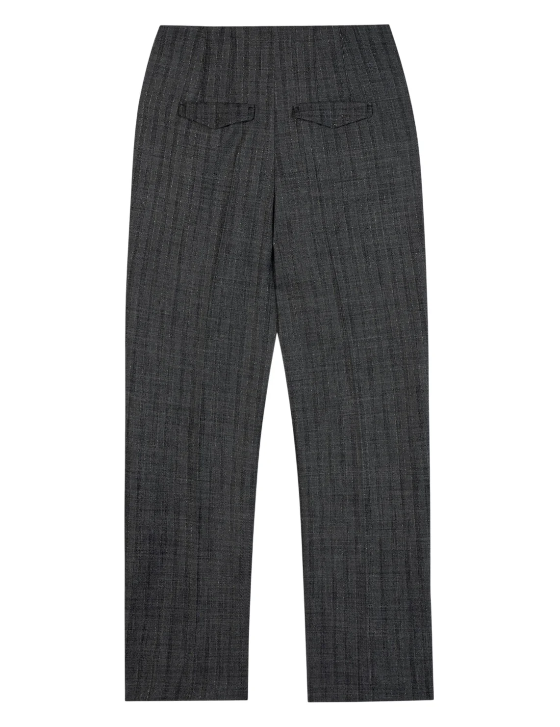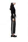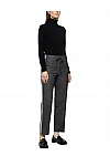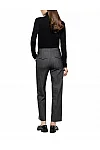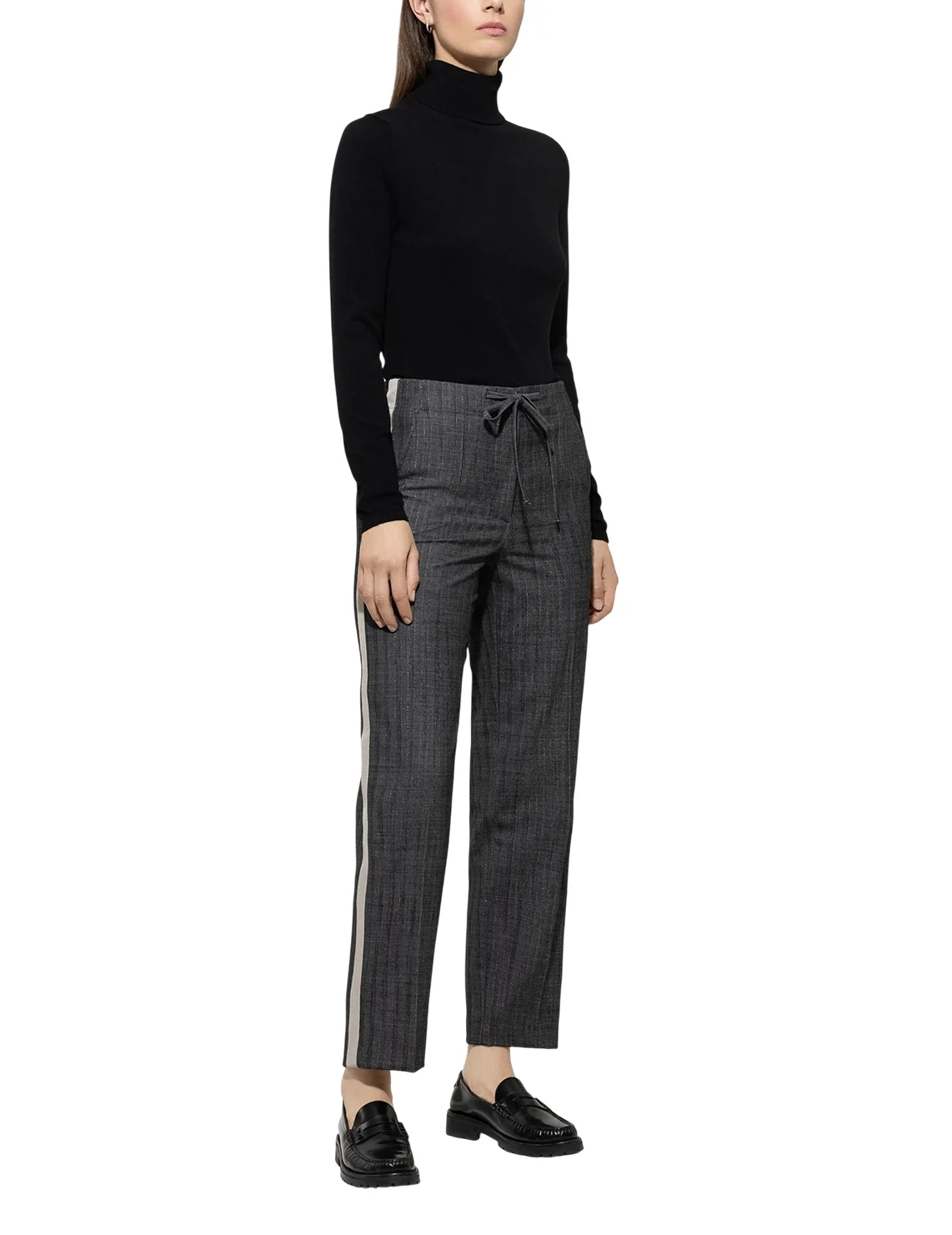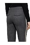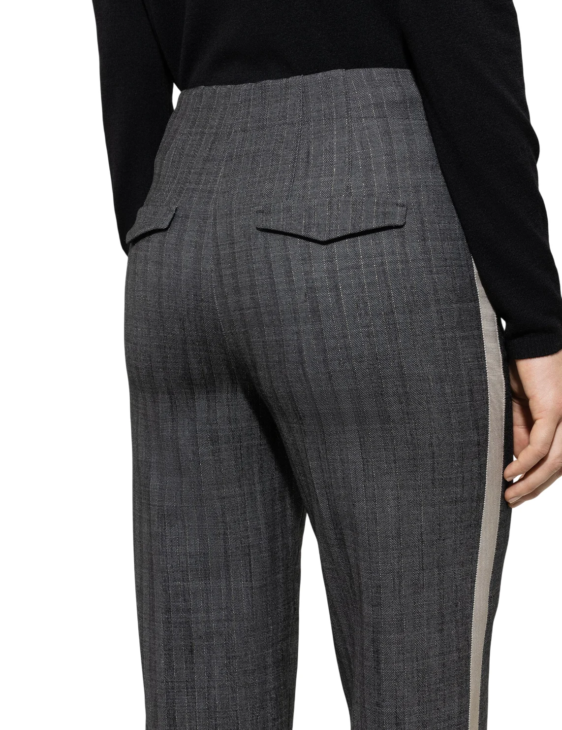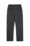 Штани виготовлені з поліестеру, вовни та еластану. Модель виконана в прямому крої. Має еластичний пояс із куліскою, пресовані стрілки, декоративні клапани ззаду та бічні прорізні кишені. Декоровані лампасами та принтом у смужку.