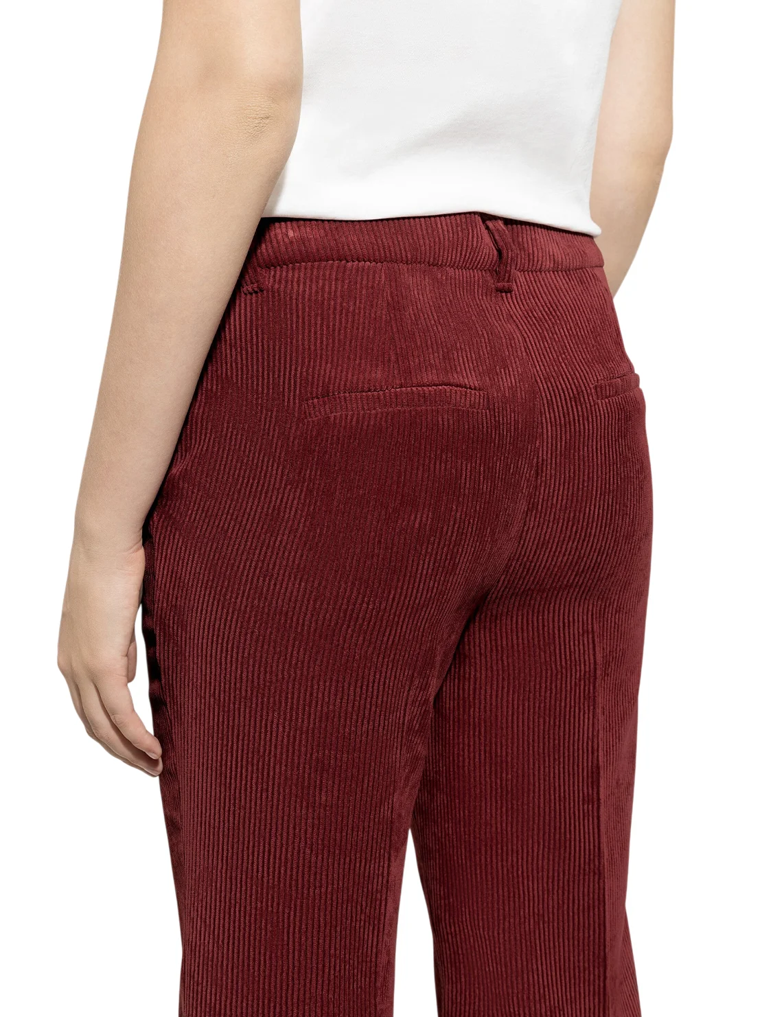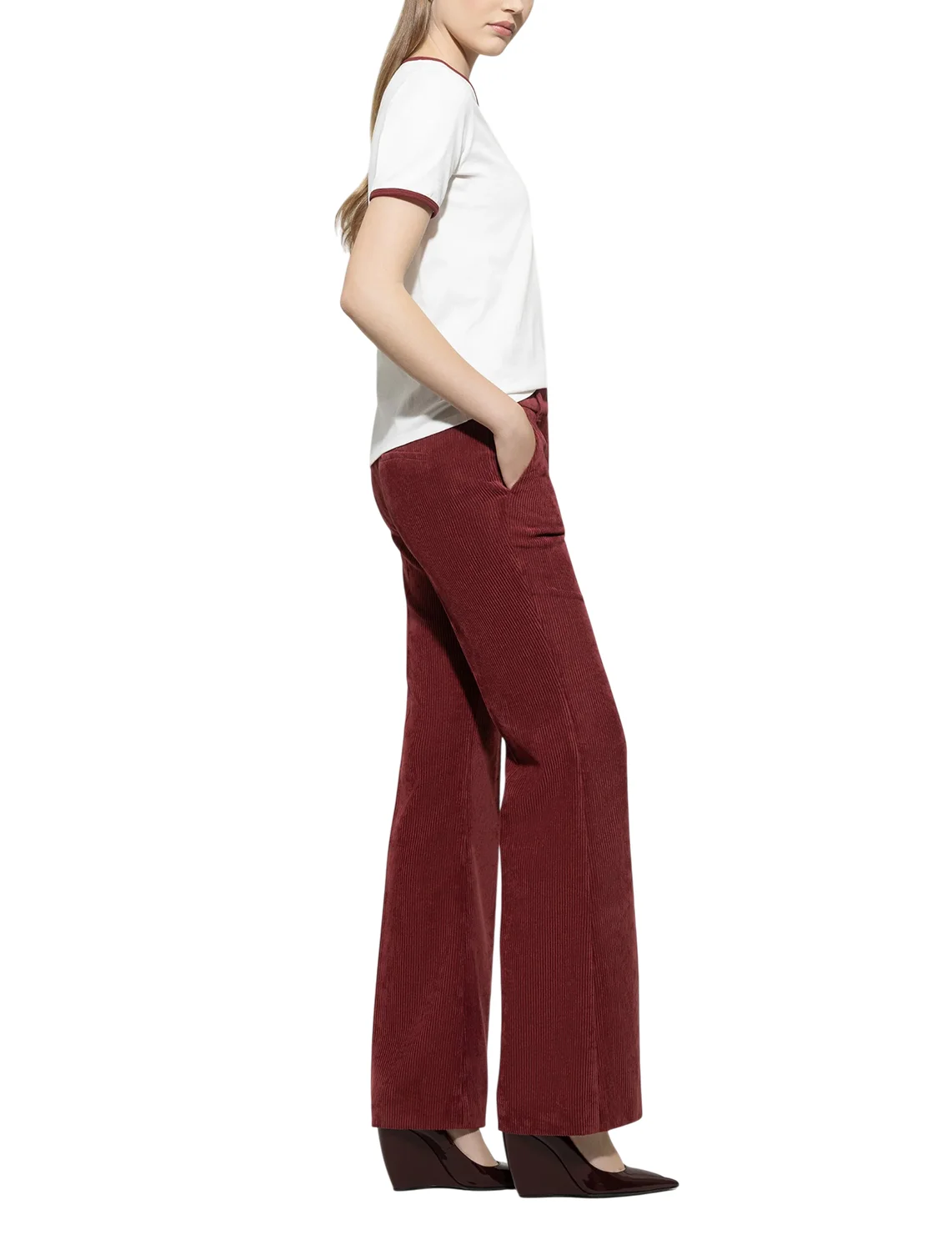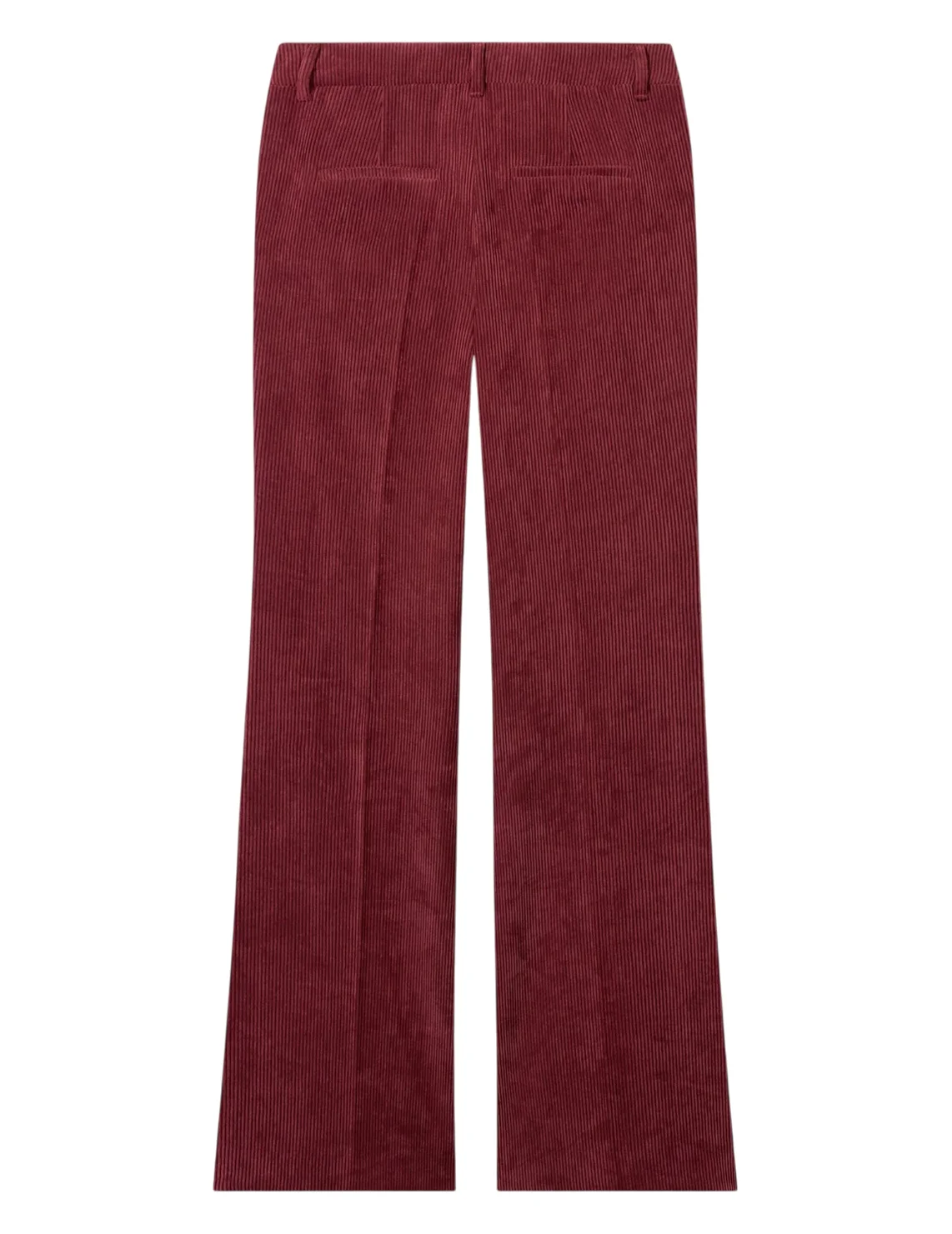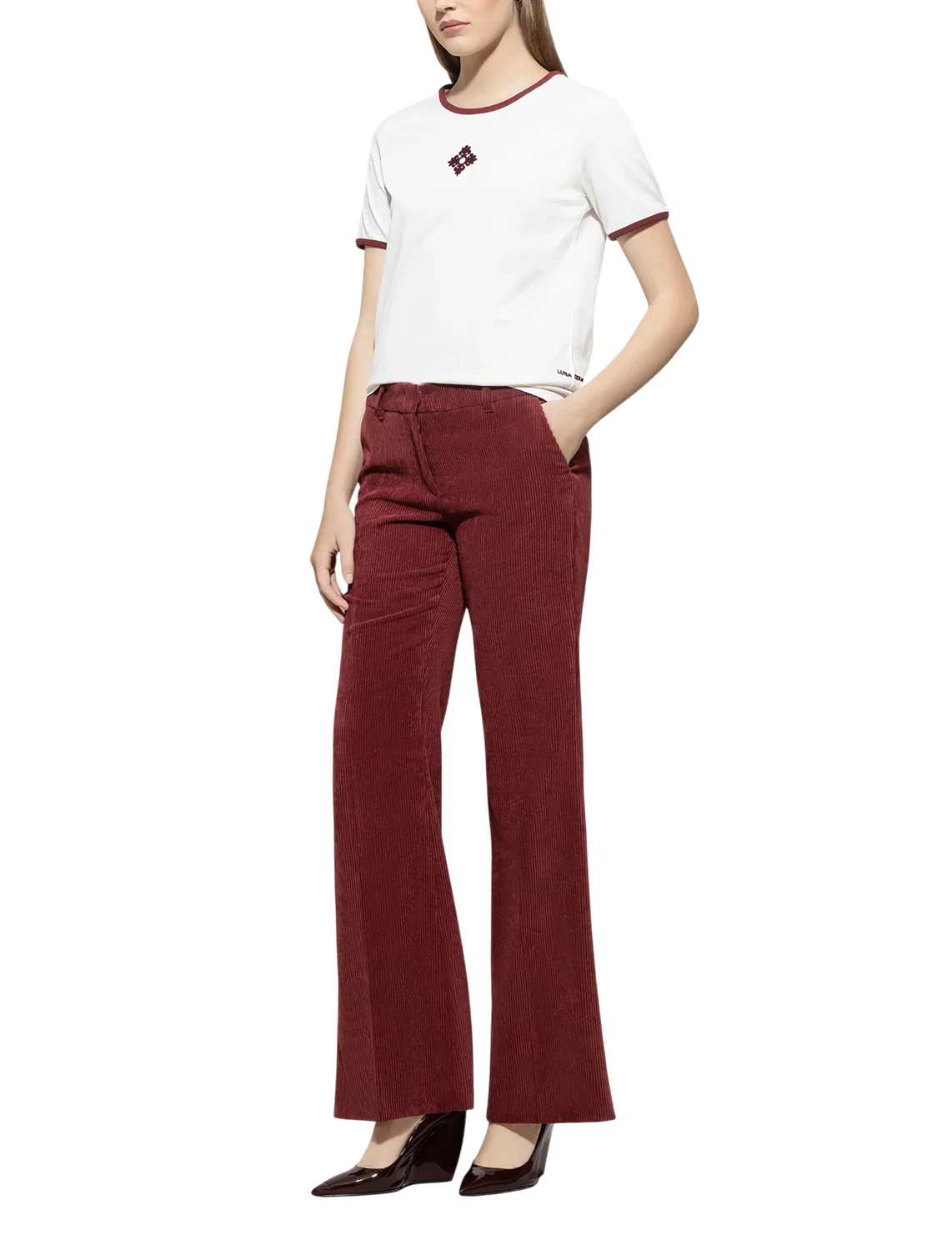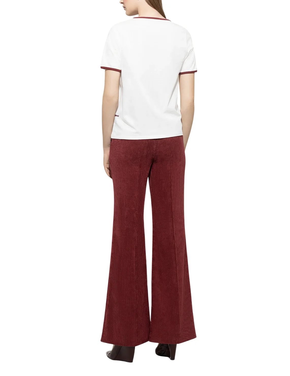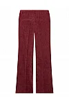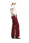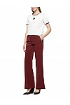 Штани виготовлені з поліестеру, поліаміду та еластану. Модель виконана в розкльошеному крої. Має приховану застібку-блискавку з гачком, шльовки для ременя, пресовані стрілки, а також пару бічних і пару задніх прорізних кишень.