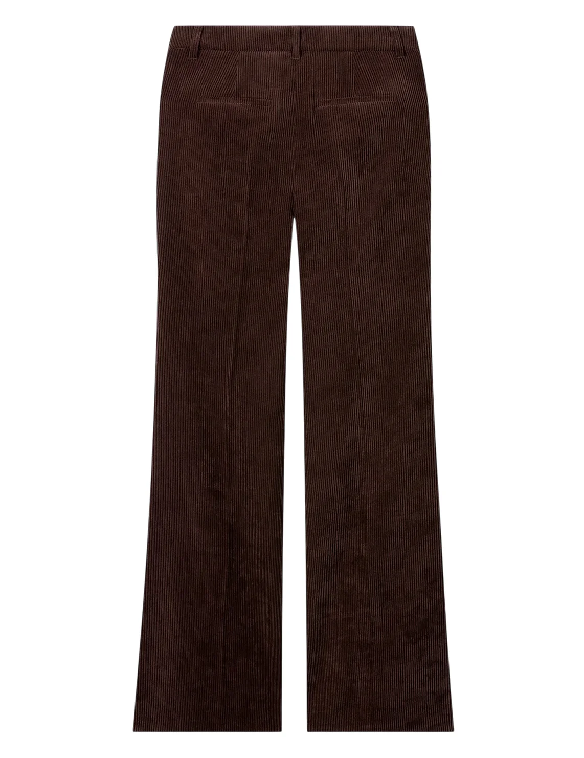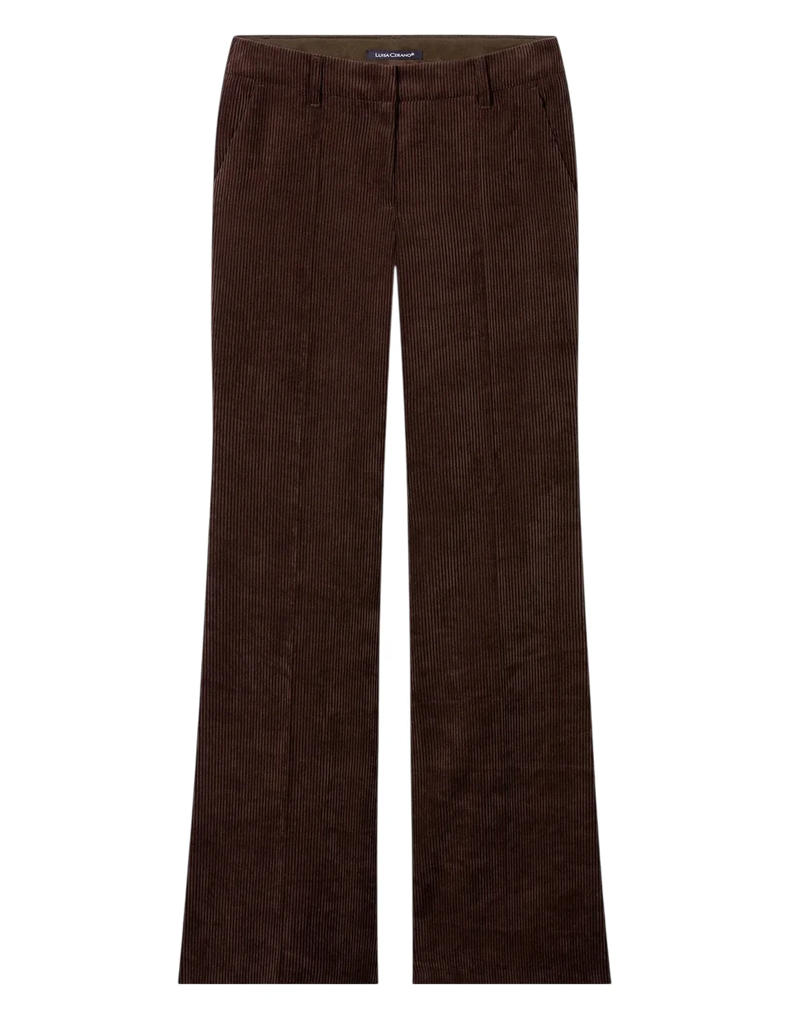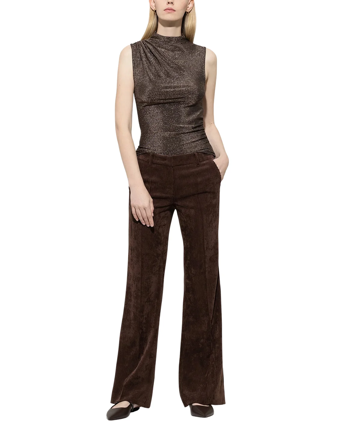 Штани виготовлені з поліестеру, поліаміду та еластану. Модель виконана в розкльошеному крої. Має приховану застібку-блискавку з гачком, шльовки для ременя, пресовані стрілки, декоративні кишені позаду і прорізні бічні кишені.