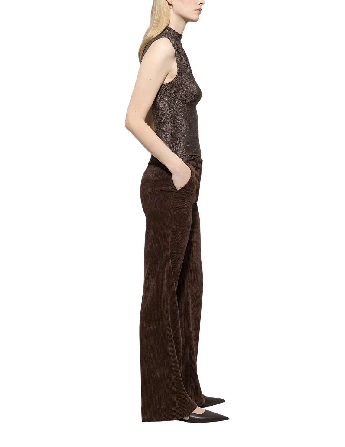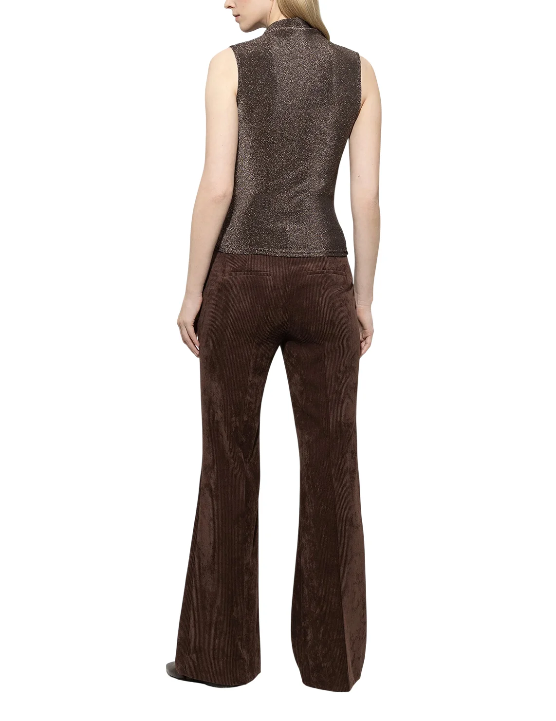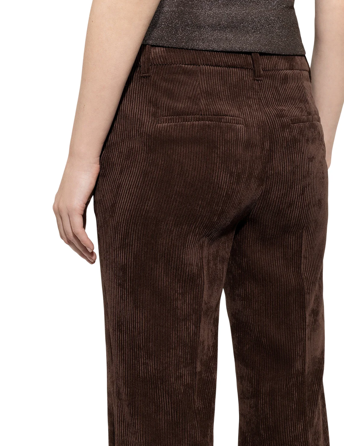 Штани виготовлені з поліестеру, поліаміду та еластану. Модель виконана в розкльошеному крої. Має приховану застібку-блискавку з гачком, шльовки для ременя, пресовані стрілки, декоративні кишені позаду і прорізні бічні кишені.