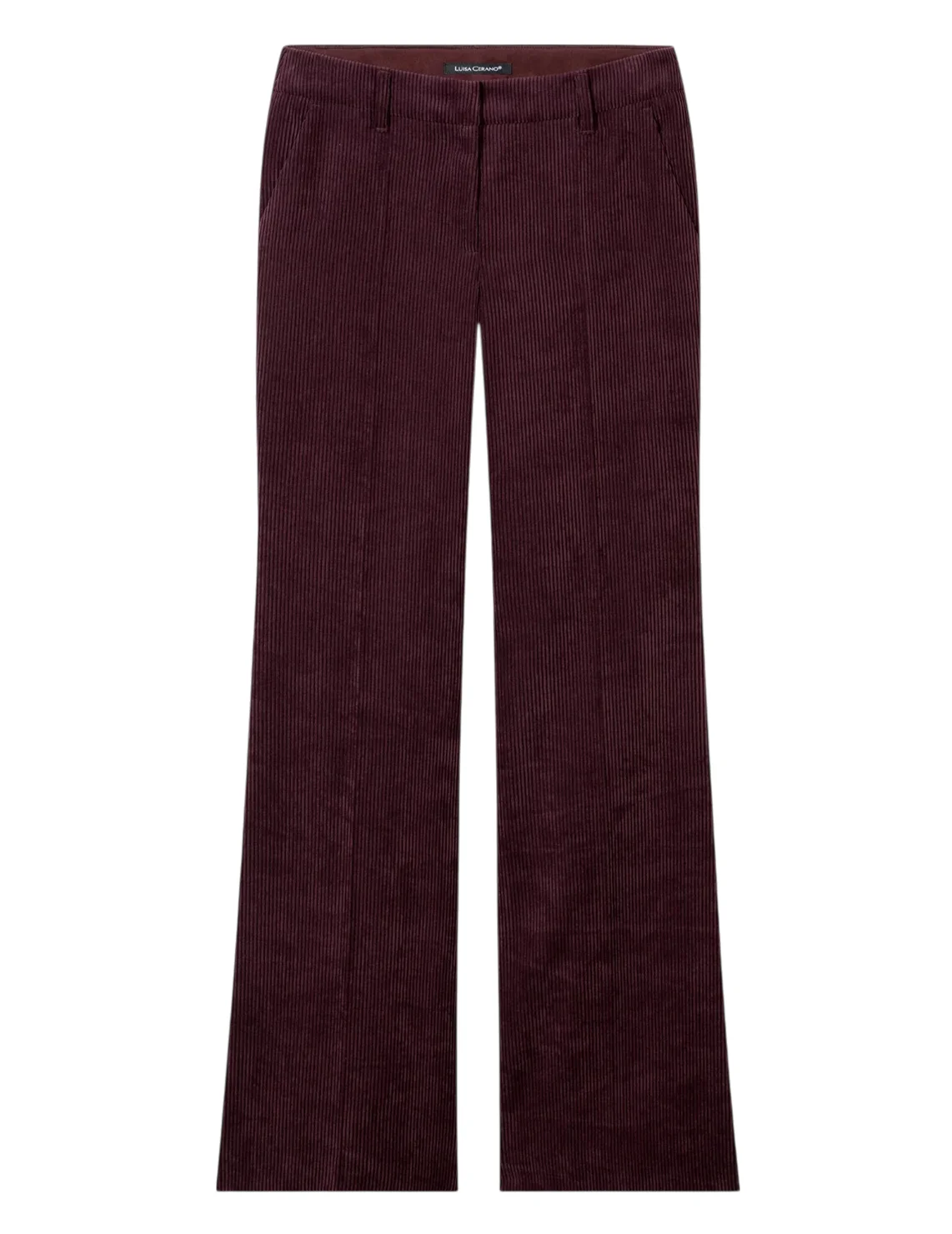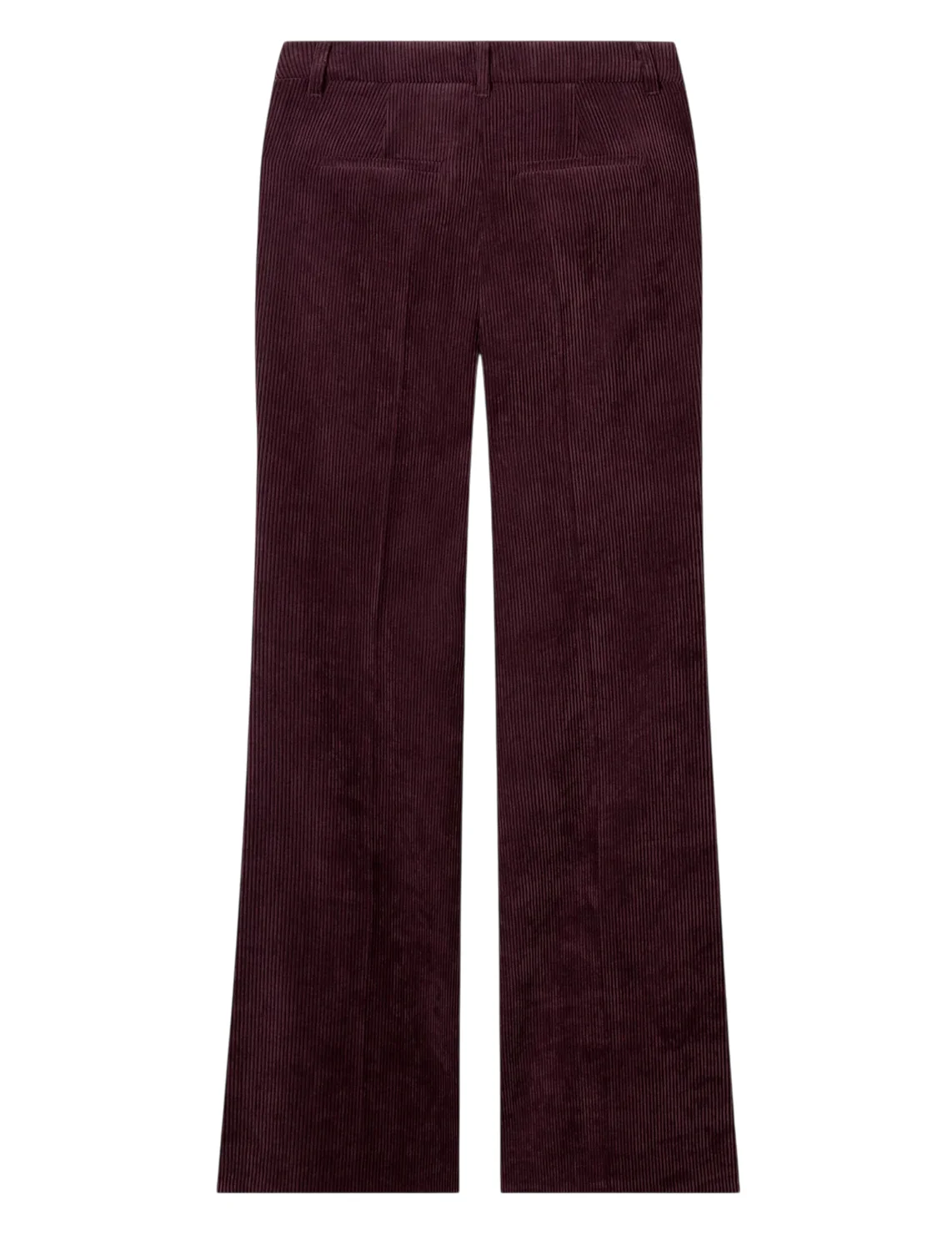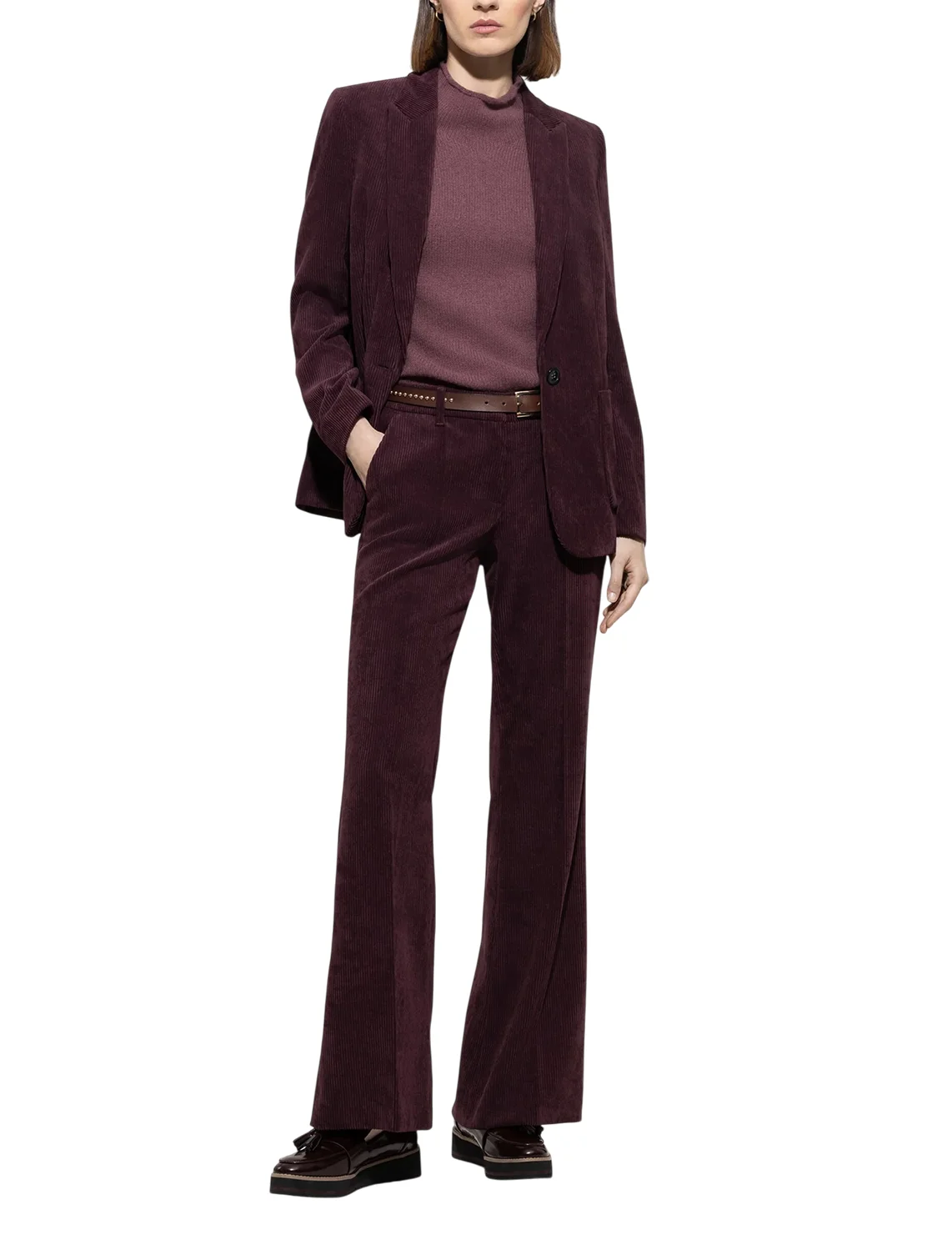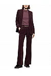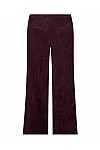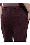 Штани виготовлені з поліестеру, поліаміду та еластану. Модель виконана в розкльошеному крої. Має приховану застібку-блискавку з гачком, шльовки для ременя, пресовані стрілки, а також пару бічних і пару задніх прорізних кишень.
