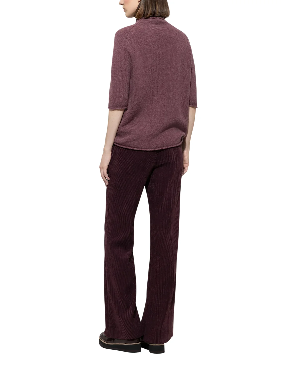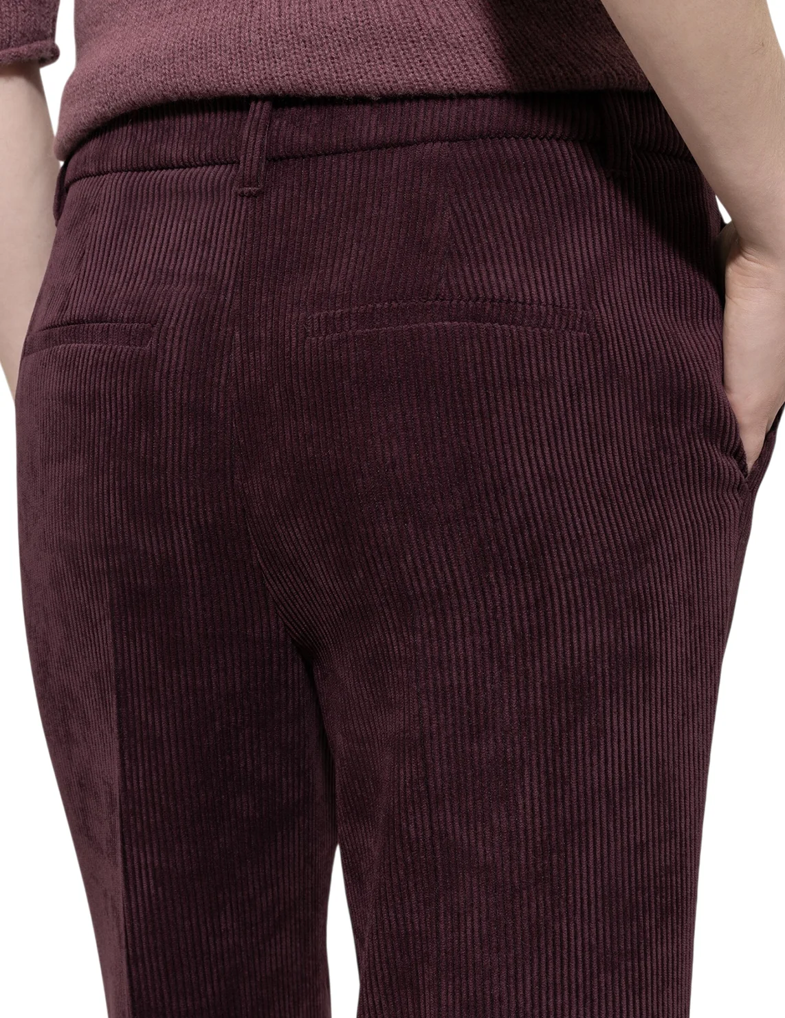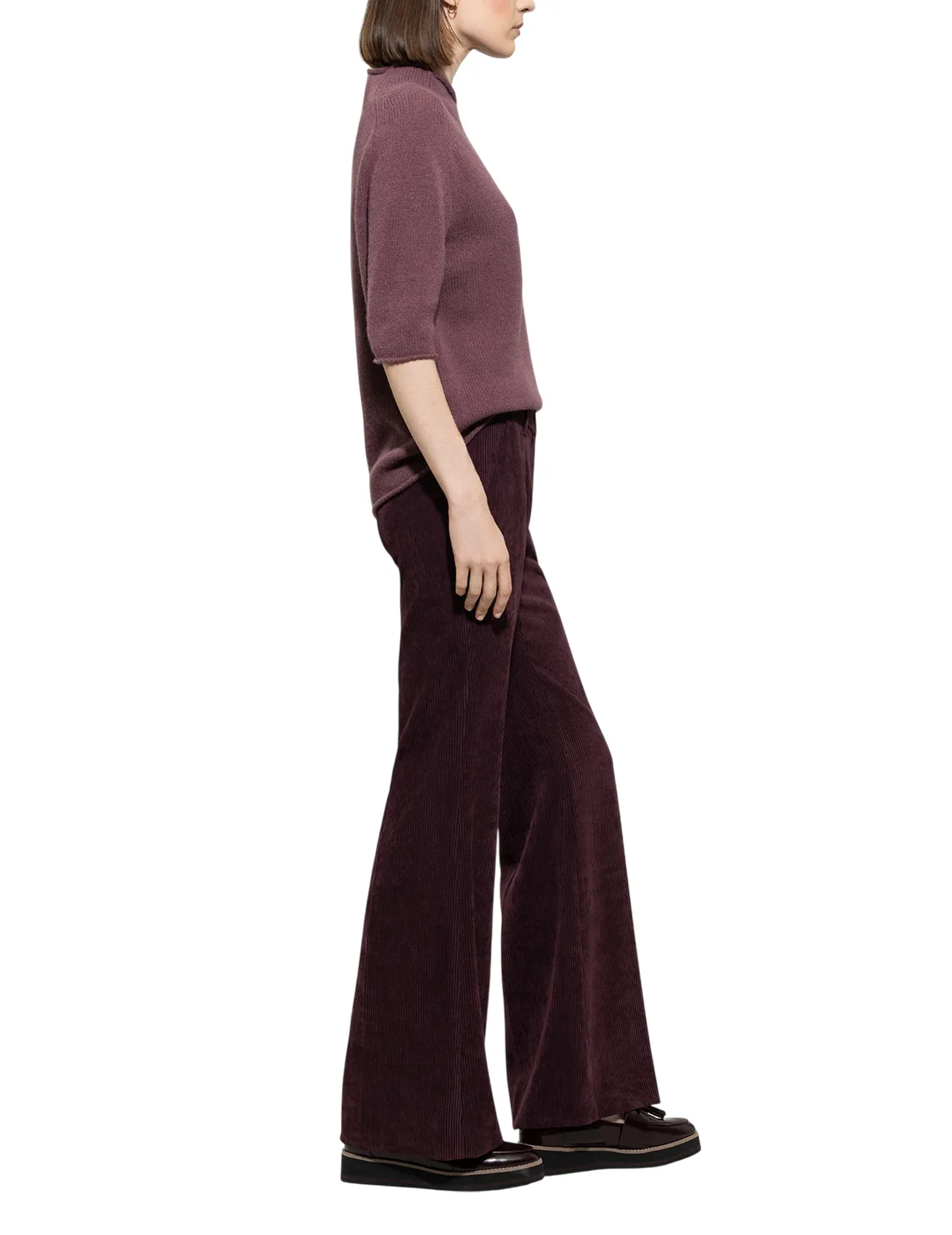 Штани виготовлені з поліестеру, поліаміду та еластану. Модель виконана в розкльошеному крої. Має приховану застібку-блискавку з гачком, шльовки для ременя, пресовані стрілки, а також пару бічних і пару задніх прорізних кишень.