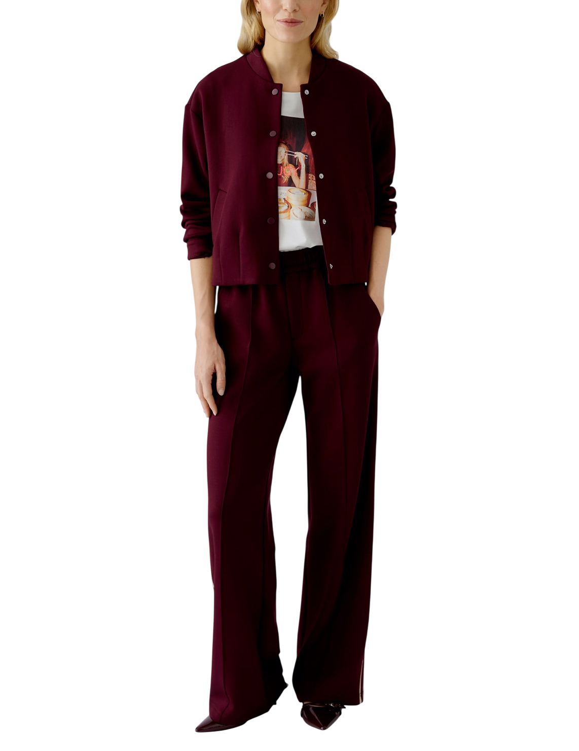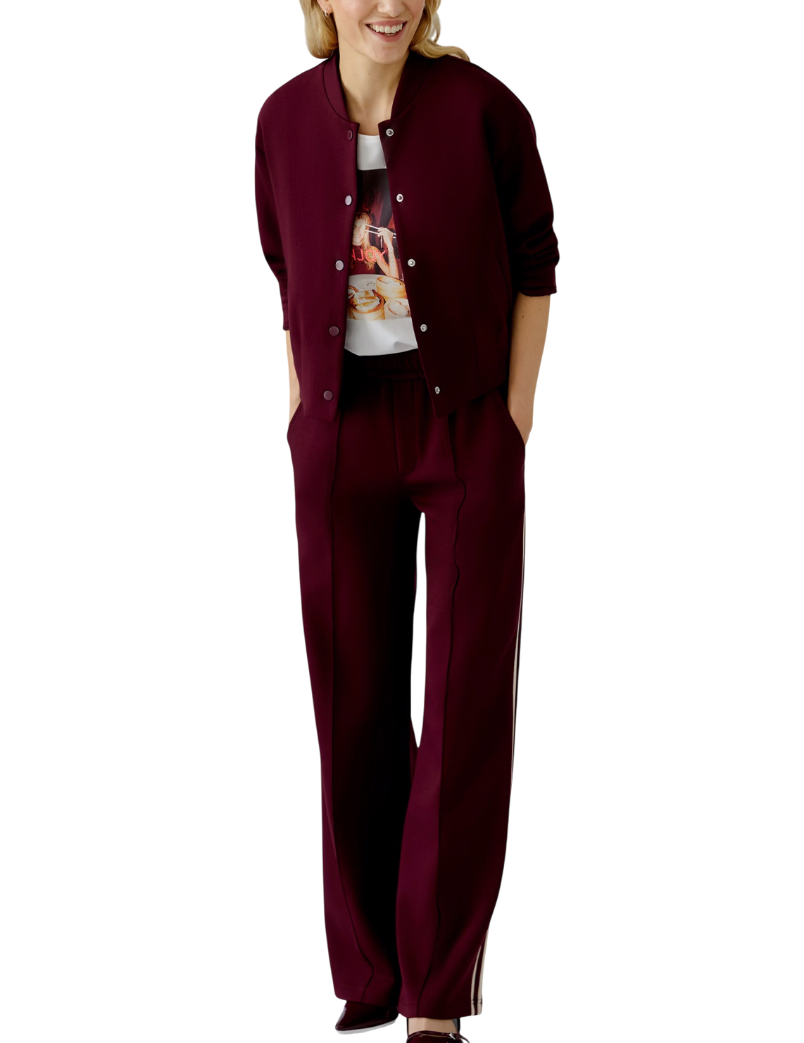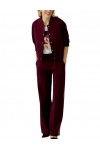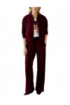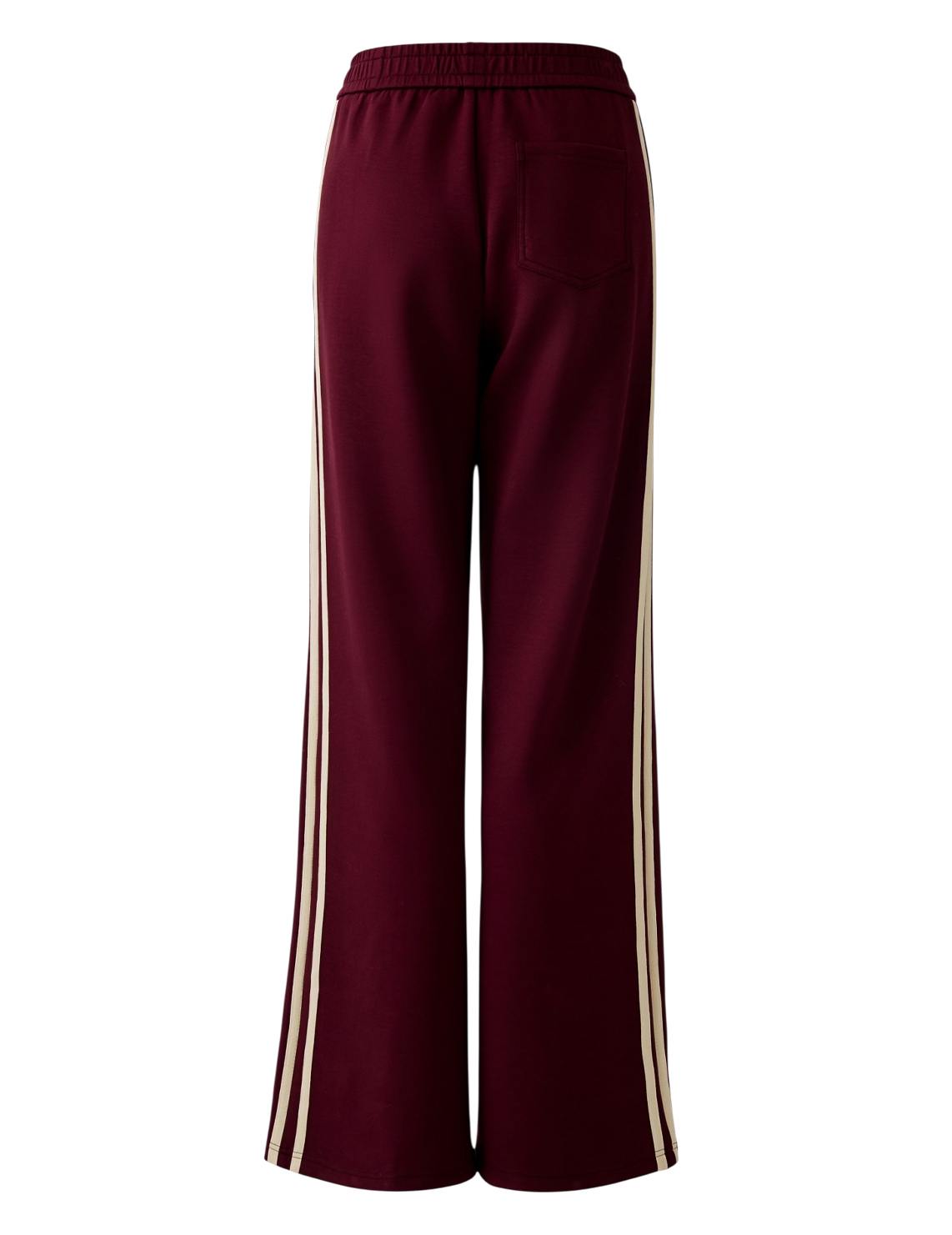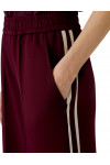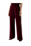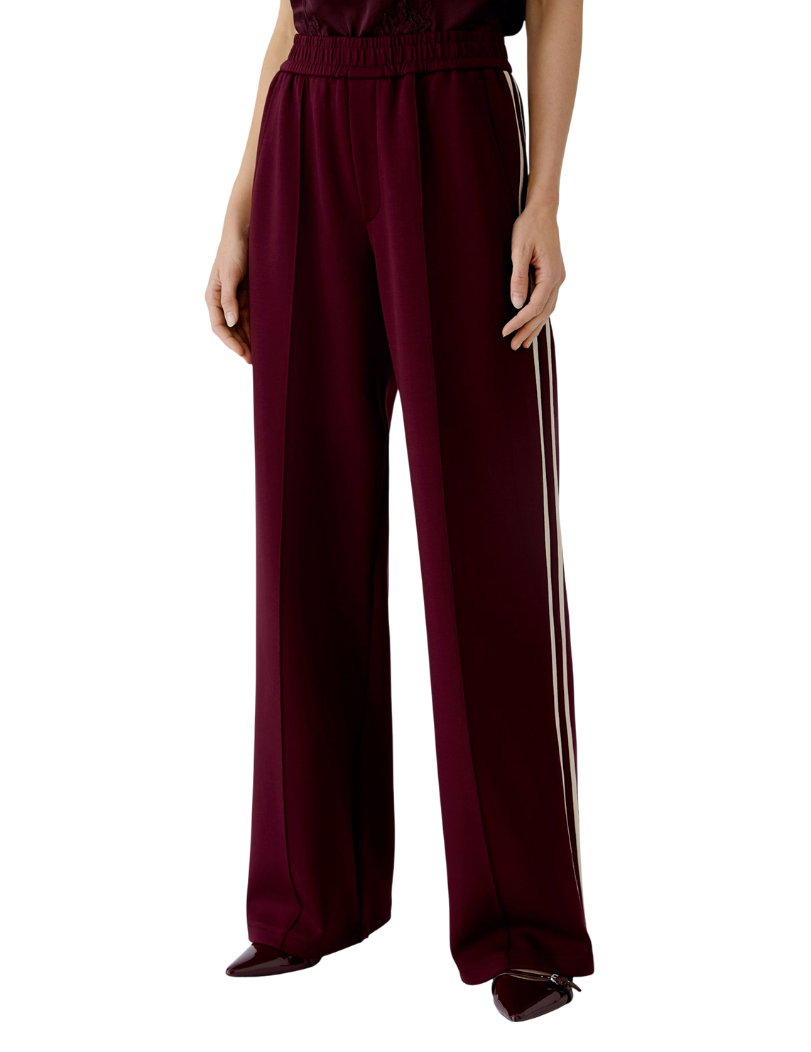 Штани виготовлені з поліестеру, віскози та еластану. Модель виконана у вільному крої. Має еластичний пояс, лампаси, прострочені стрілки, прорізні бічні кишені та задню накладну кишеню.