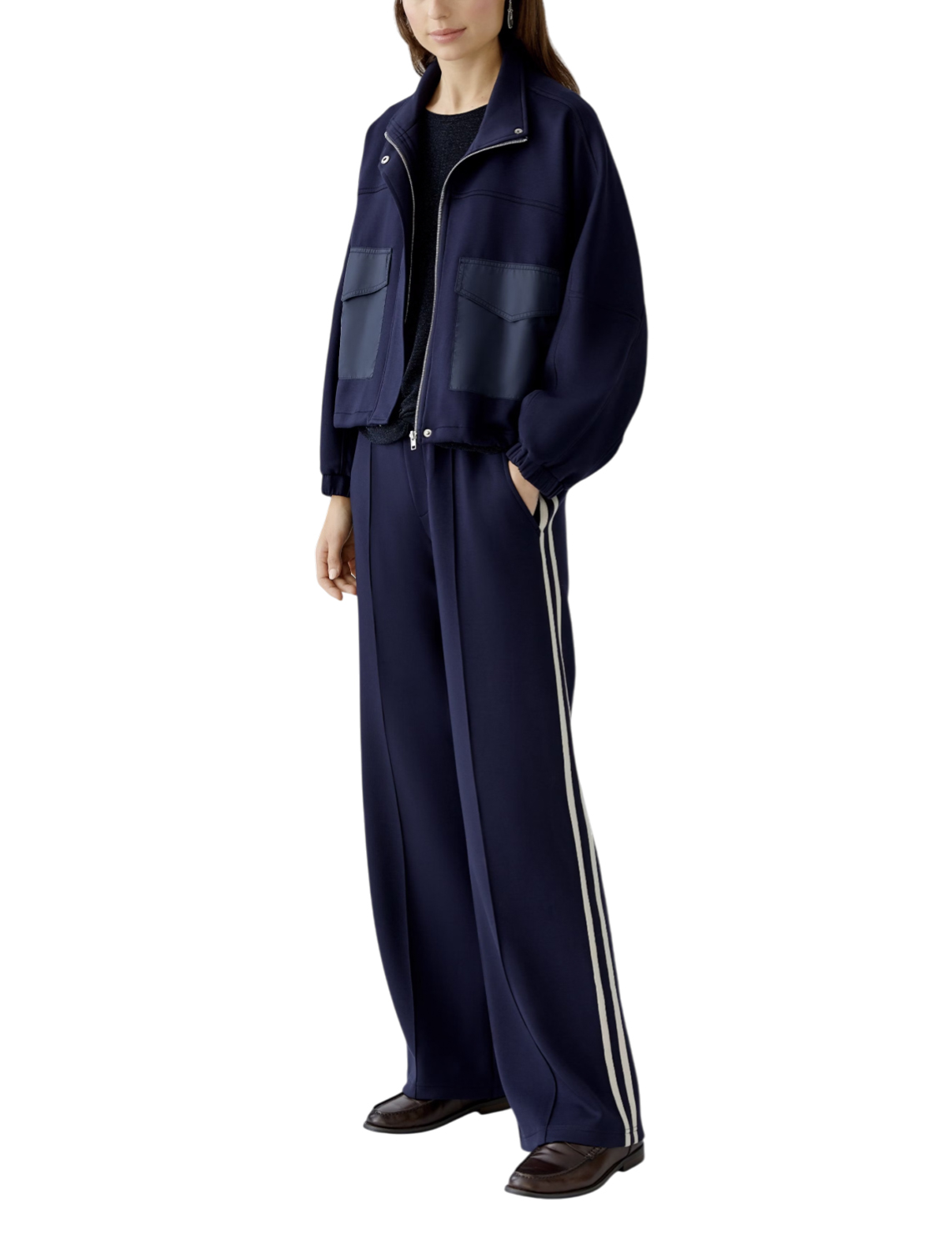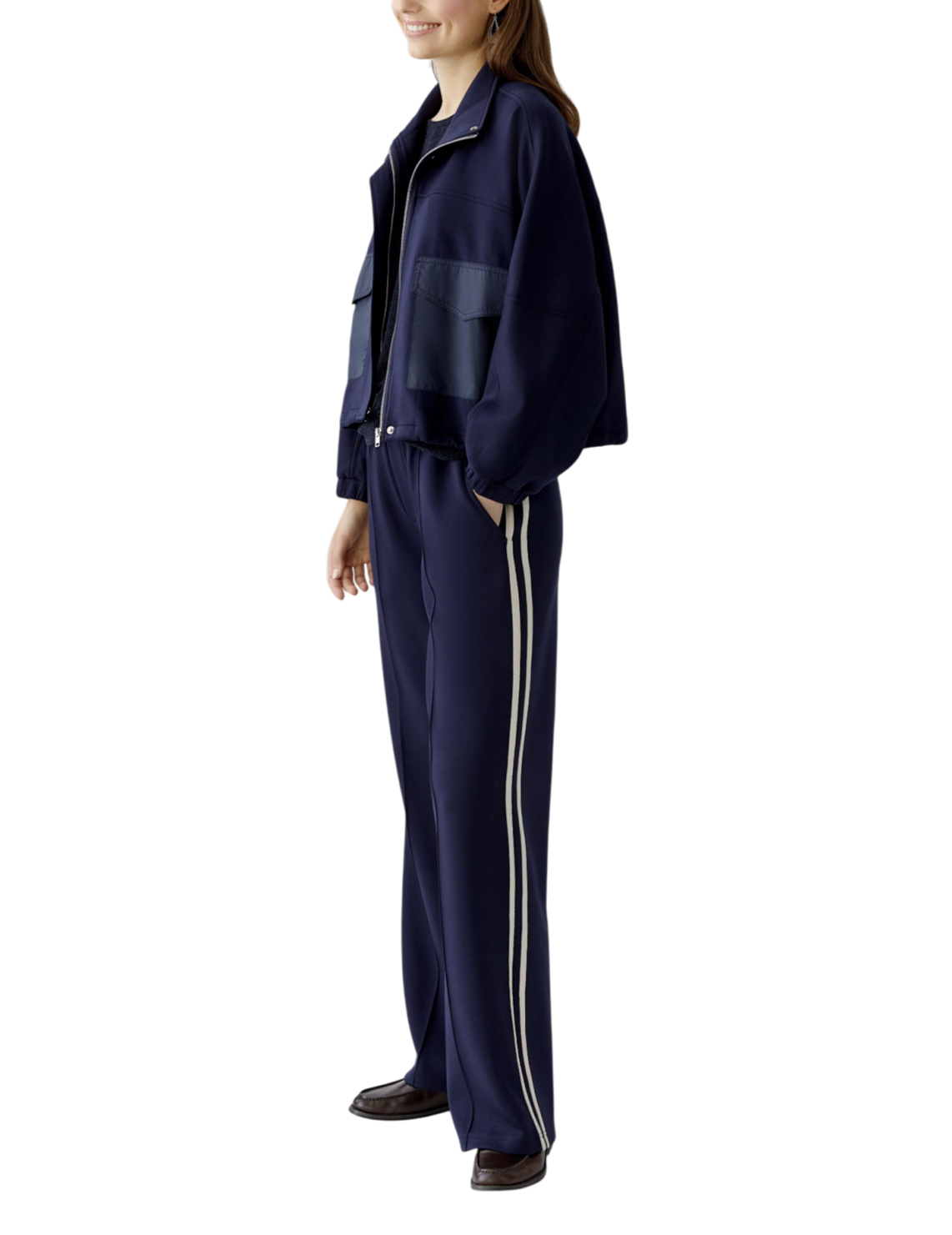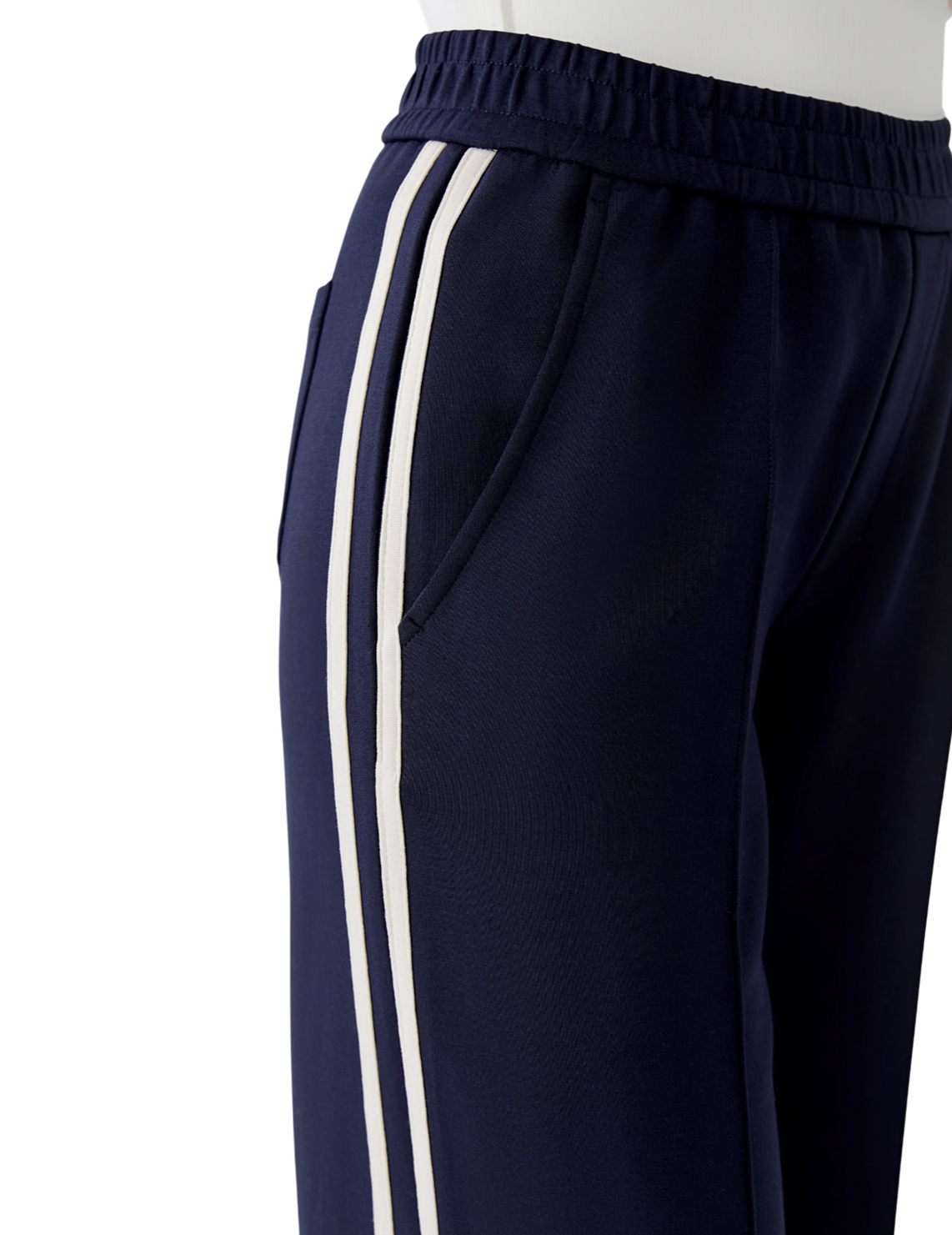 Штани виготовлені з поліестеру, віскози та еластану. Модель виконана у вільному крої. Має еластичний пояс, накладну кишеню ззаду, бічні прорізні кишені та прострочені стрілки. Декоровані лампасами