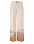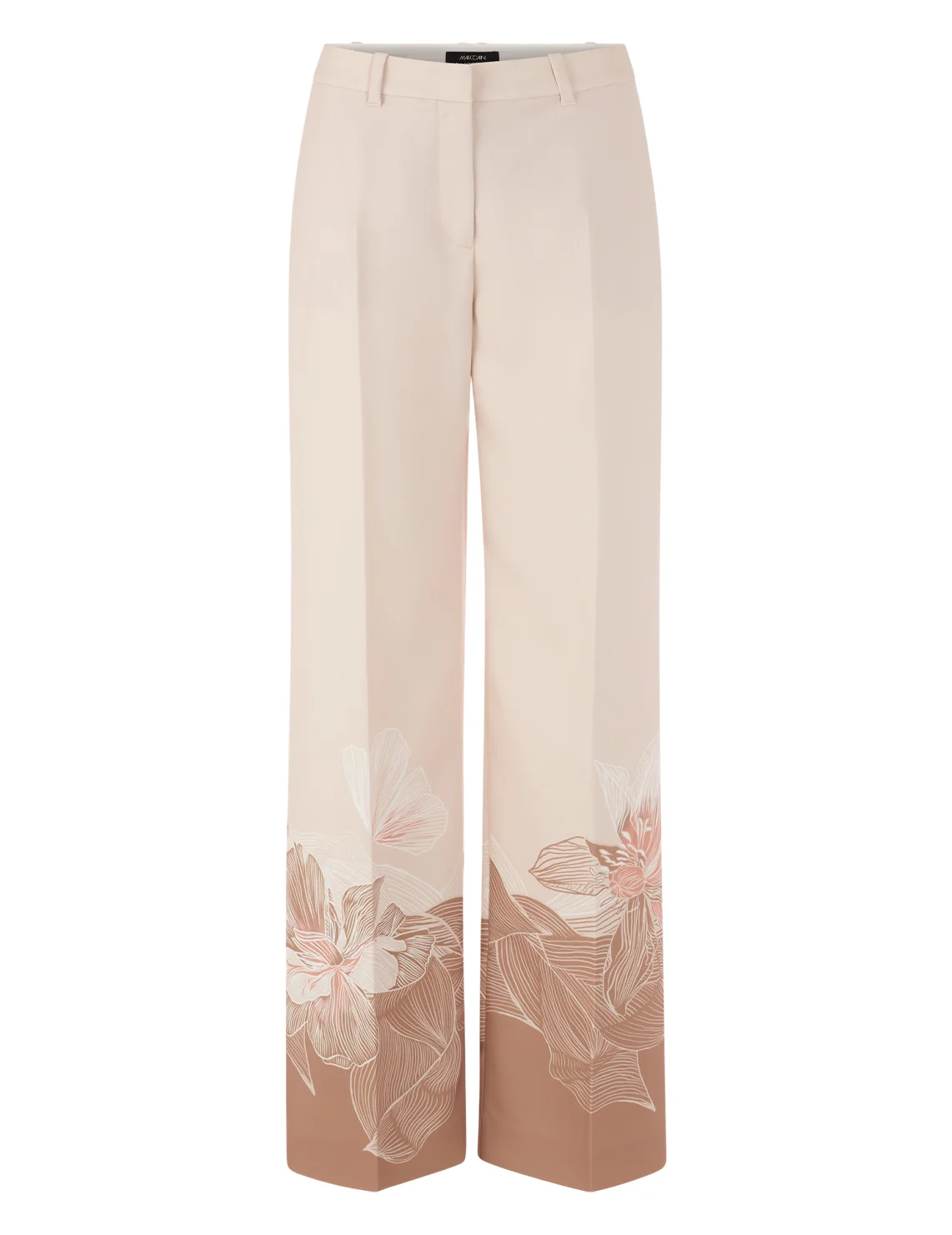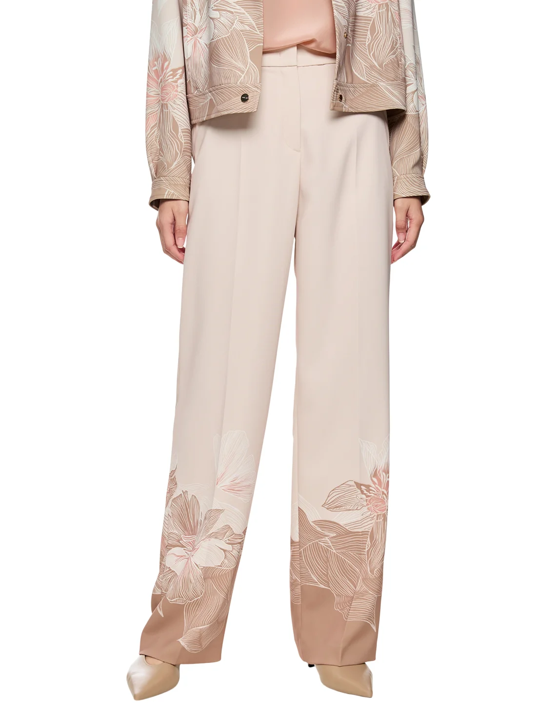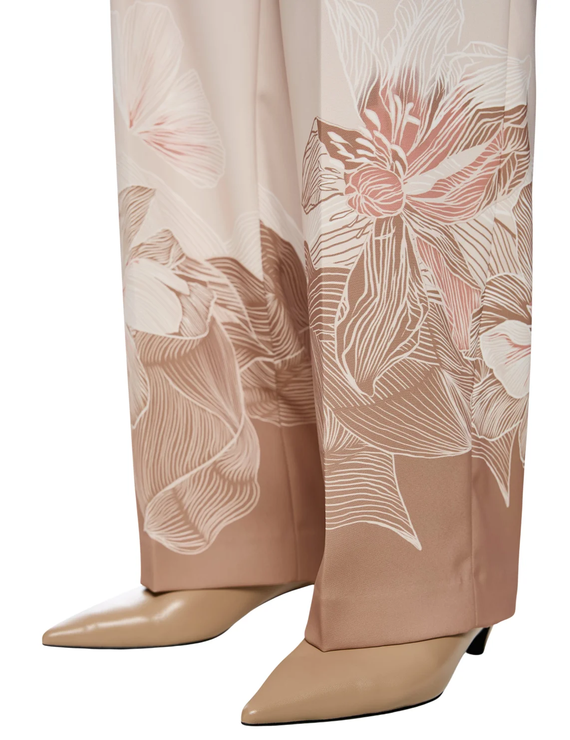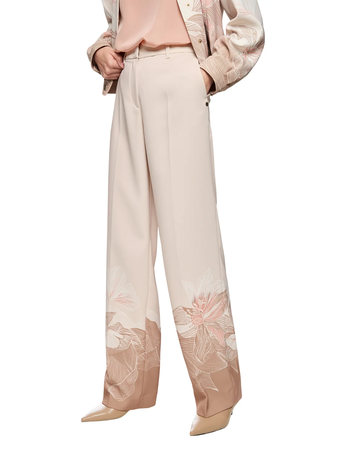 Штани виготовлені з поліестеру й еластану. Модель виконана у вільному крої. Має петлі для ременя, приховану застібку-блискавку з гачком, пресовані стрілки, прорізні бічні та декоративні задні кишені. Декоровані квітковим принтом.