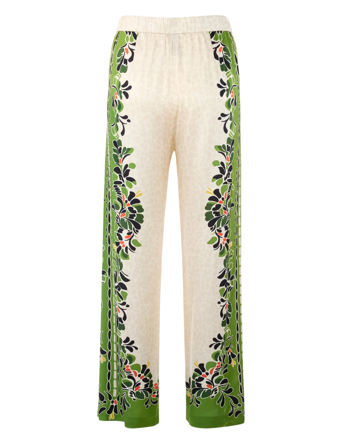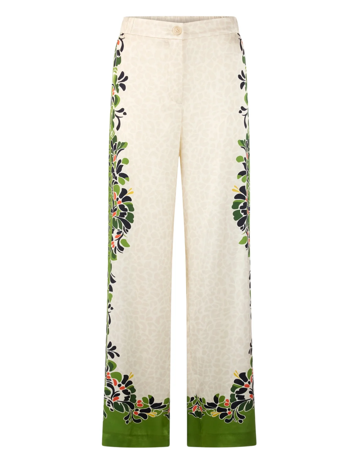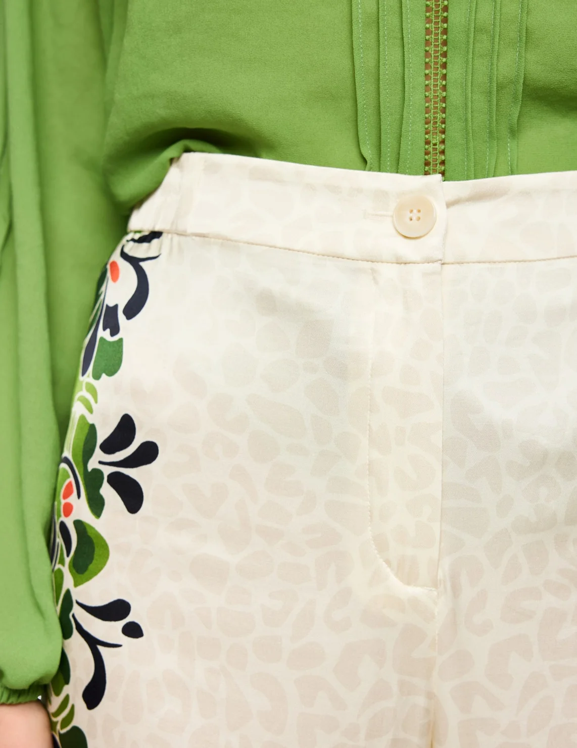 Штани виготовлені з віскози та еластану. Модель виконана в широкому крої. Має застібку-блискавку та ґудзик, еластичну вставку. Декоровано оригінальним принтом.