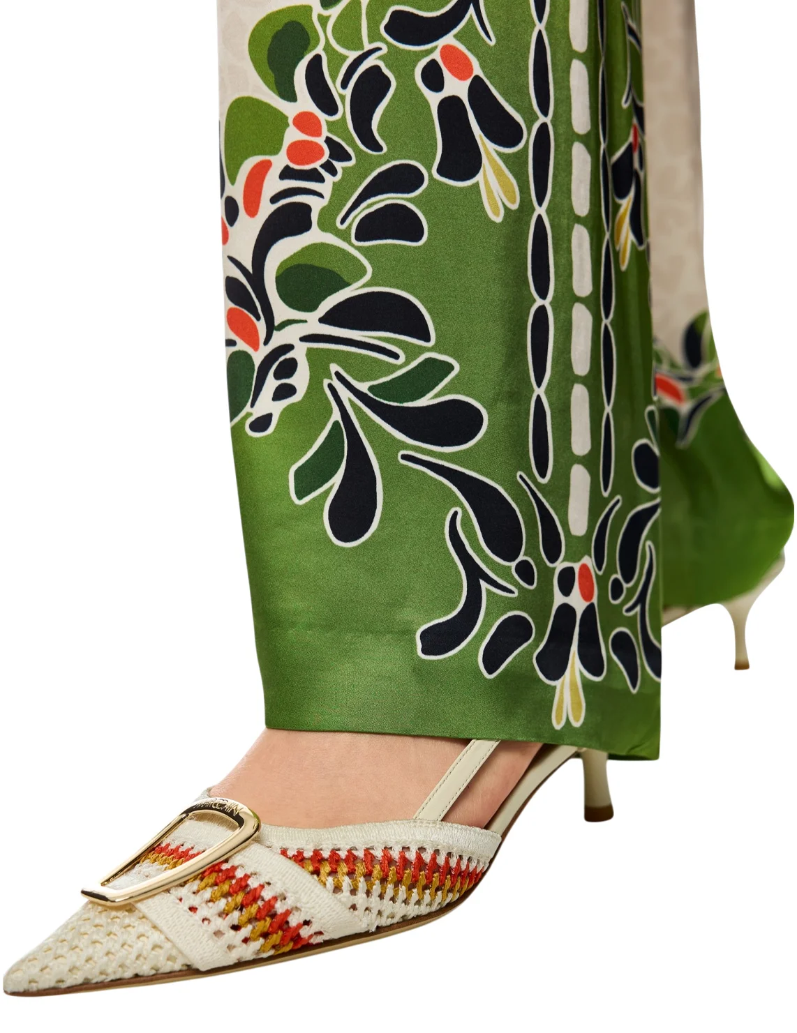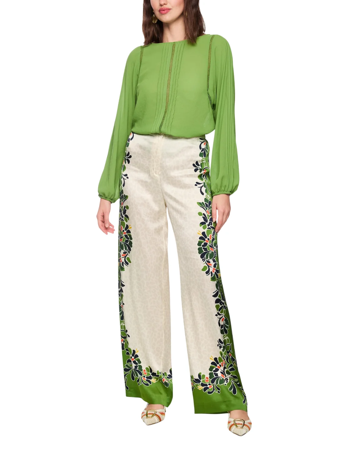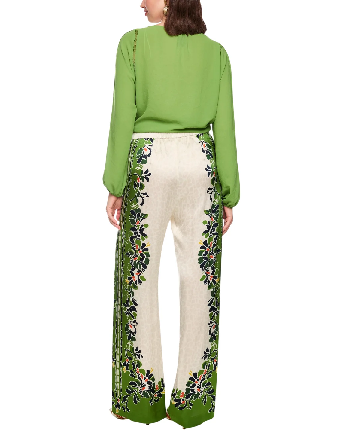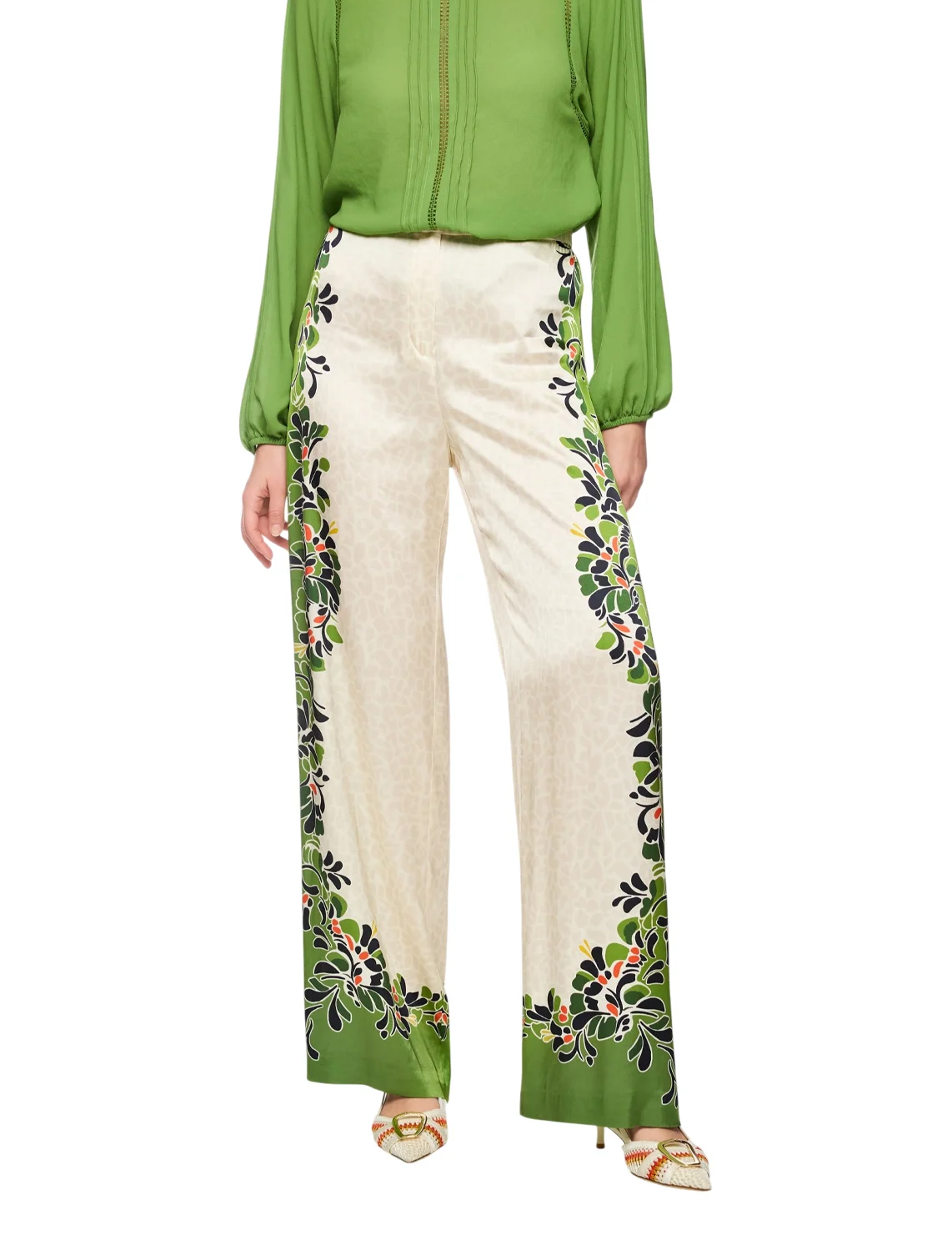 Штани виготовлені з віскози та еластану. Модель виконана в широкому крої. Має застібку-блискавку та ґудзик, еластичну вставку. Декоровано оригінальним принтом.