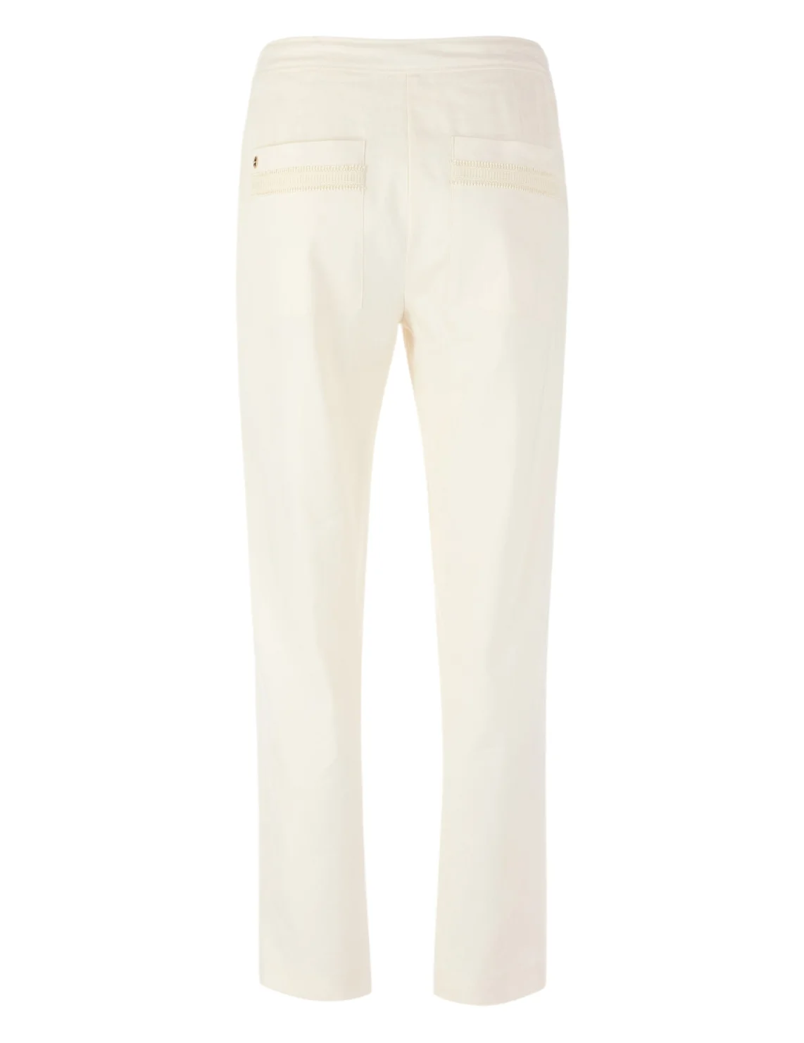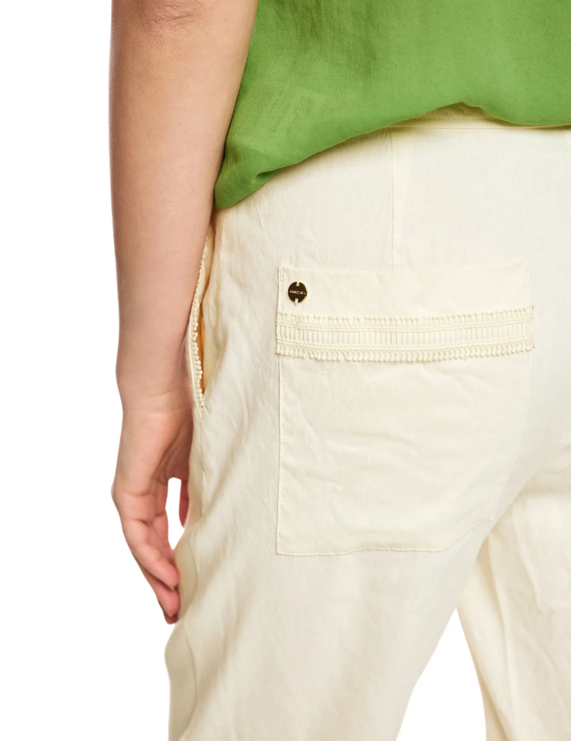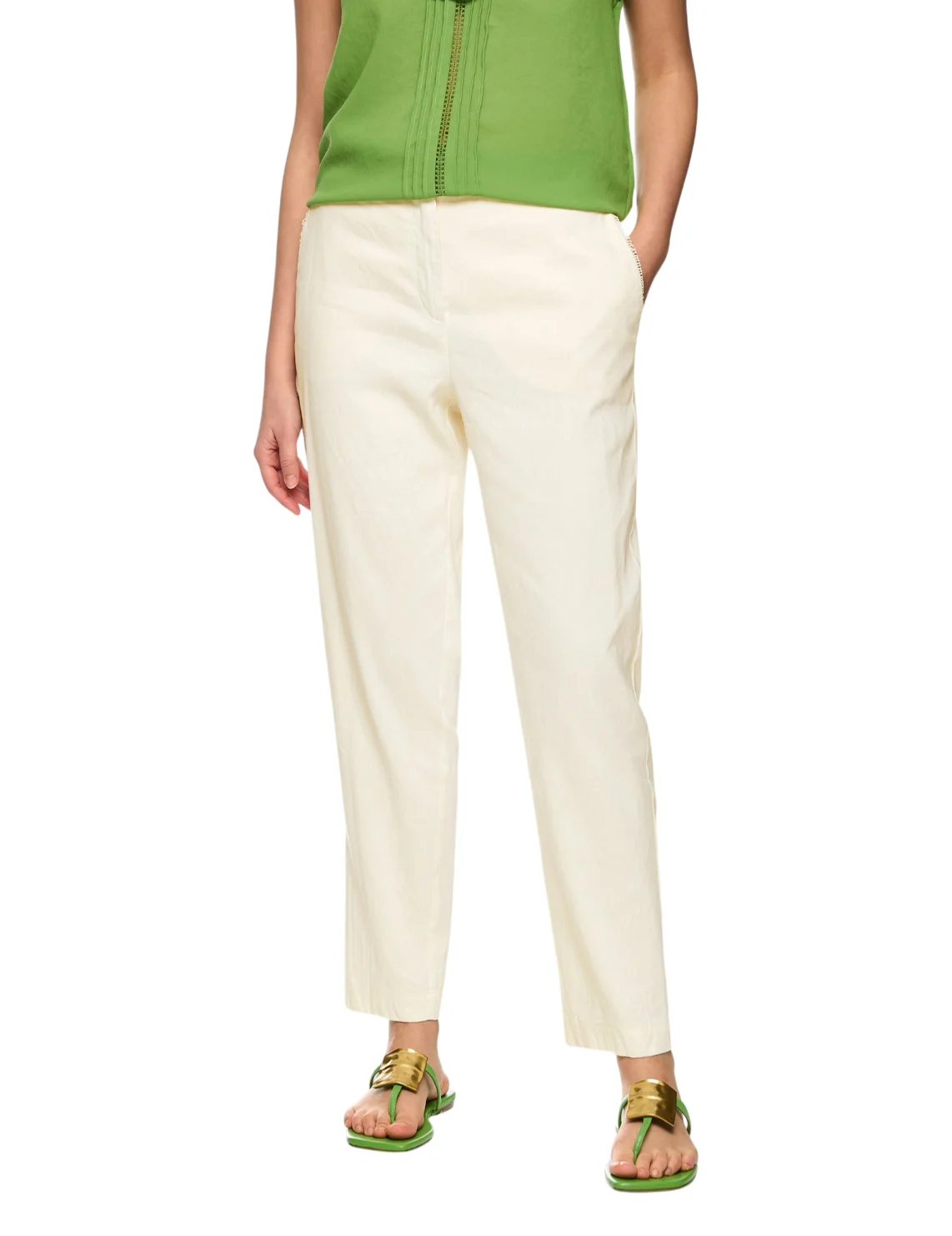 Штани виготовлені з льону, віскози та еластану. Модель виконана в прямому крої. Має застібку на блискавці та ґудзику, передні прорізні та задні накладні кишені.