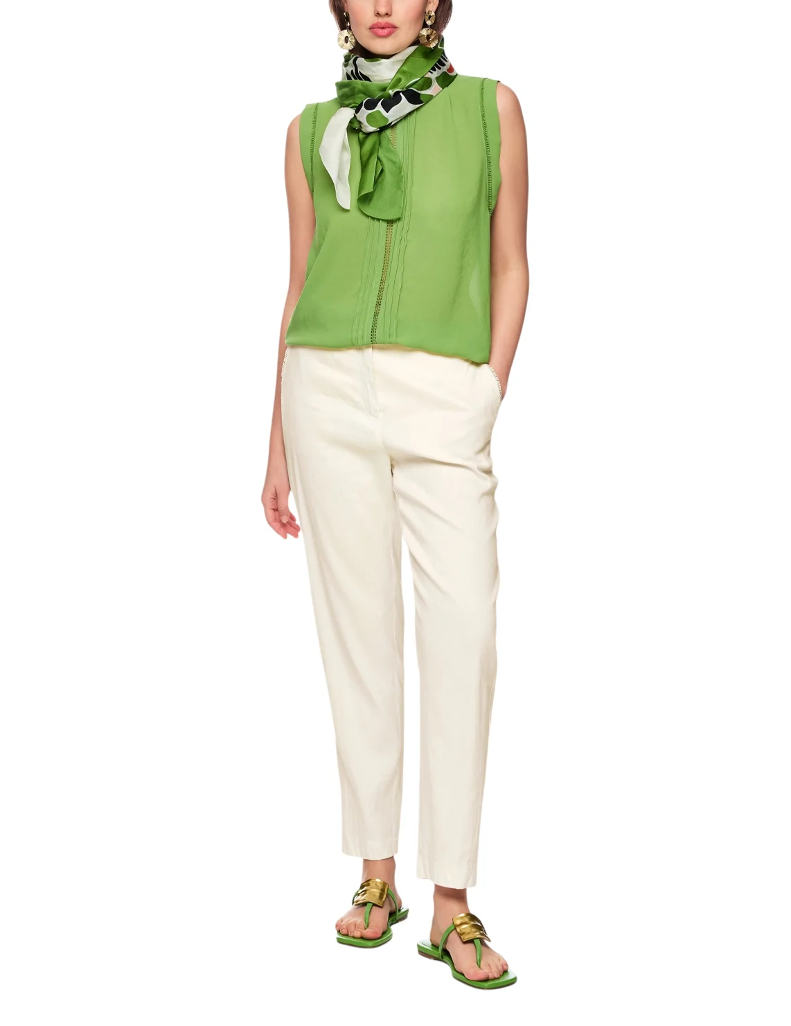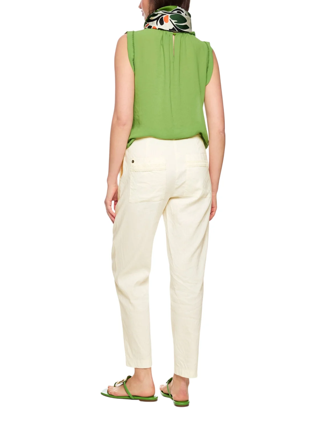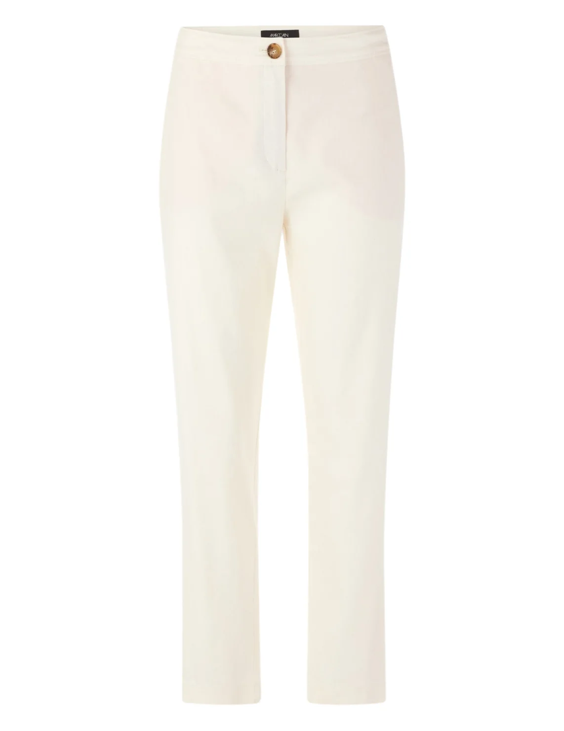Штани виготовлені з льону, віскози та еластану. Модель виконана в прямому крої. Має застібку на блискавці та ґудзику, передні прорізні та задні накладні кишені.