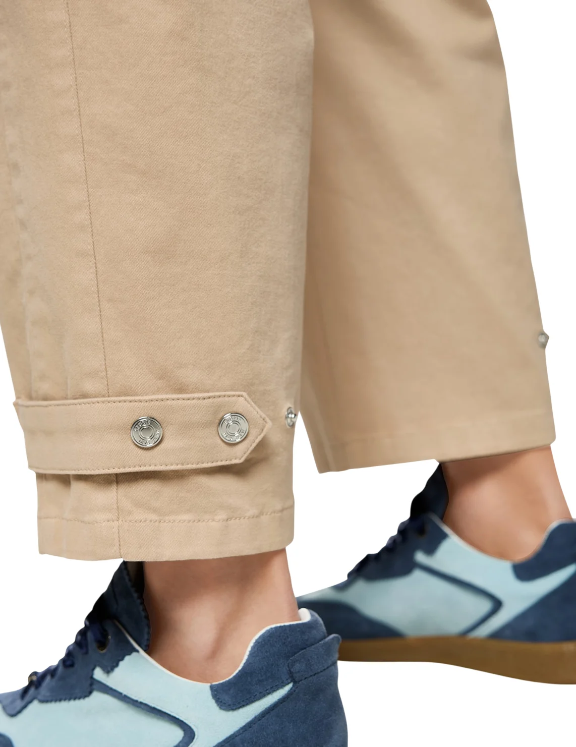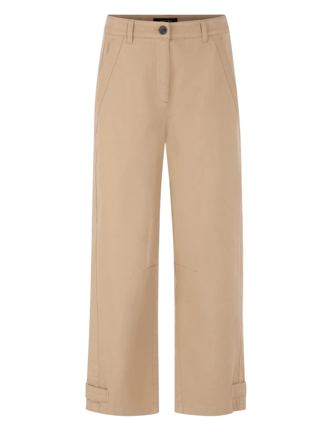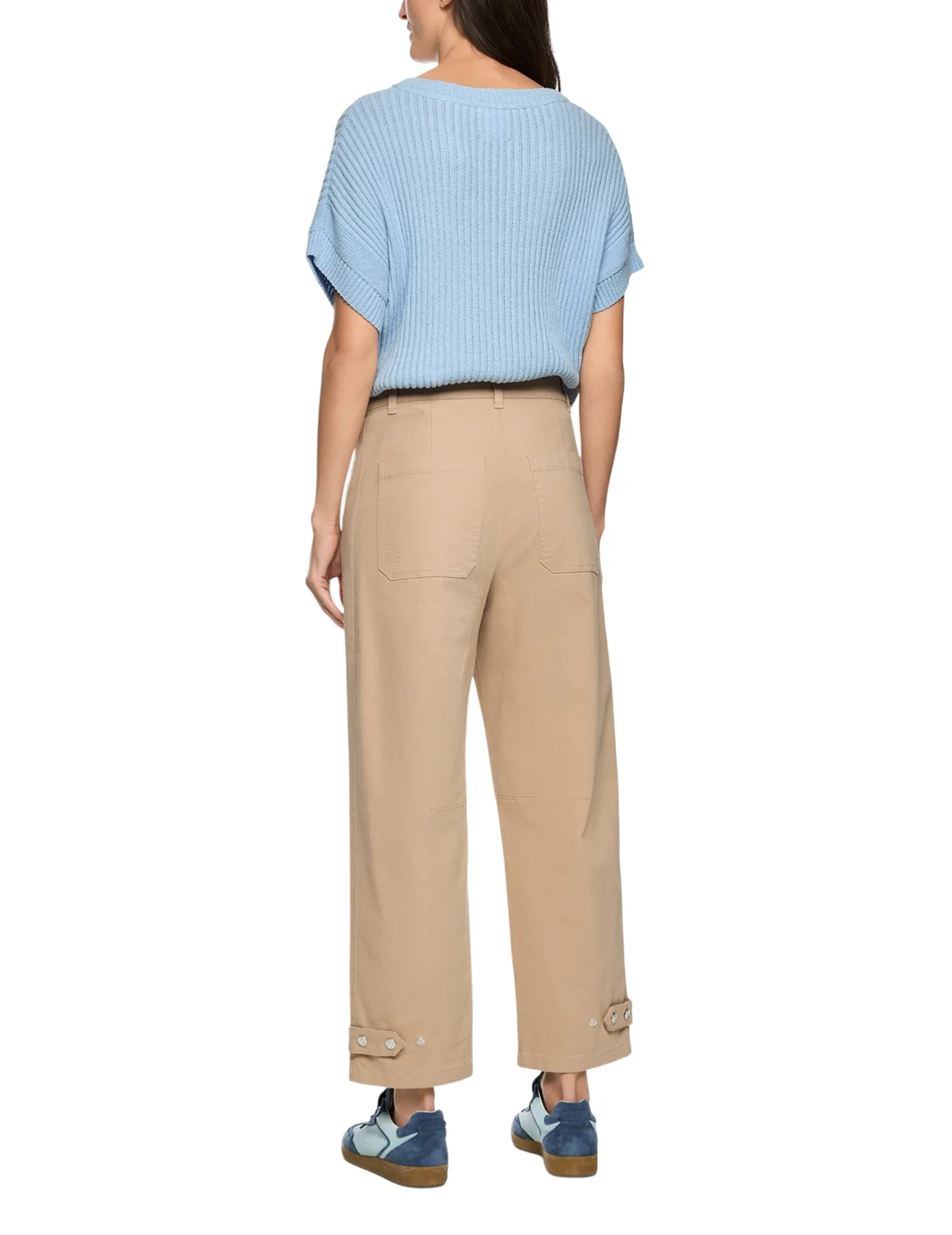 Штани виготовлені з бавовни та еластану. Модель виконана у вільному крої. Має петлі для ременя, приховану застібку-блискавку з ґудзиком, манжети на кнопках, прорізні бічні та накладні задні кишені.