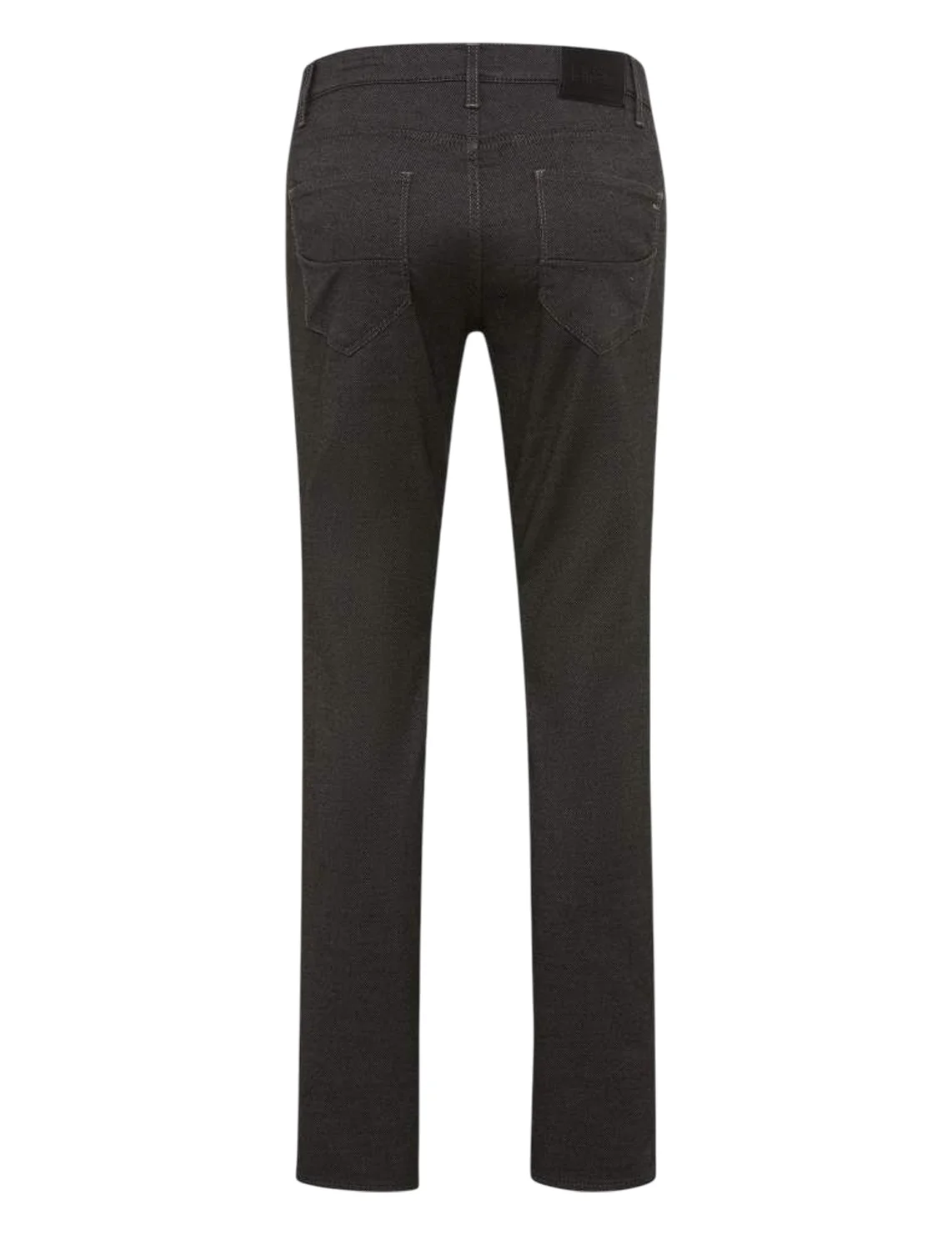 Штани виготовлені з бавовни, поліестеру, віскози та еластану. Модель виконана в прямому крої. Має петлі для ременя, потайну застібку-блискавку з ґудзиком, дві прорізні передні та дві накладні задні кишені.