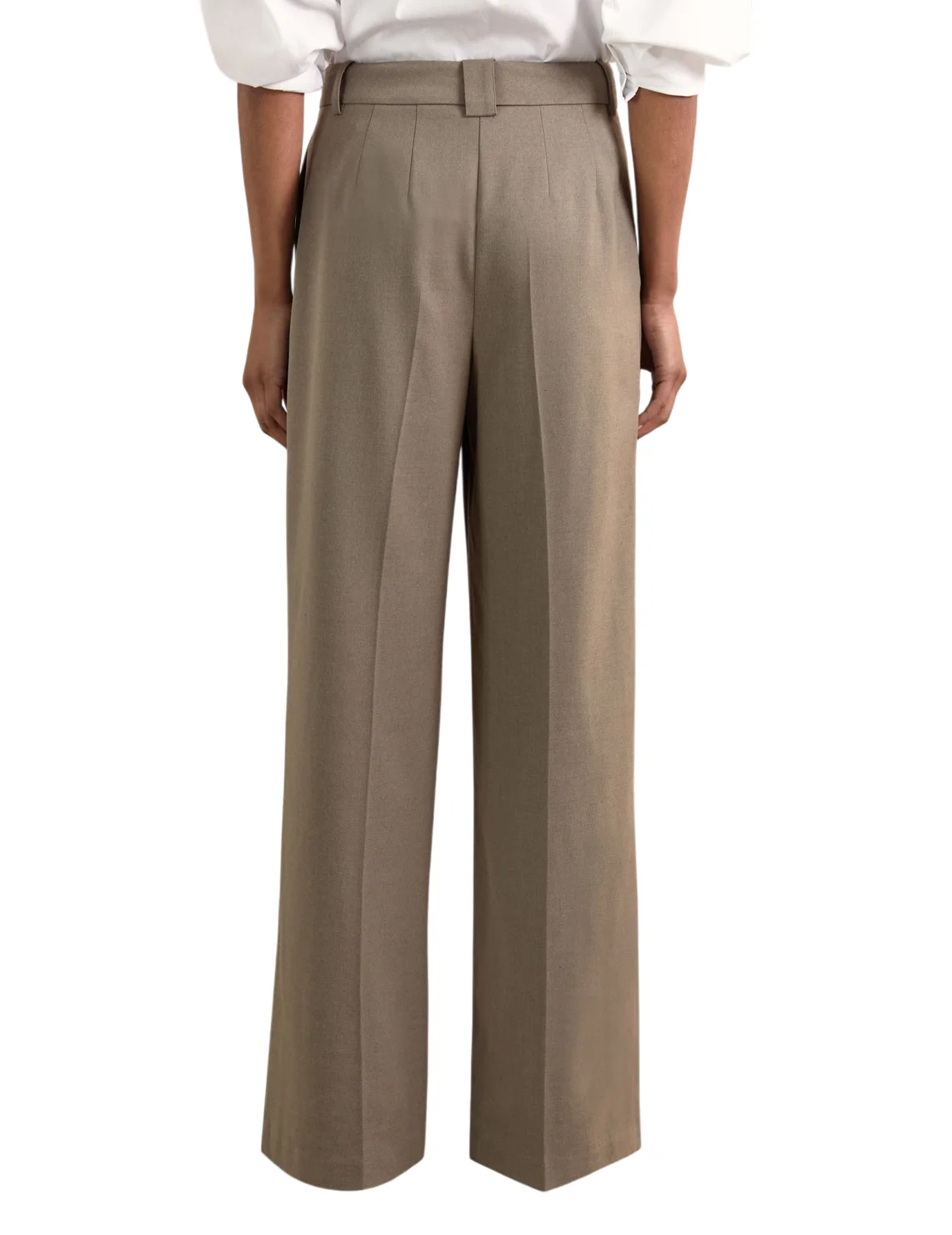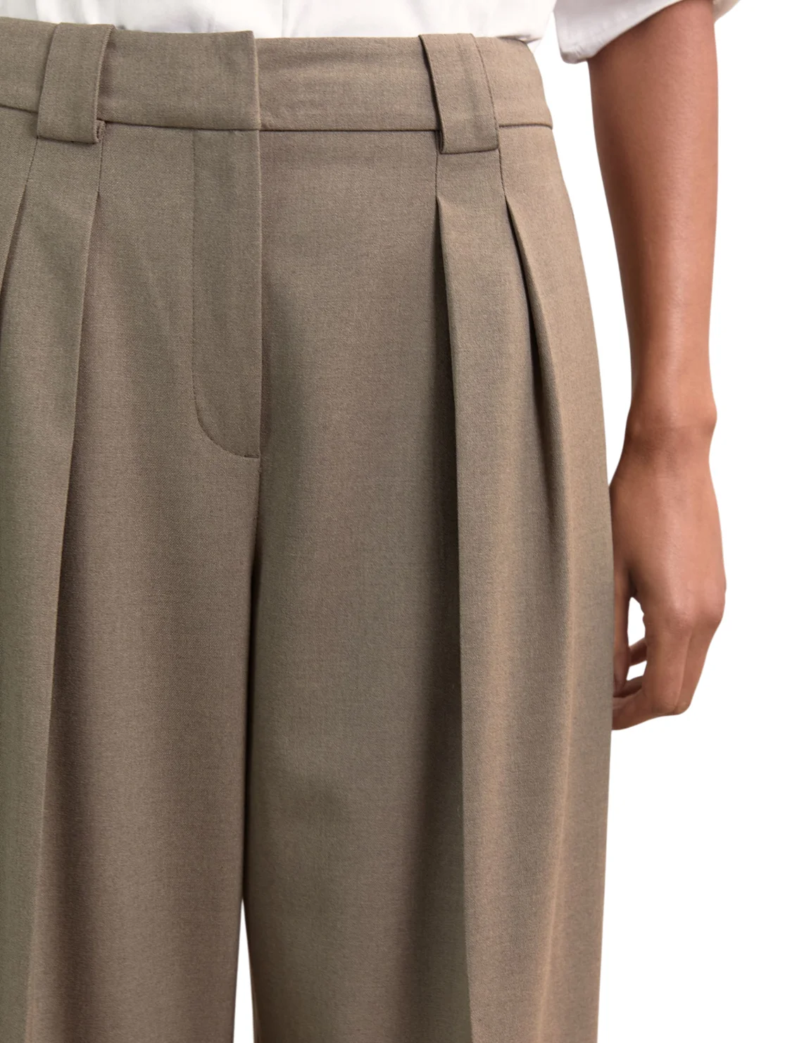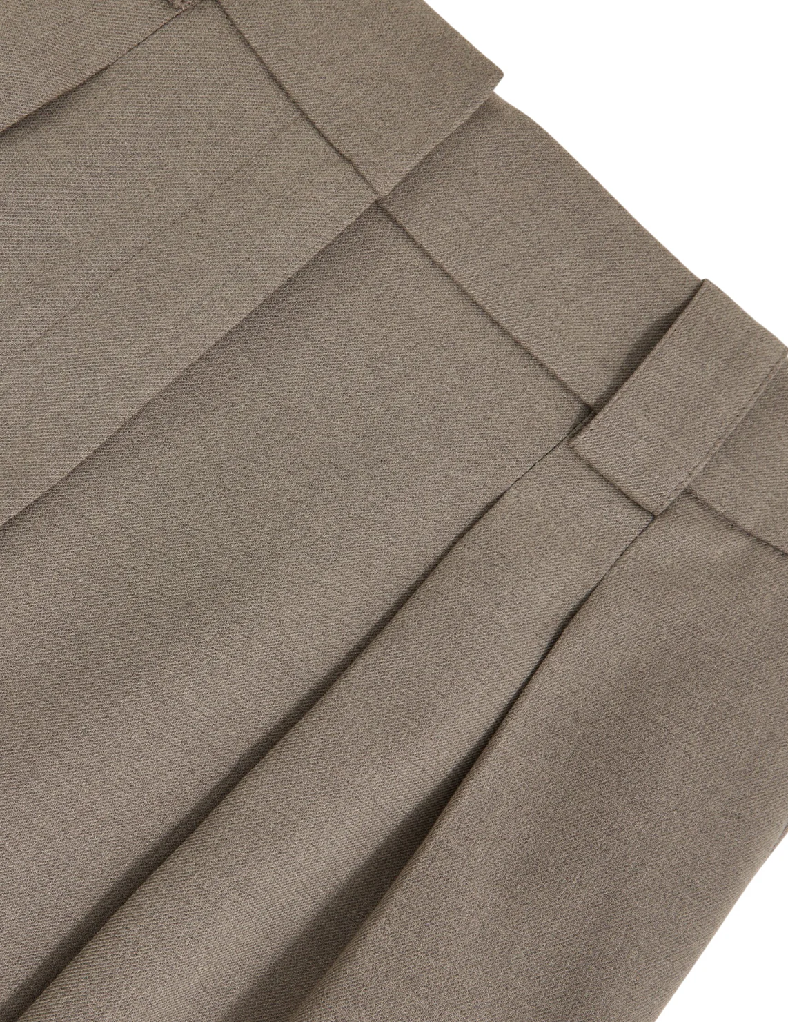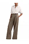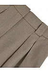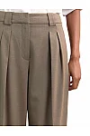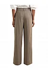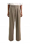 Штани виготовлені з поліестеру, віскози та еластану. Модель виконана у вільному крої. Має приховану застібку-блискавку з гачком, шльовки для ременя, подвійні передні складки, пресовані стрілки та прорізні бічні кишені.
