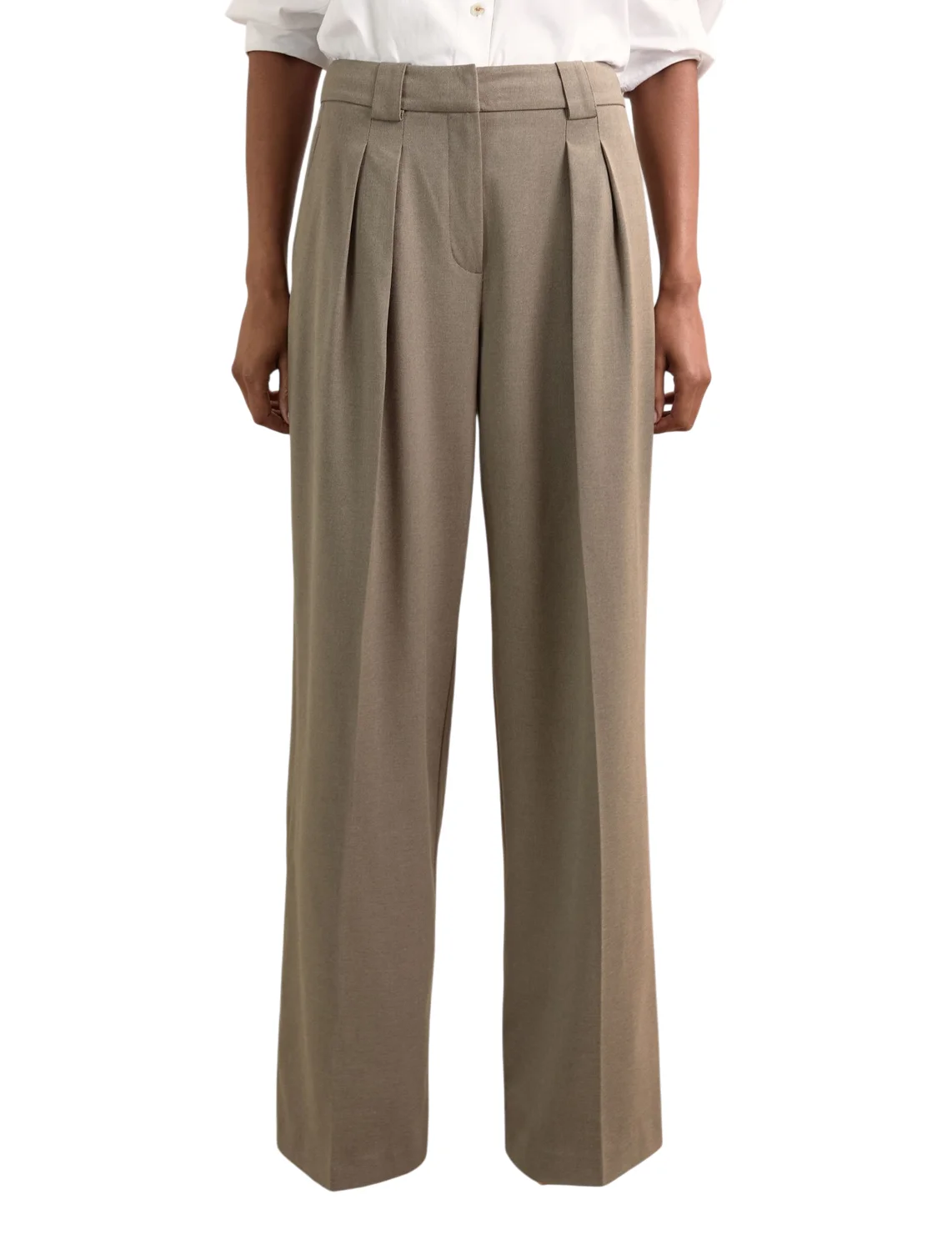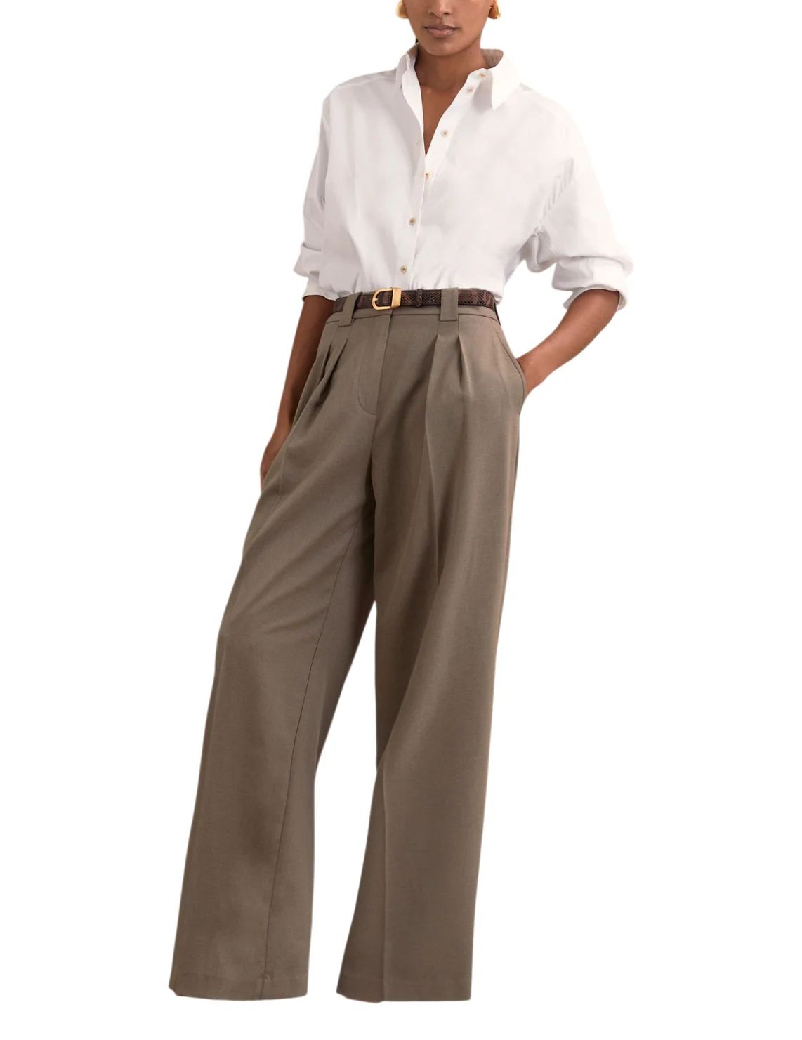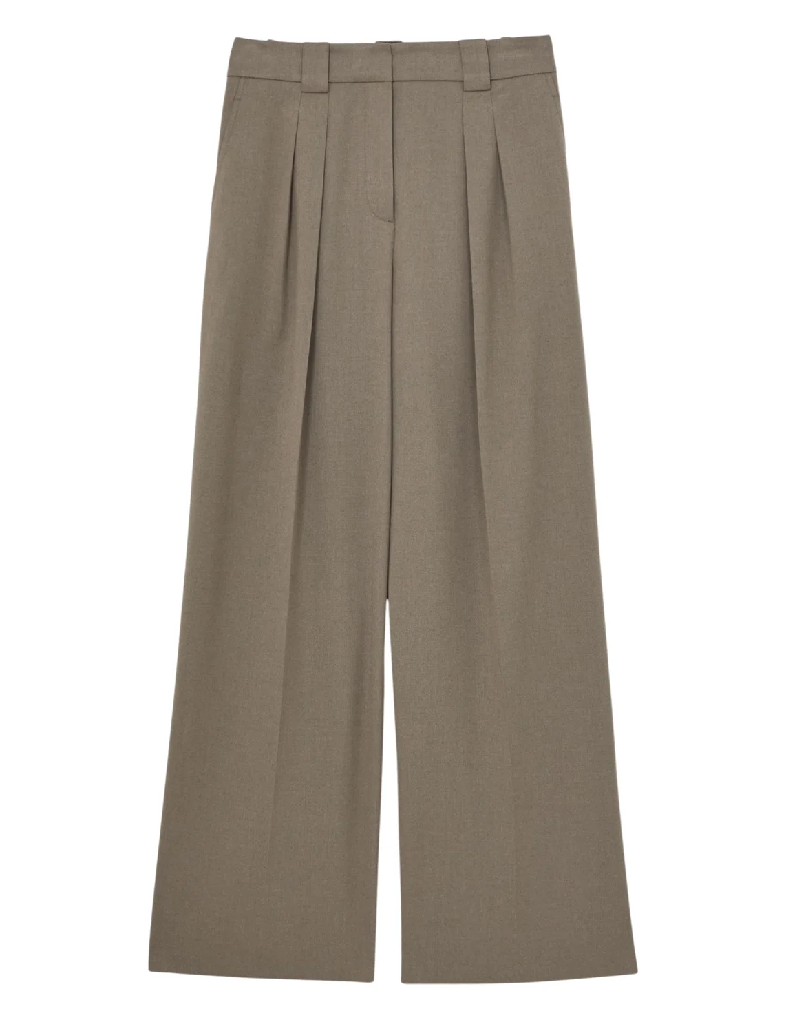 Штани виготовлені з поліестеру, віскози та еластану. Модель виконана у вільному крої. Має приховану застібку-блискавку з гачком, шльовки для ременя, подвійні передні складки, пресовані стрілки та прорізні бічні кишені.