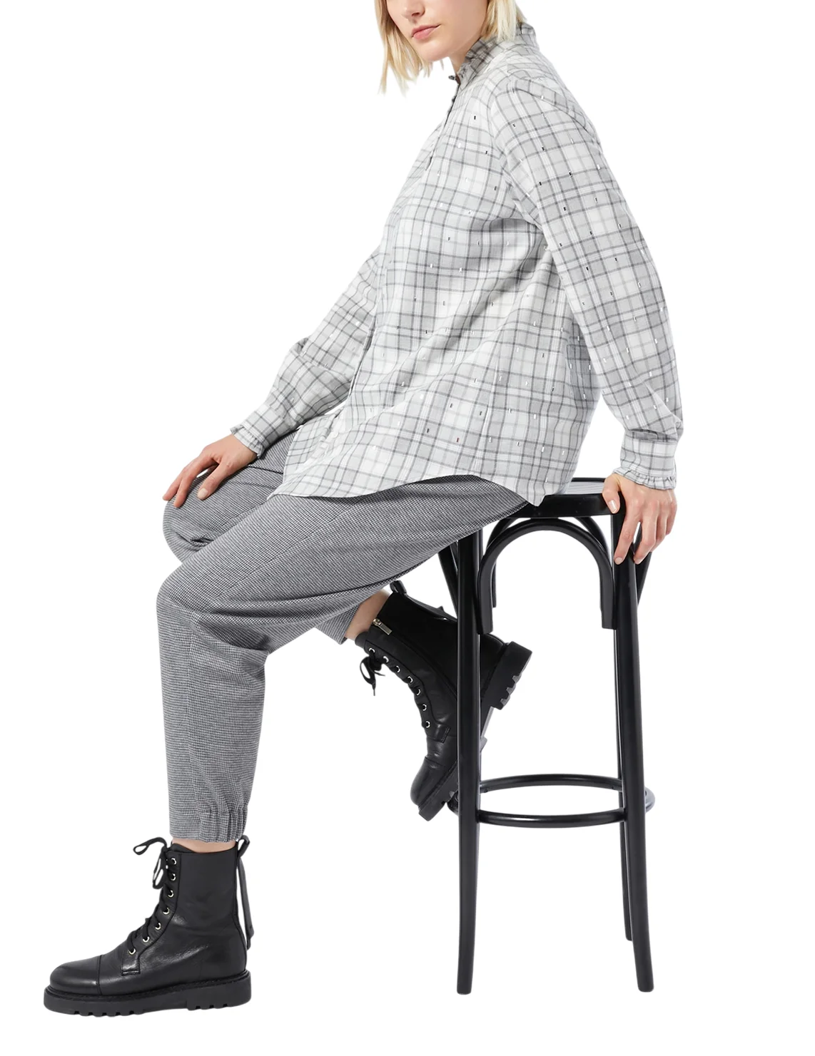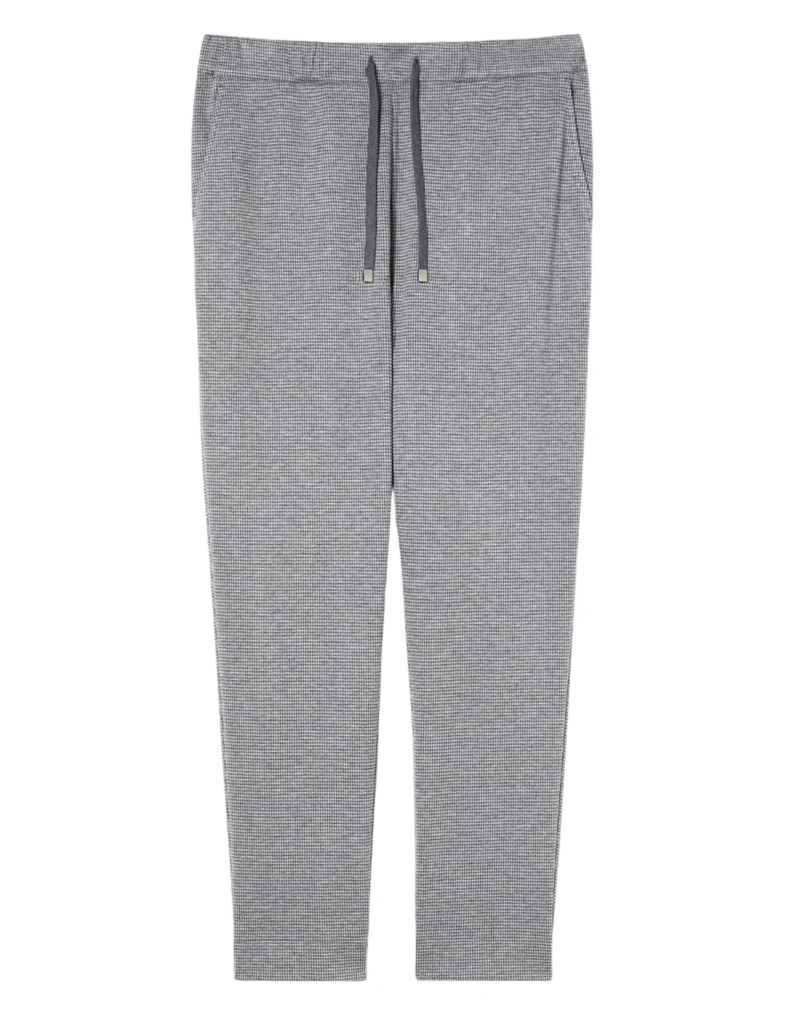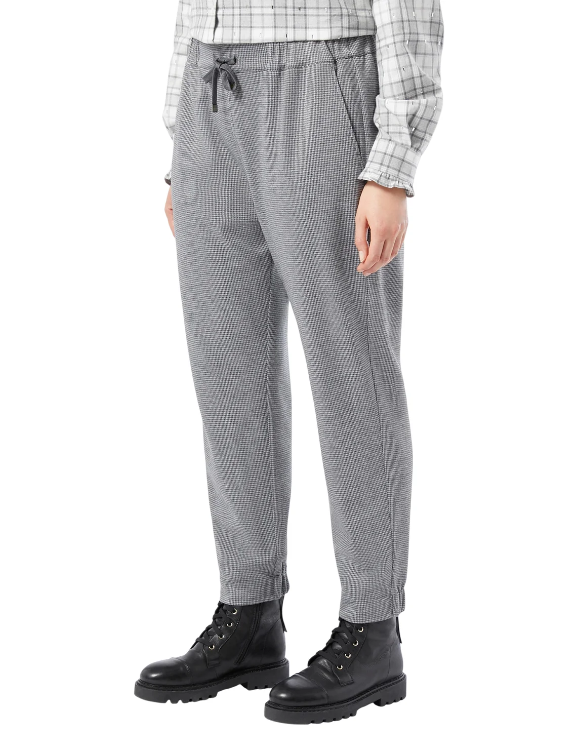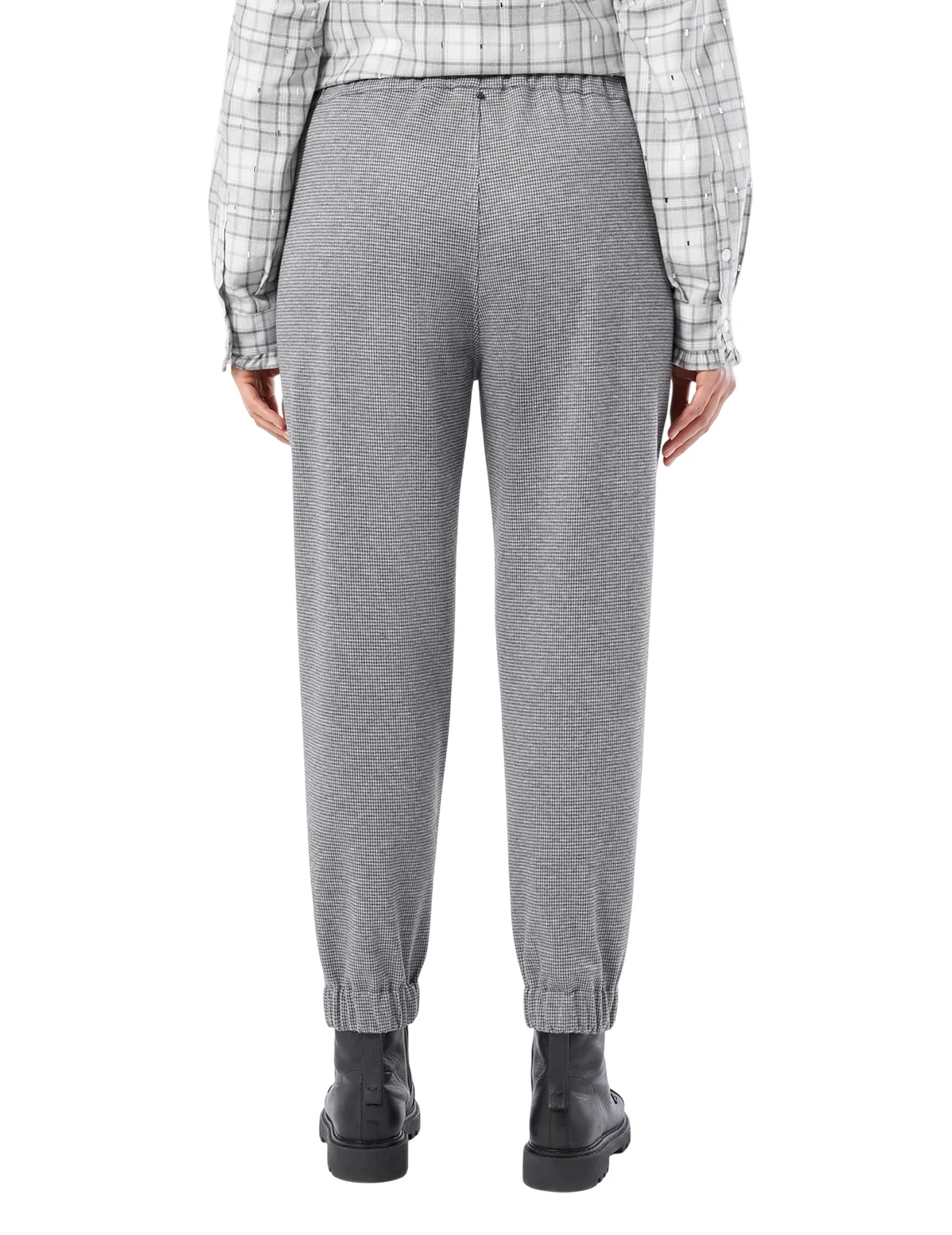 Штани виготовлені з поліаміду, віскози та еластану. Модель виконана в звуженому крої. Має еластичний пояс із куліскою, прорізні кишені та принт у клітинку.