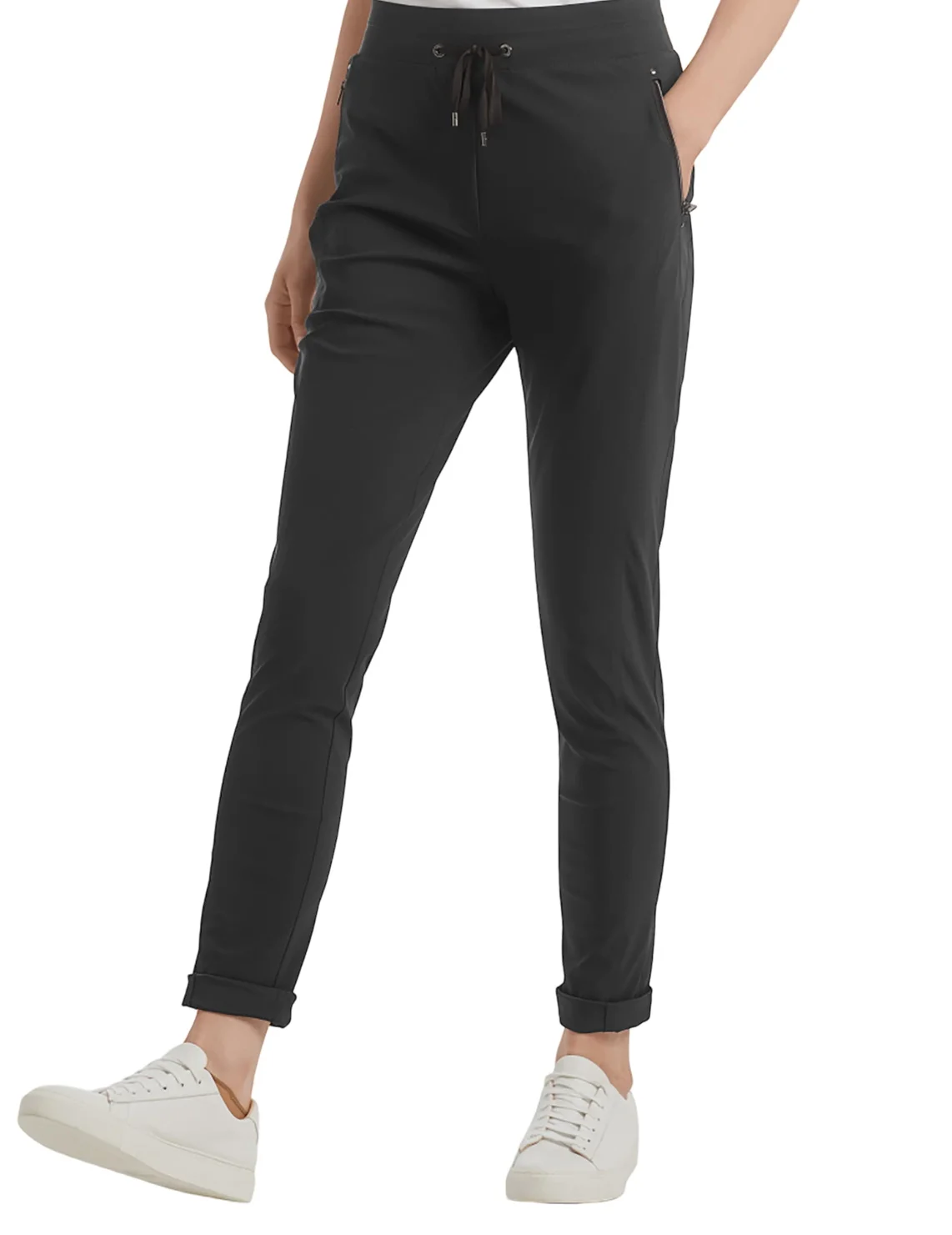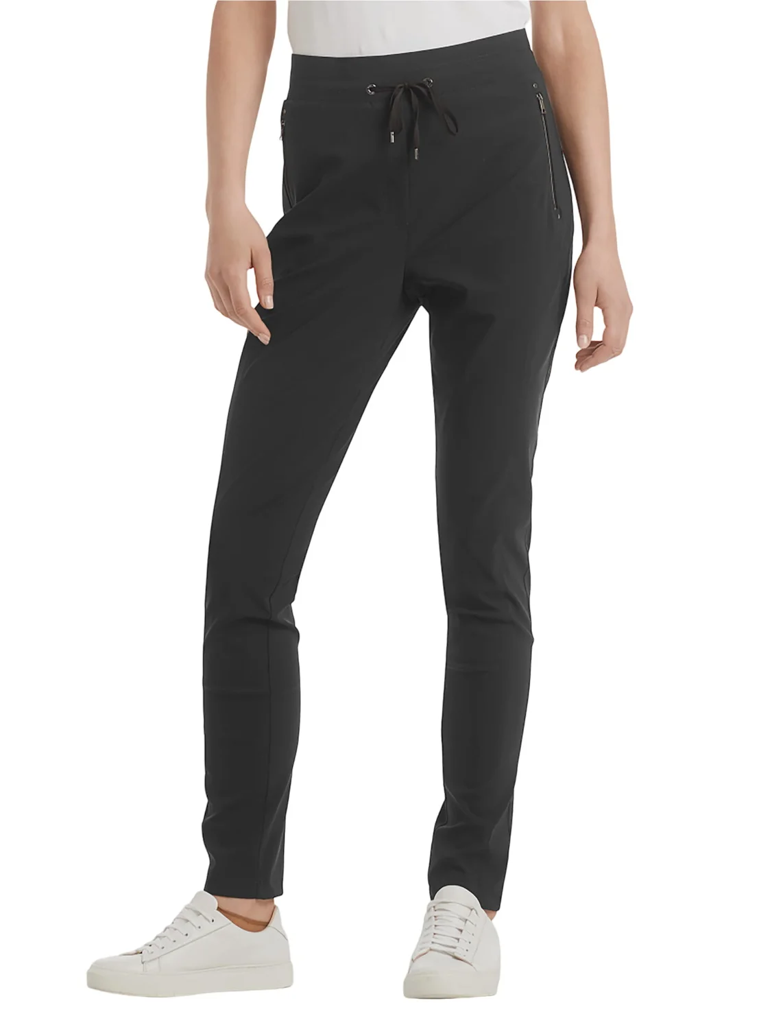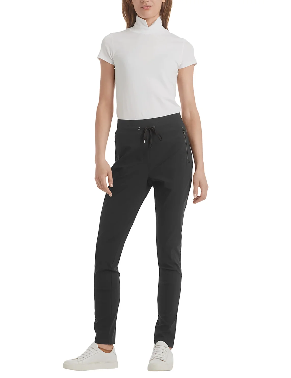 Штани від бренду Marc Cain виготовлені з поліаміду та еластану. Модель виконана в звуженому крої. Має зручний пояс із куліскою, імітований гульфик та прорізні кишені на блискавці.