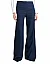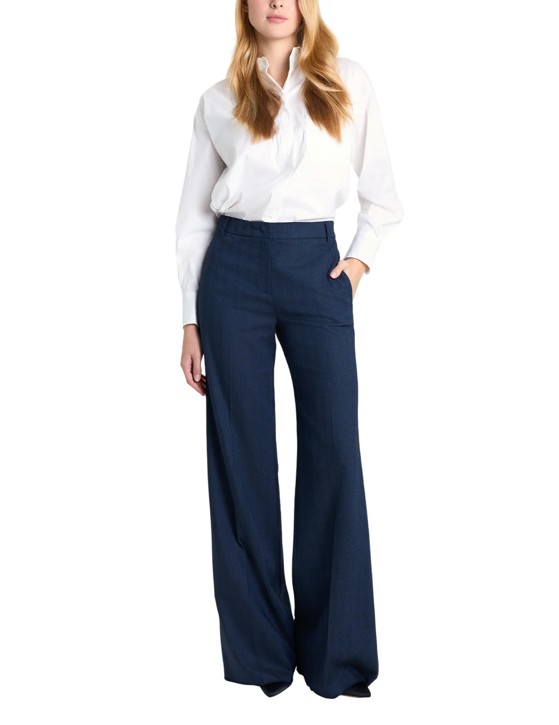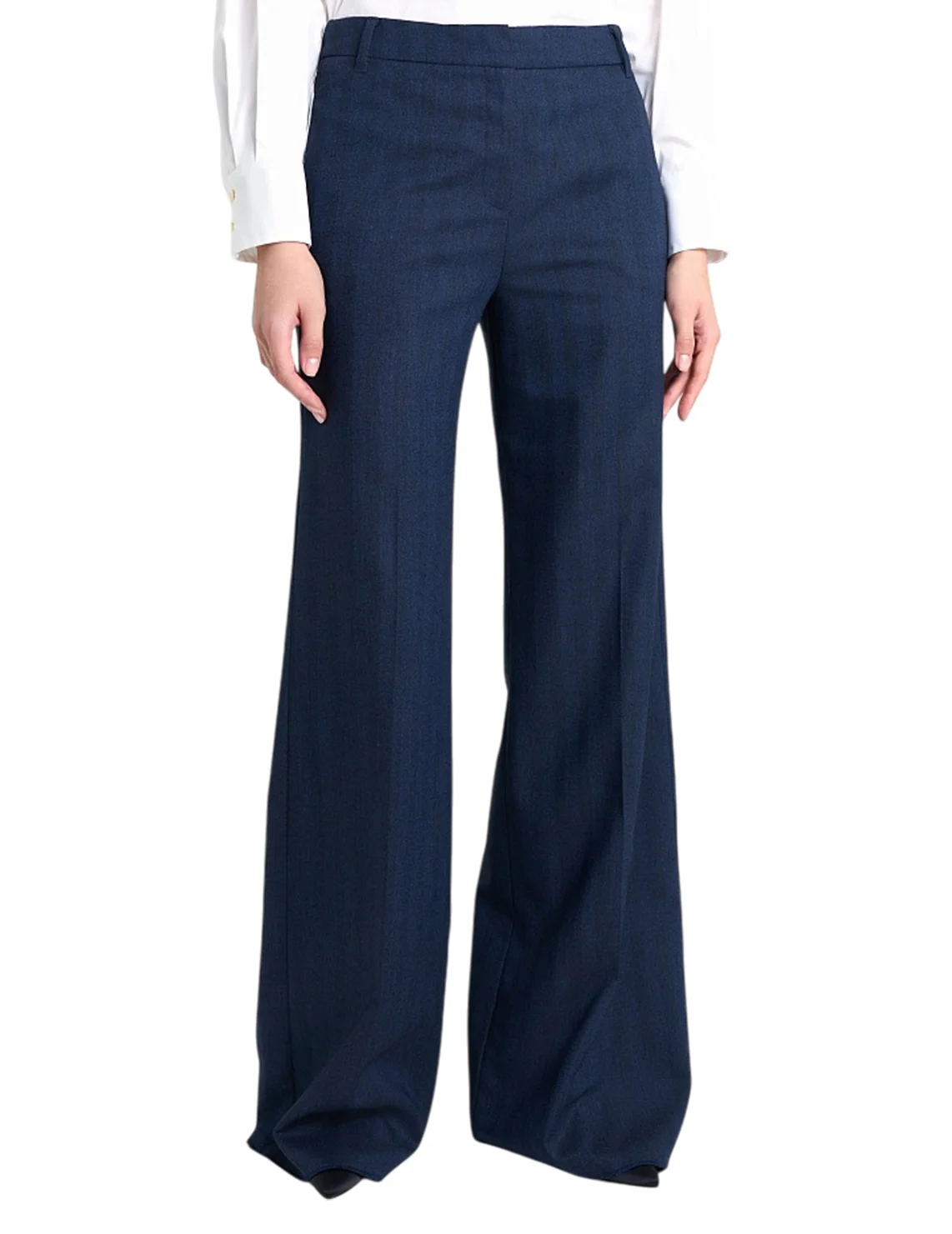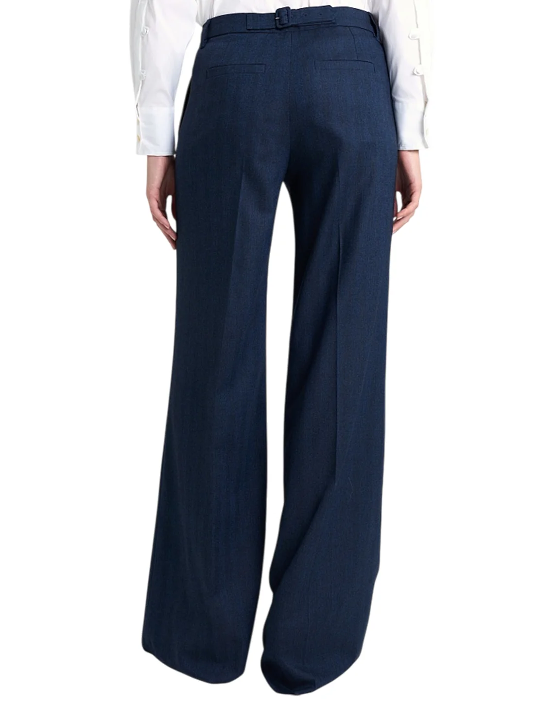 Штани виготовлені з віскози, вовни, поліестеру та еластану. Модель виконана у вільному крої. Має петлі для ременя, приховану застібку-блискавку з гачком, пресовані стрілки та прорізні кишені. Ззаду пояс регулюється ремінцем із пряжкою. Декоровані принтом у смужку.