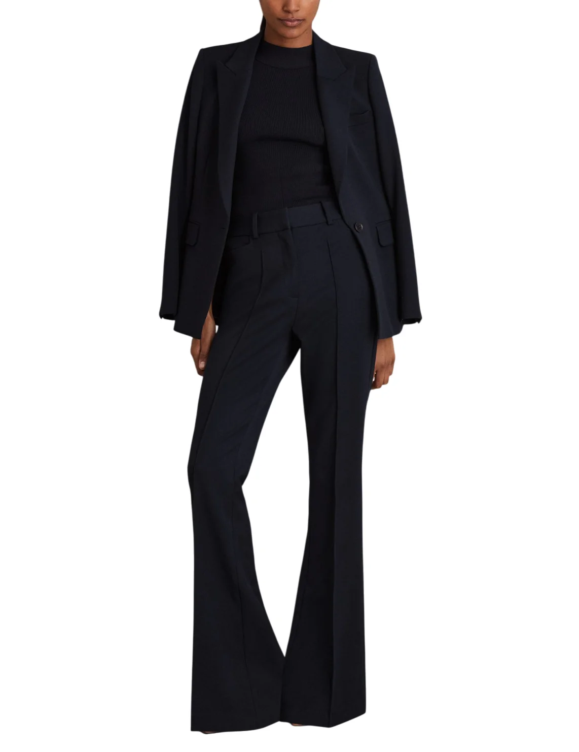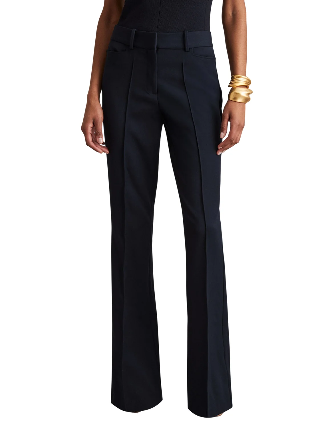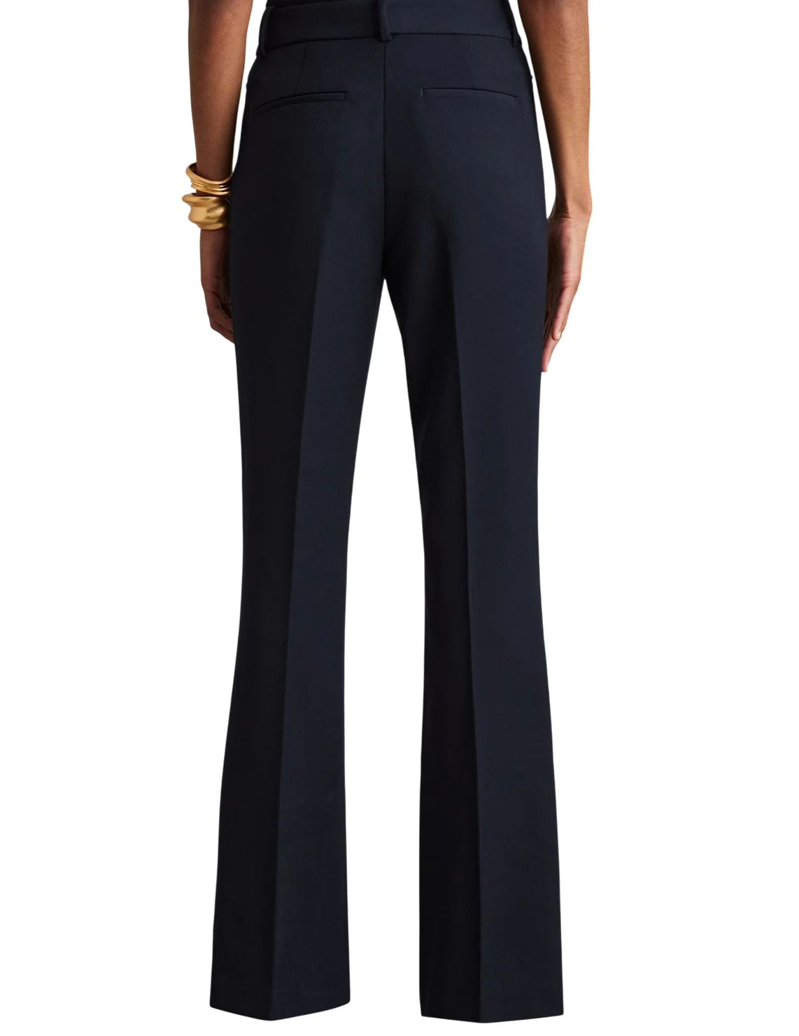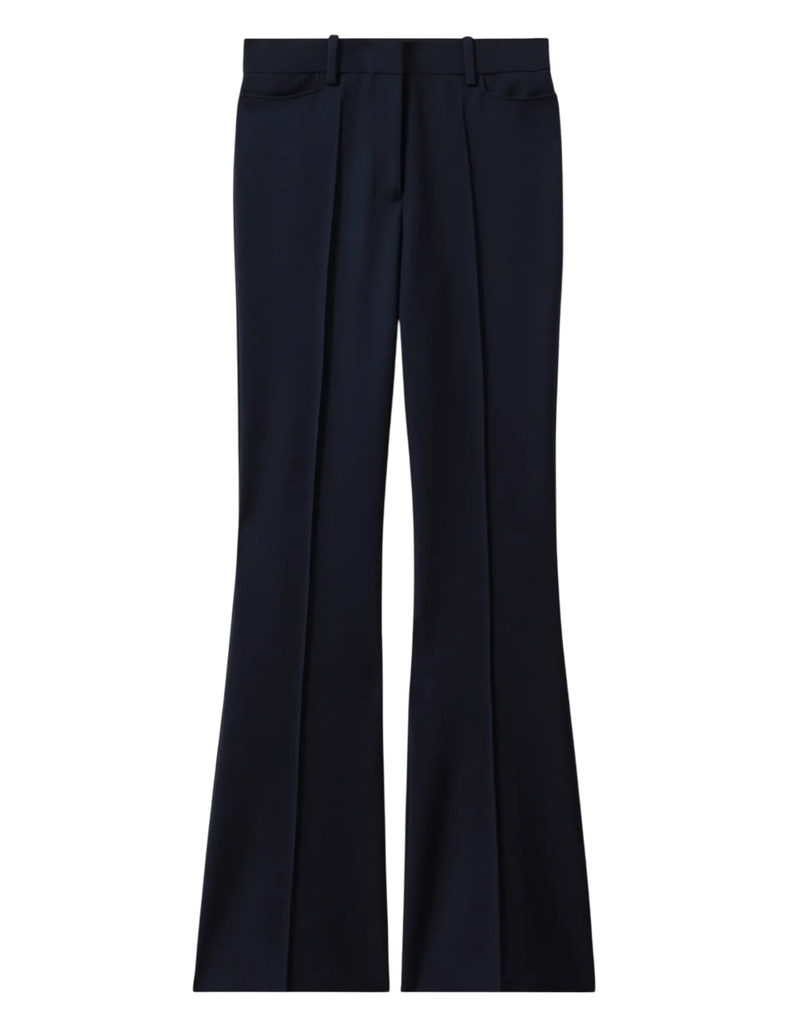 Штани виготовлені з поліестеру, віскози та еластану. Виконані в розкльошеному крої. Мають бічні прорізні кишені, застібку на блискавці з гачком, петлі для ременя та пресовані стрілки.