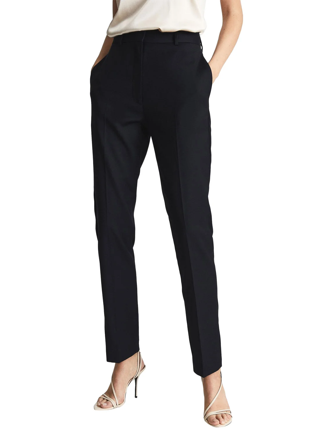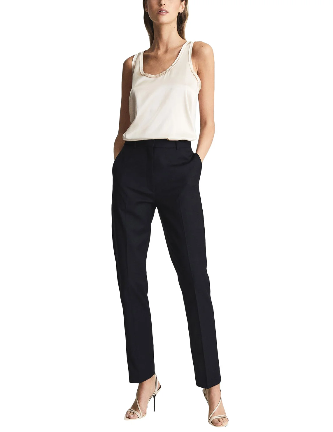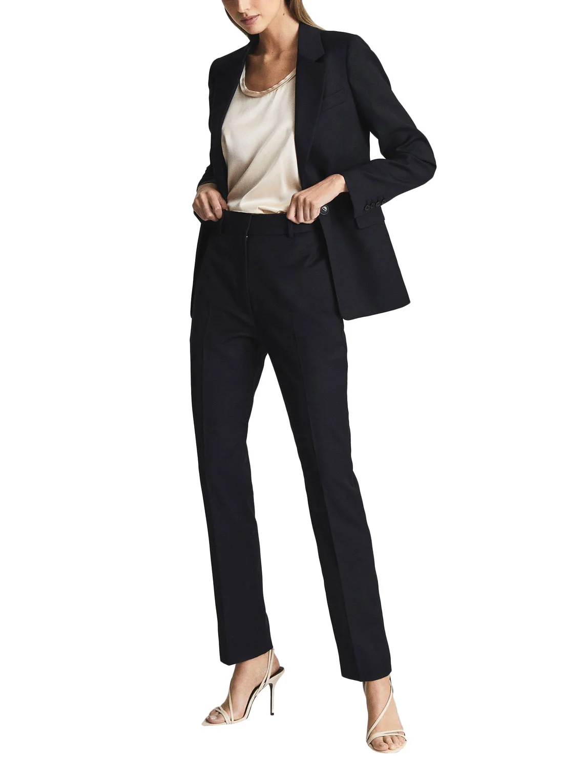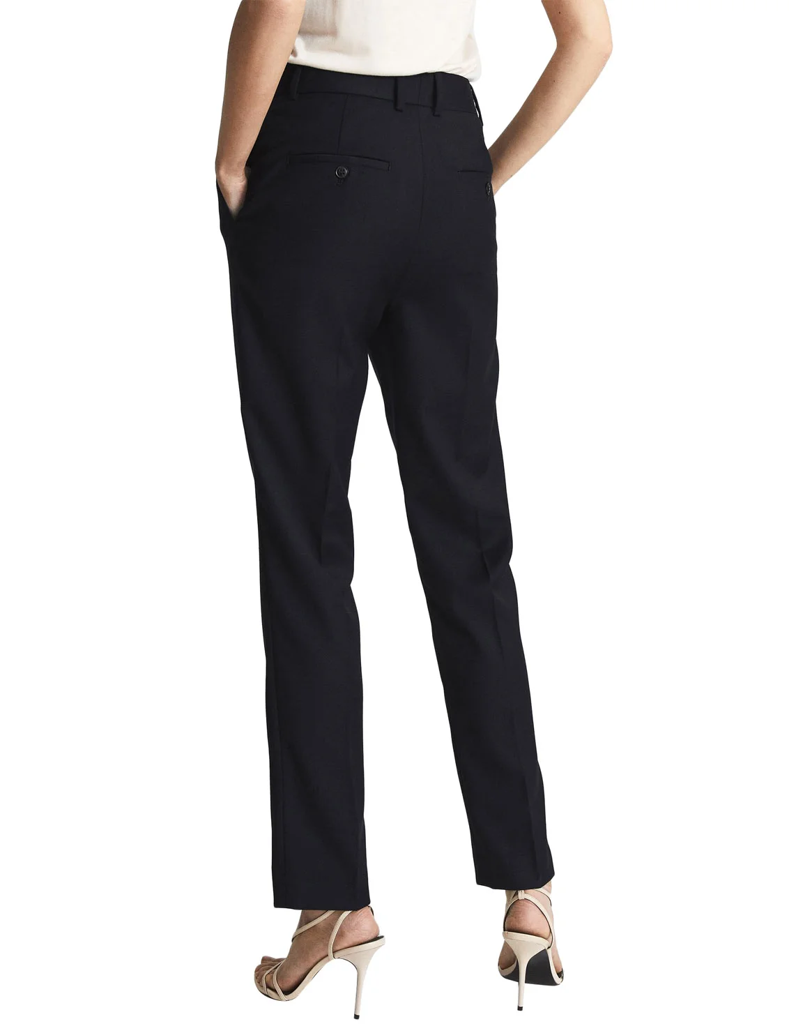 Темно-сині штани Haisley від бренду Reiss виготовлені з вовни, поліестеру та еластану. Модель виконана в звуженому крої. Має шльовки для ременя, приховану застібку-блискавку з ґудзиком, пресовані стрілки та зручні кишені.