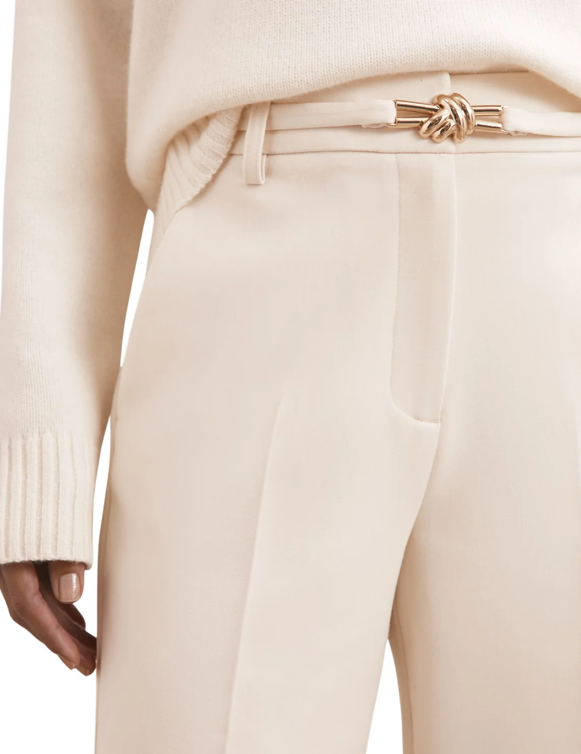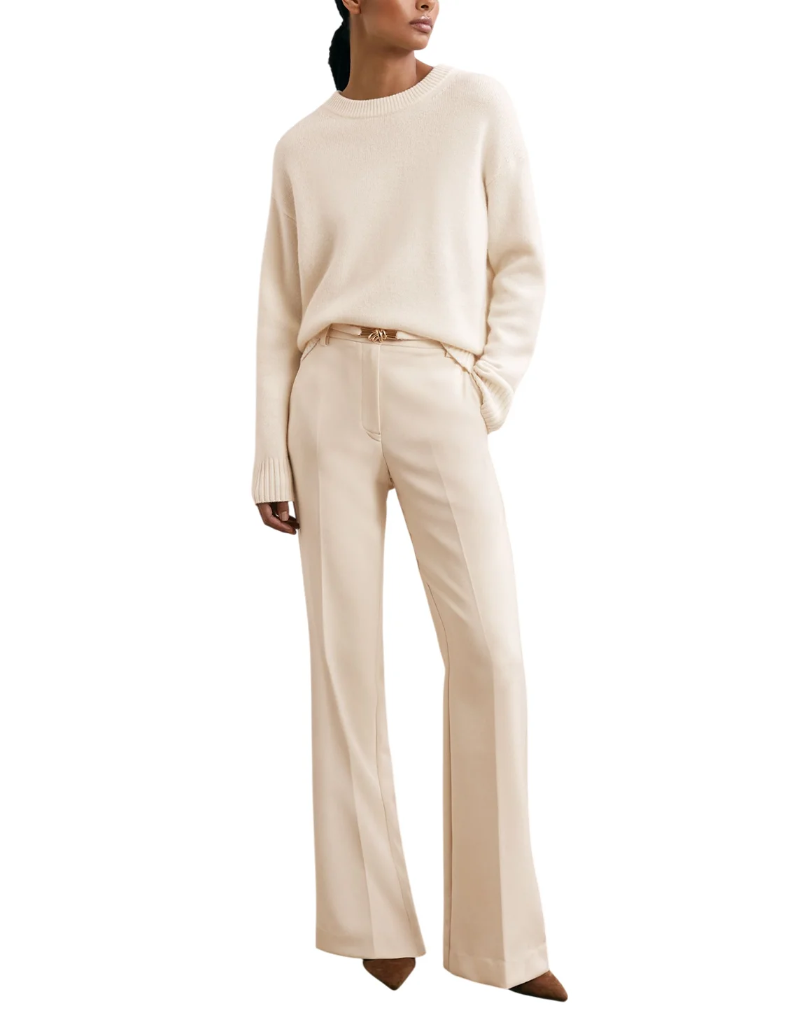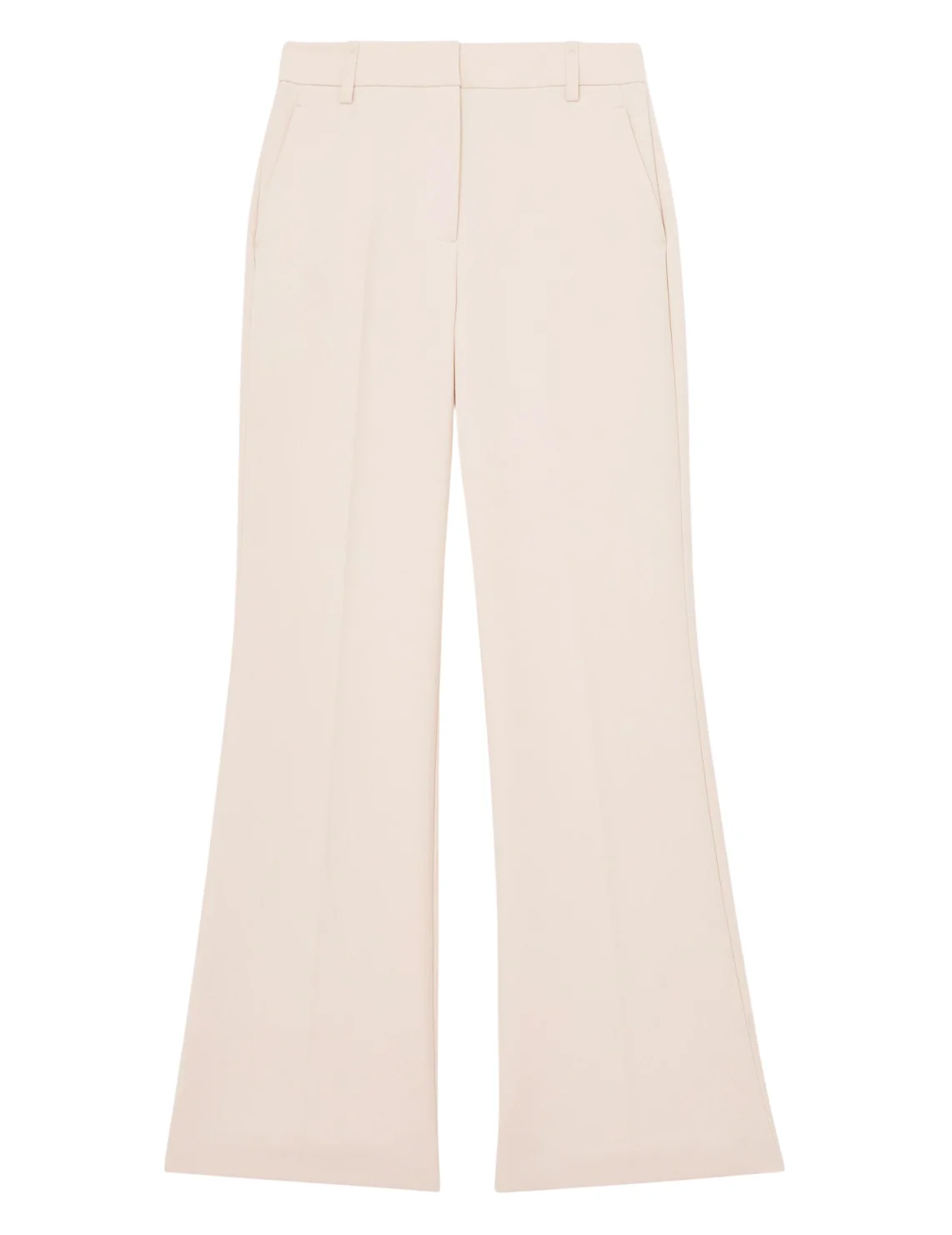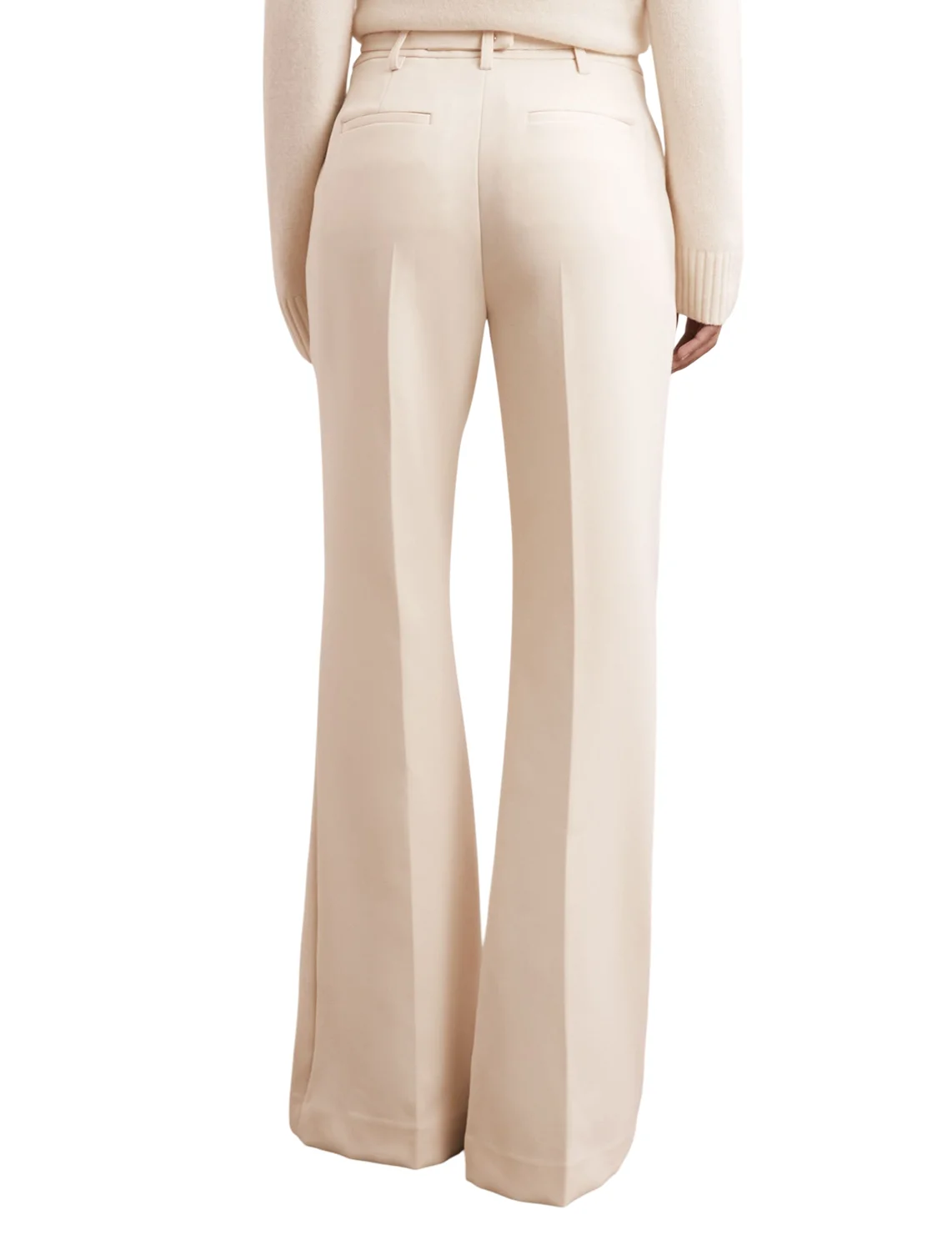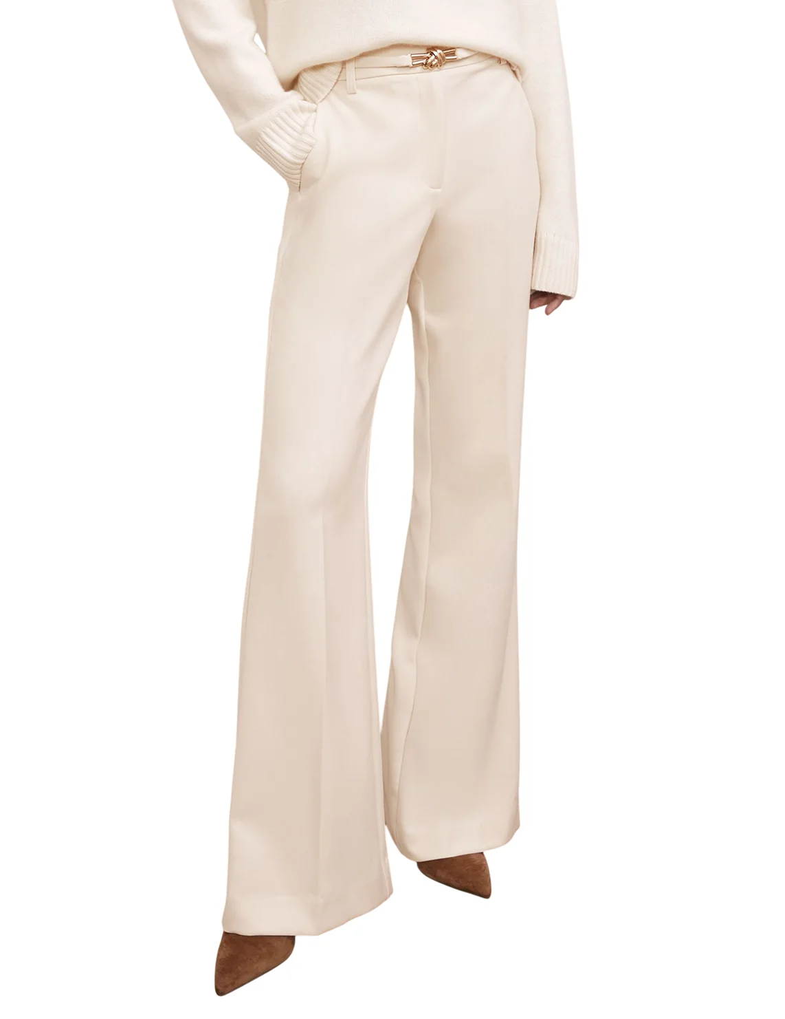 Штани виготовлені з поліестеру, віскози та еластану. Модель виконана в розкльошеному крої. Має шльовки для ременя, приховану застібку-блискавку з гачком, пресовані стрілки та прорізні кишені.