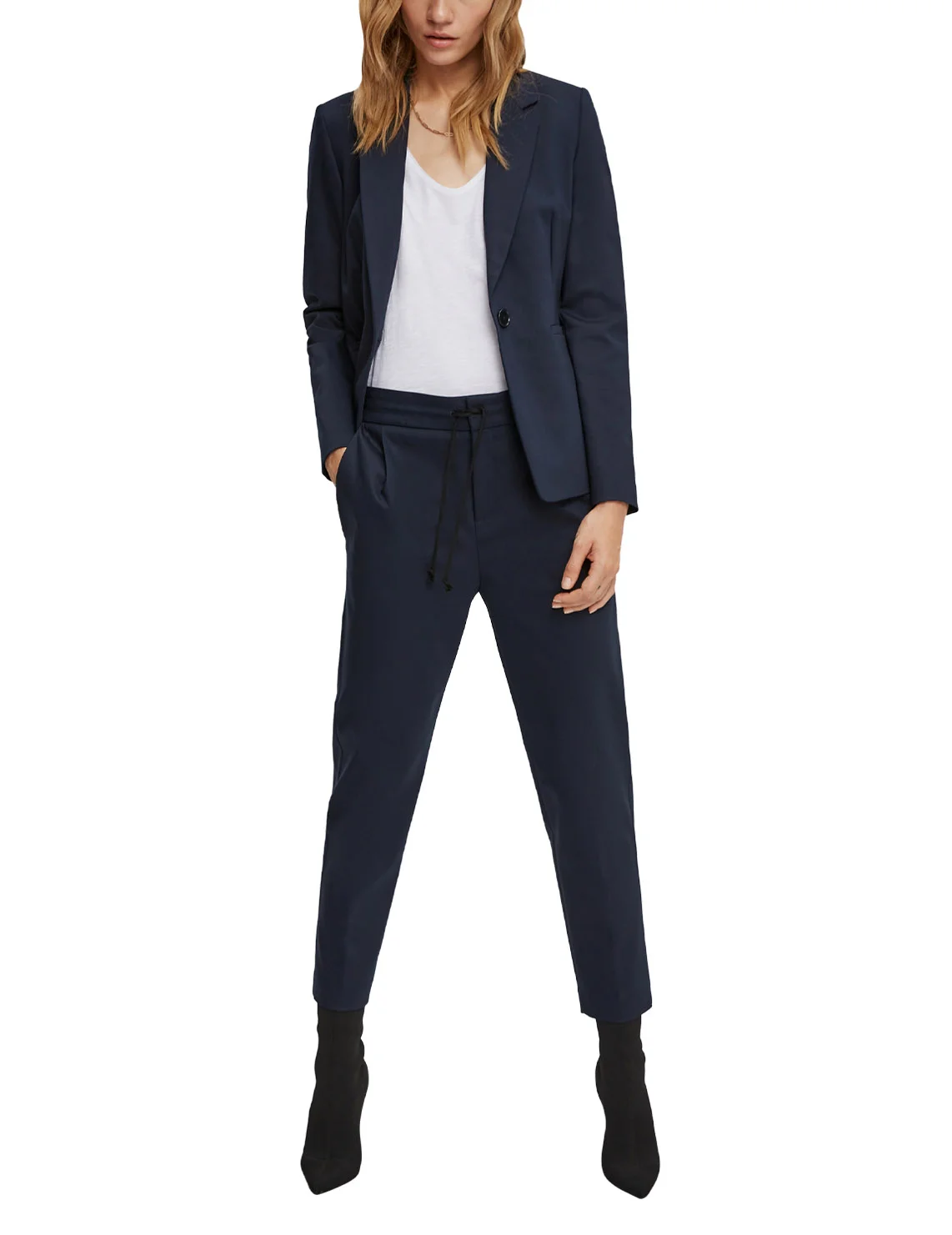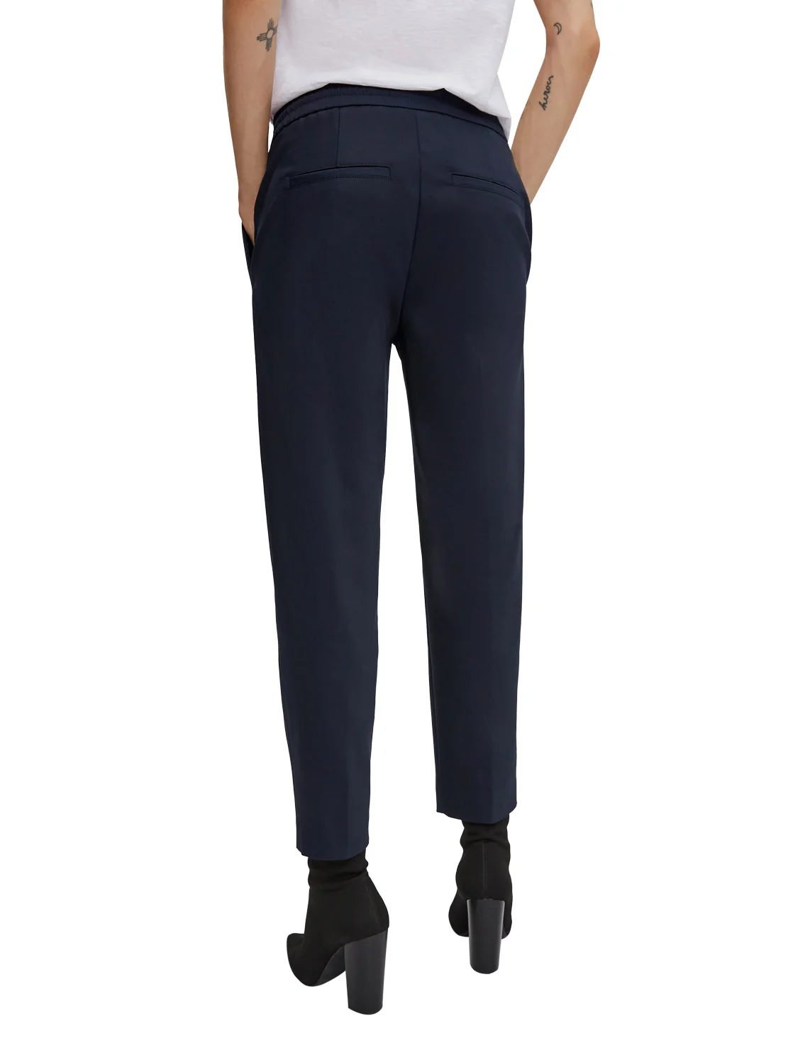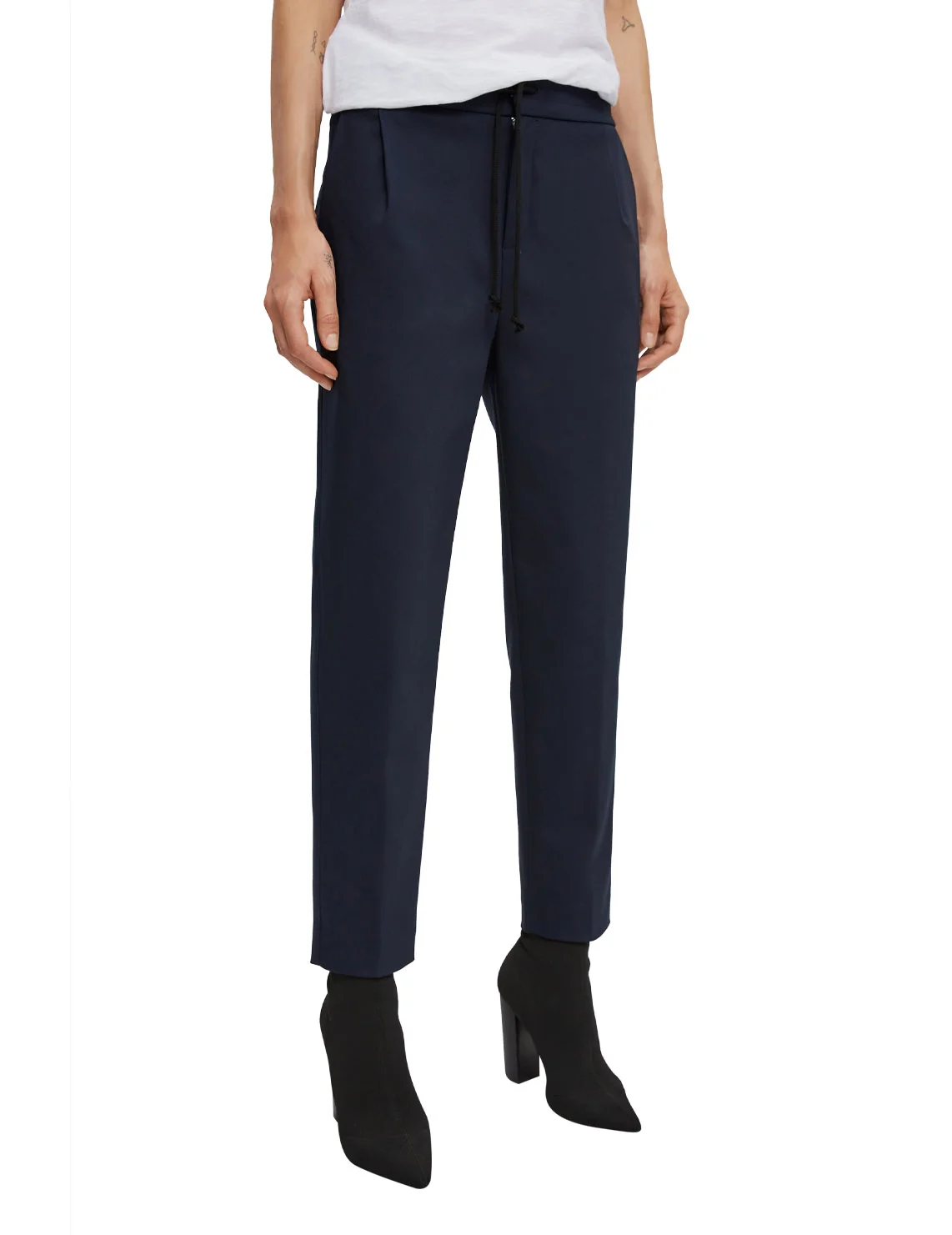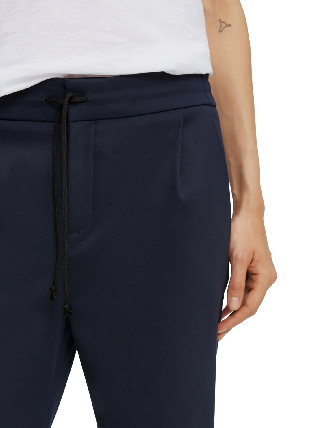 Штани Level темно-синього кольору від бренду Drykorn виготовлені з бавовни та поліаміду. Модель виконана у звуженному крої. Має еластичний пояс з куліскою, прорізні бічні кишені та пресовані стрілки.
