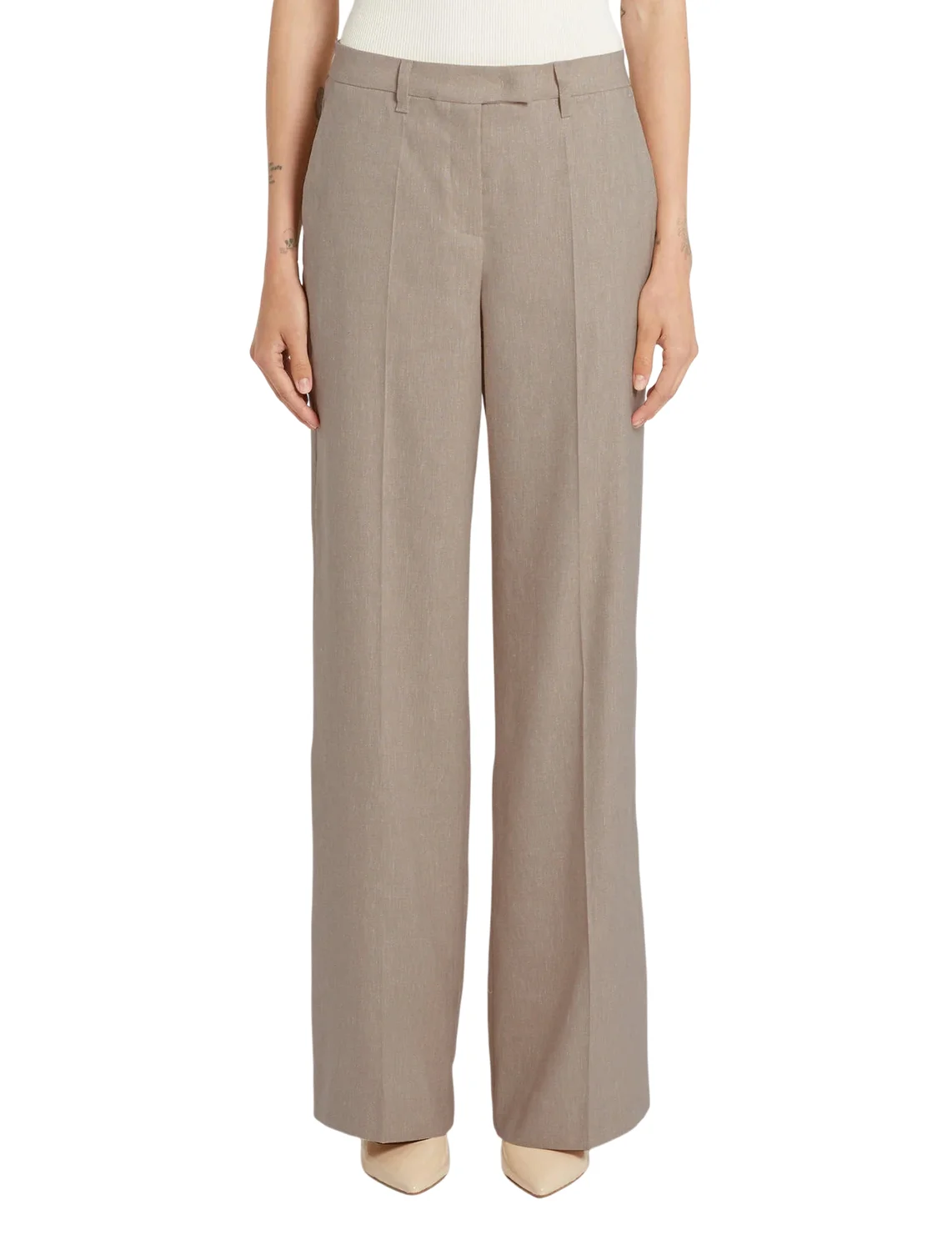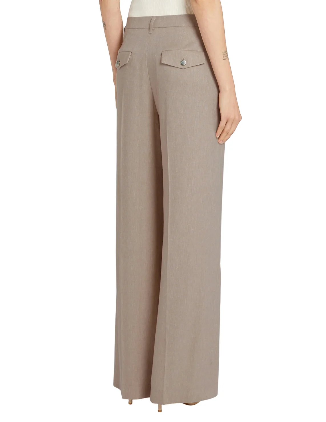 Штани виготовлені з льону, віскози, поліестеру та еластану. Модель виконана у вільному крої. Має петлі для ременя, приховану застібку-блискавку з гачком, пресовані стрілки, бічні прорізні кишені та задні кишені з клапанами.