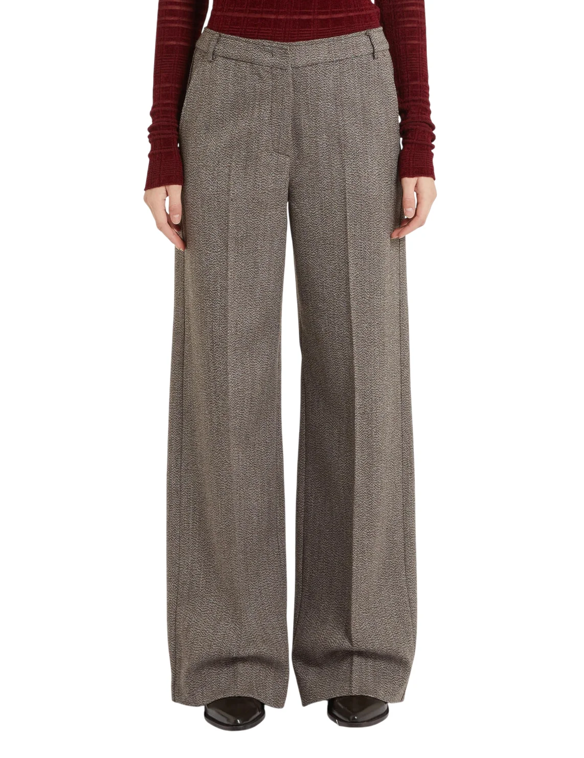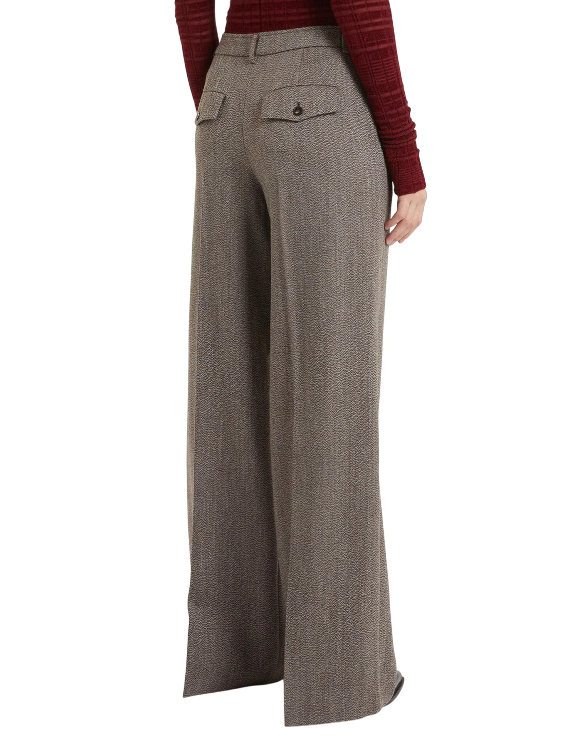 Штани виготовлені зі 100% вовни, підкладка з ацетату та поліестеру. Модель виконана у вільному крої. Має петлі для ременя, потаємну застібку-блискавку з гачком, пресовані стрілки, дві прорізні бокові кишені та два декоративні клапани ззаду.
