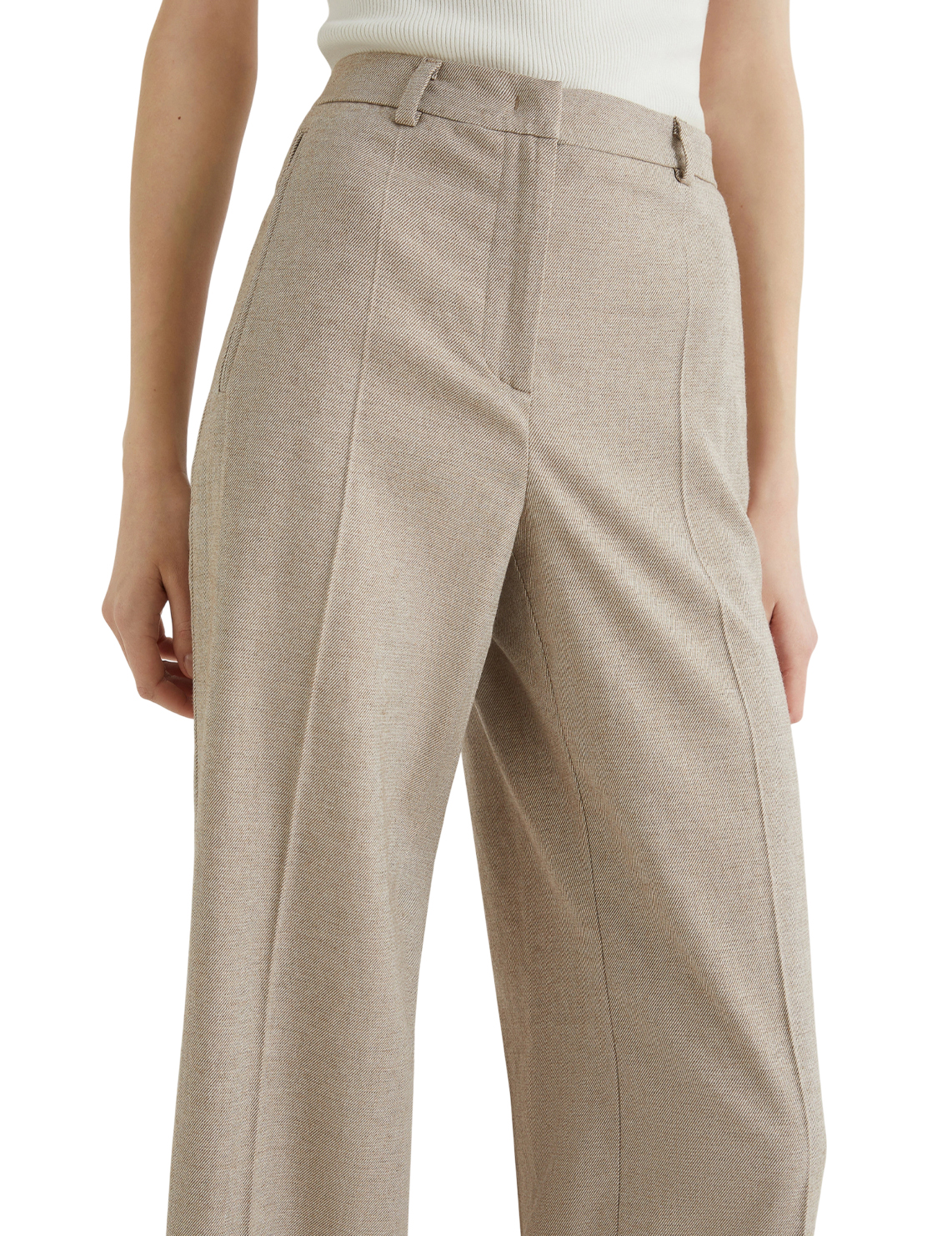 Штани виготовлені з поліестеру, бавовни, вовни, віскози, поліаміду та еластану. Модель виконана у вільному крої. Має шлевки для ременя, потаємну застібку-блискавку з гачком, пресовані стрілки, дві бокові та дві задні прорізні кишені.