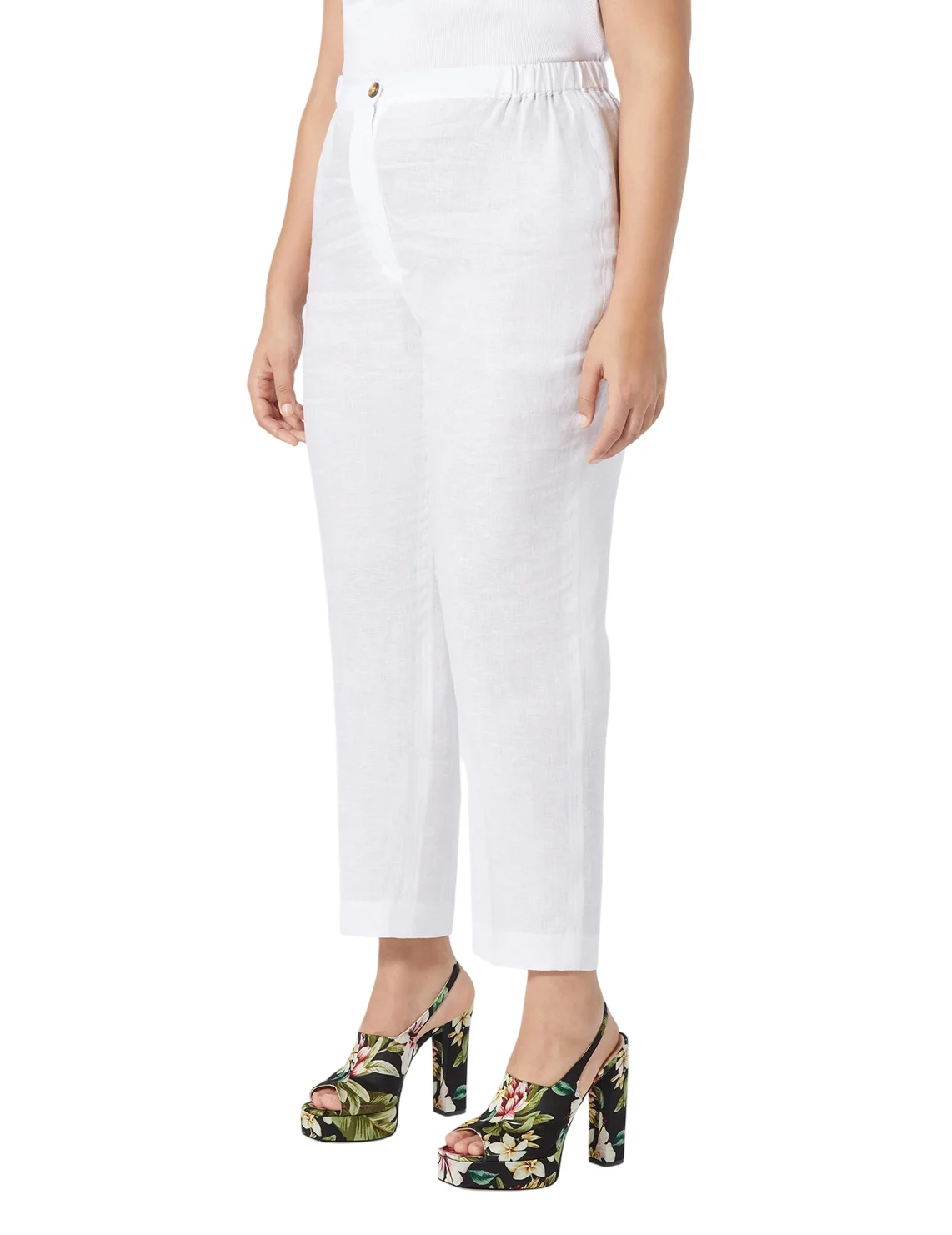 Штани виготовлені зі 100% натурального льону. Модель виконана в звуженому крої. Має приховану застібку-блискавку з ґудзиком, пресовані стрілки та еластичний пояс.