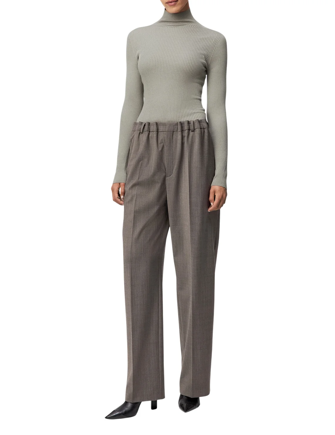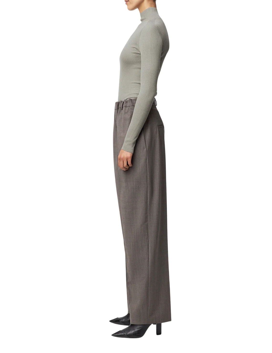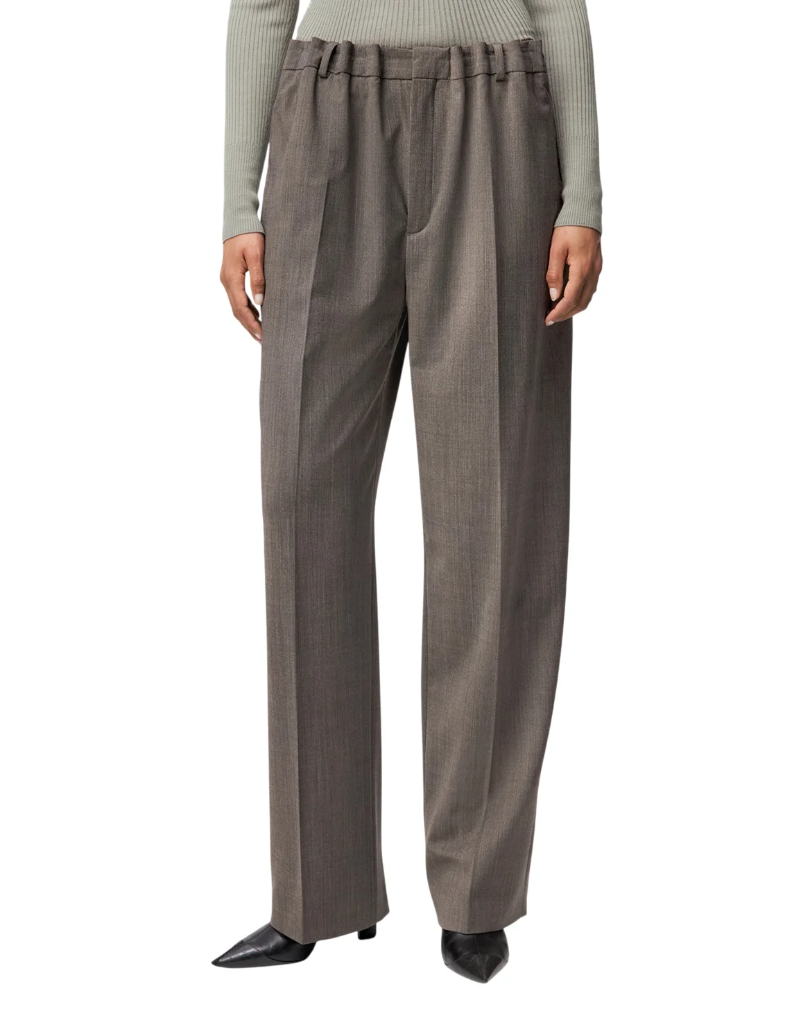 Штани виготовлені з поліестеру, вовни та еластану. Модель виконана у вільному крої. Має петлі для ременя, пресовані стрілки, декоративні складки, приховану застібку-блискавку з гачком і прорізні кишені.