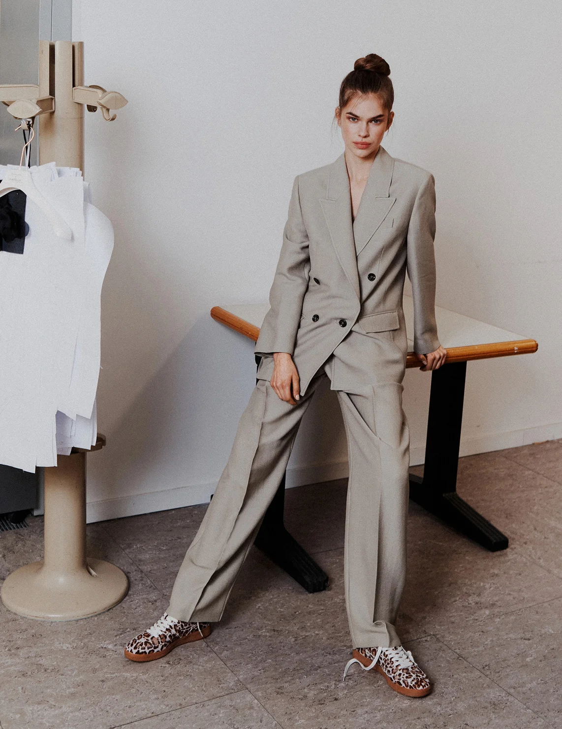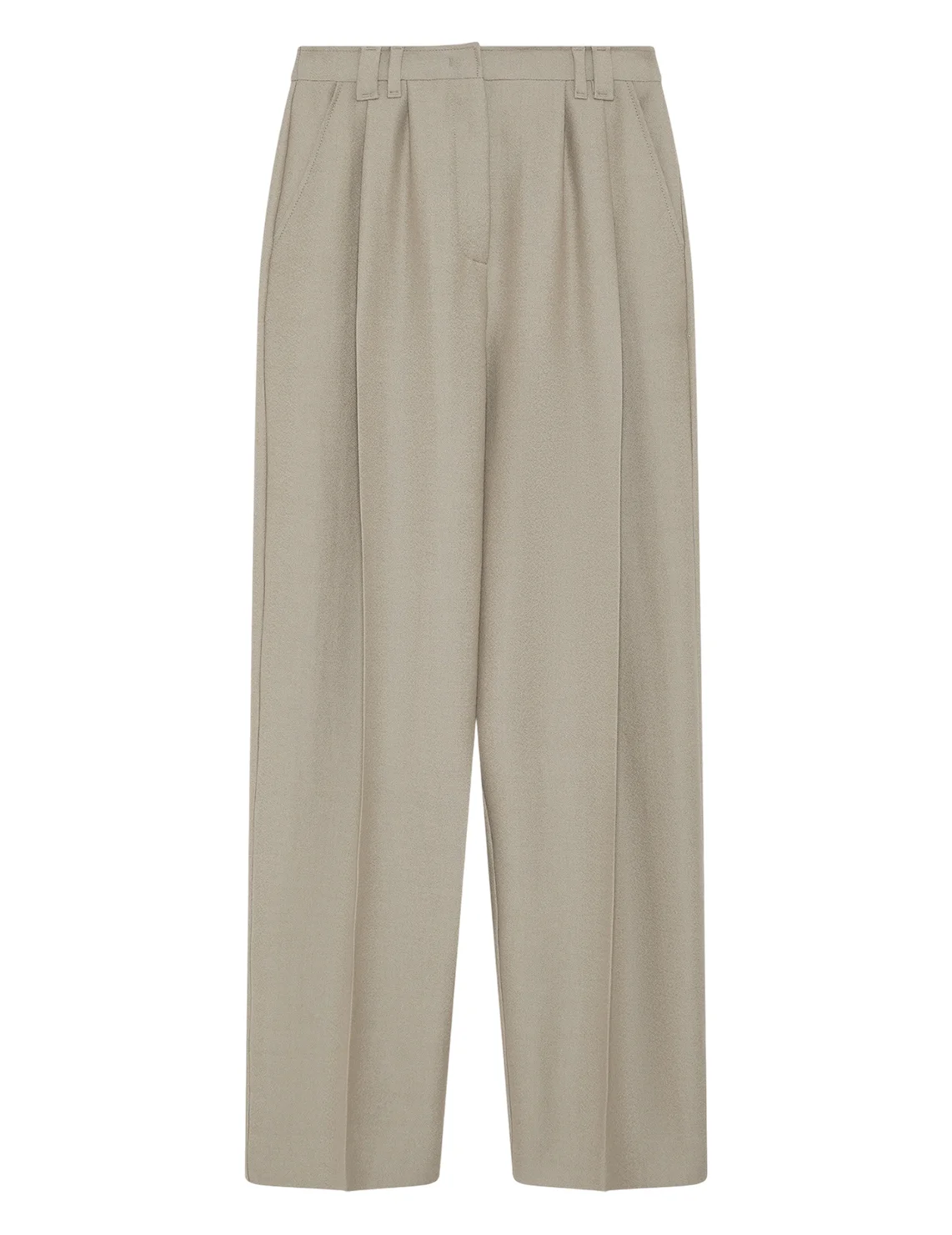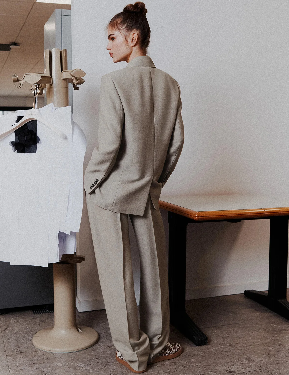 Штани виготовлені з вовни та віскози. Модель виконана у вільному крої. Має шльовки для ременя, приховану застібку-блискавку з гачком, пресовані стрілки та прорізні кишені.